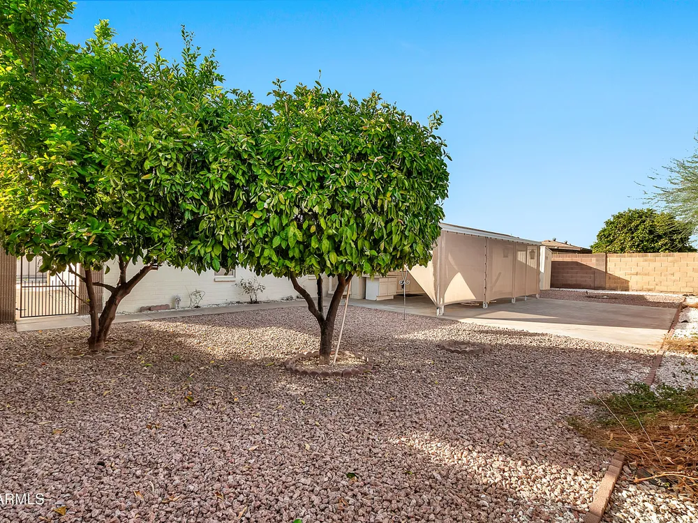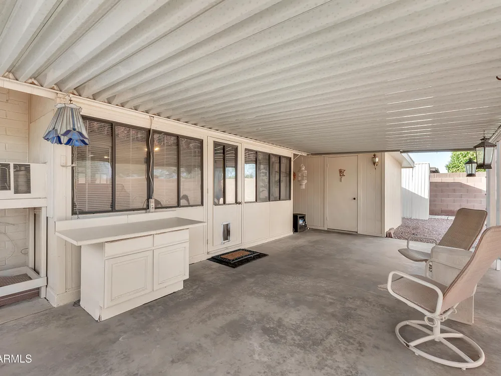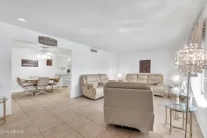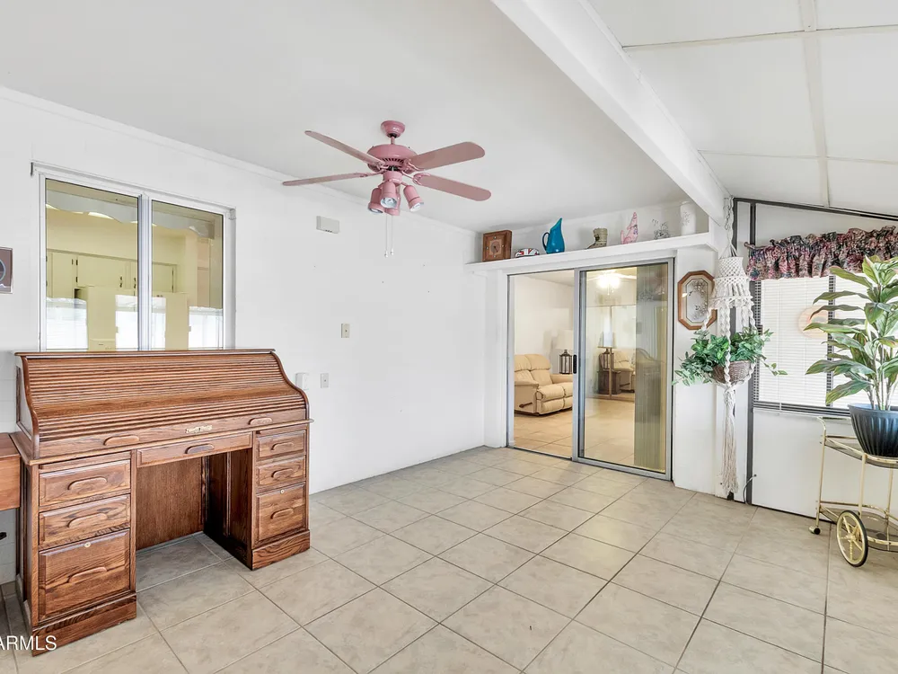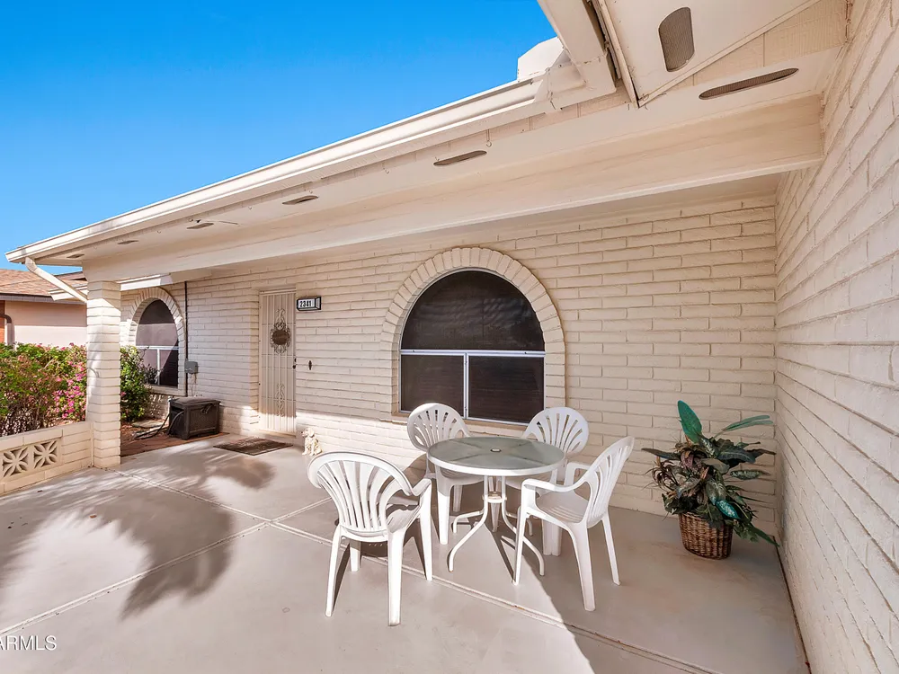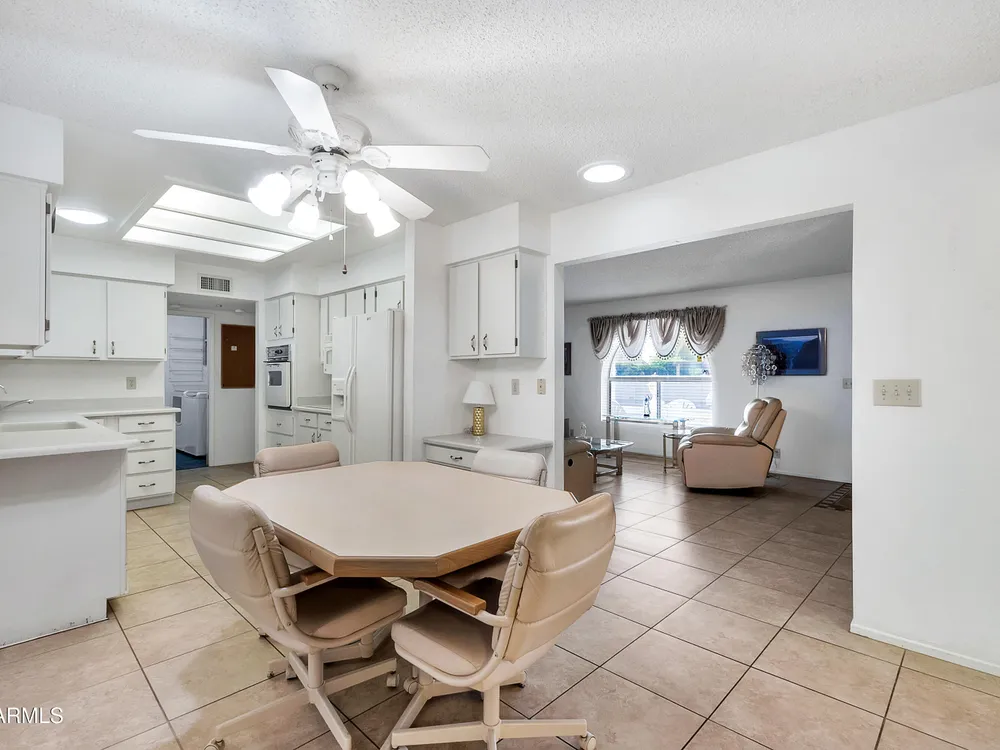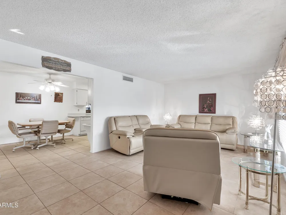 Welcome to this charming and well maintained 2 bed, 2 bath home nestled in a vibrant, highly sought-after 55+ active adult community. While the home retains its original charm, it has been thoughtfully maintained and features an upgraded tile floor throughout for easy care and comfort. Enjoy Arizona's beautiful weather year-round from the bright and airy Arizona room, or step outside to your private backyard oasis, complete with an oversized covered patio and mature citrus trees - perfect for relaxing or entertaining guests. This community is packed with amenities to support an active lifestyle, including multiple pools, a golf course, pickleball and tennis courts, shuffleboard, a fitness center, on-site restaurant, & countless clubs, social activities & more! Whether you're looking for recreation or relaxation, there's always something to enjoy. A fantastic opportunity to personalize a solid home in a vibrant, friendly neighborhood! New AC 2020 / New Water Heater 2019 / Approx 19 years on a 30 year roof.