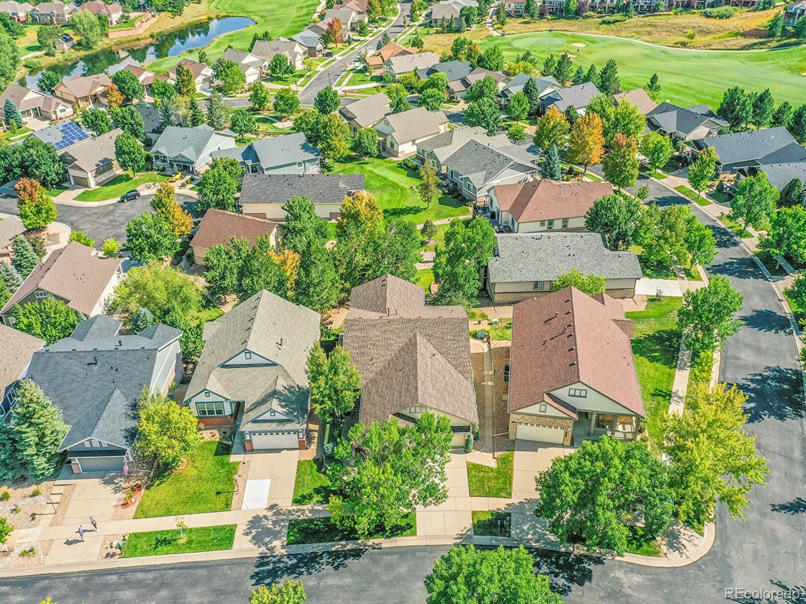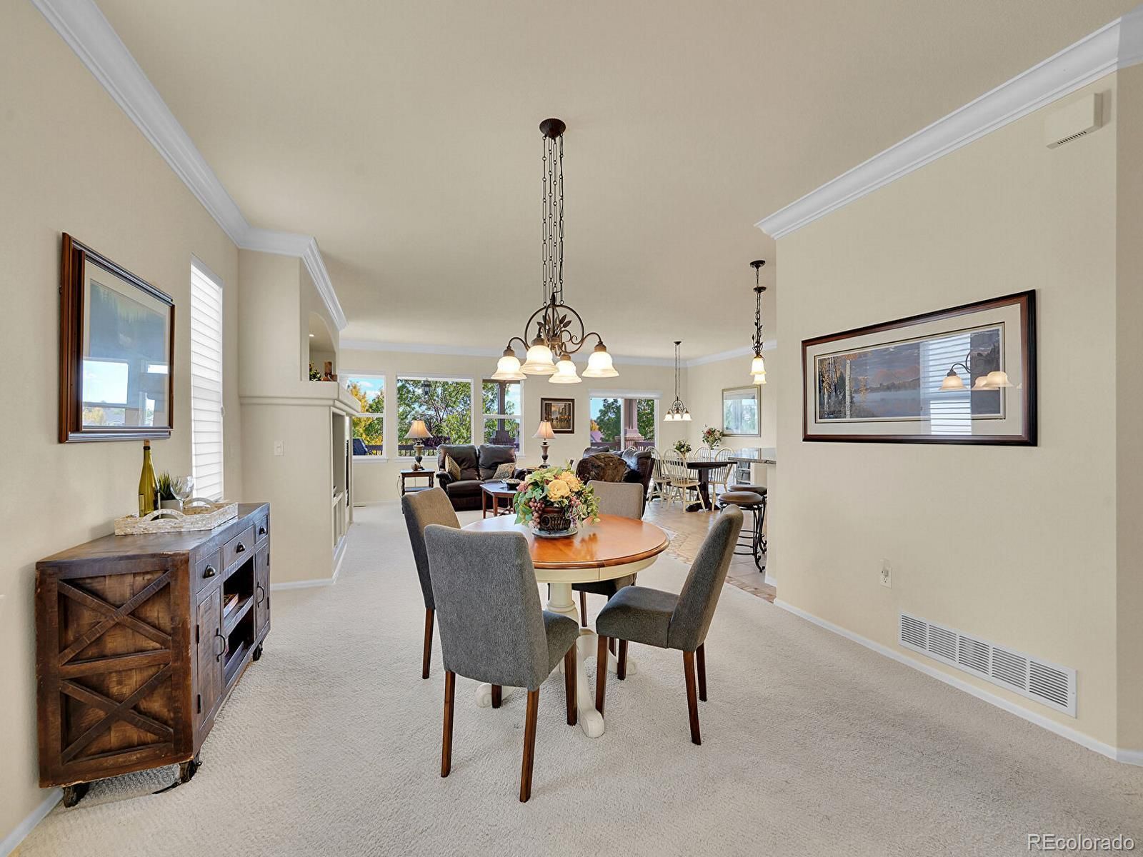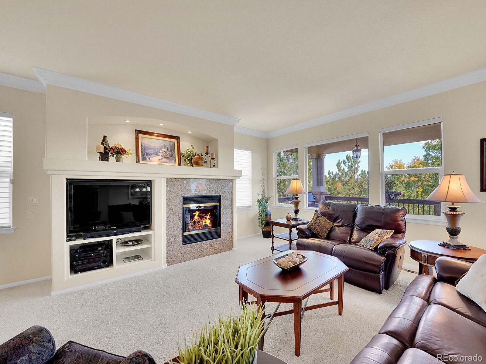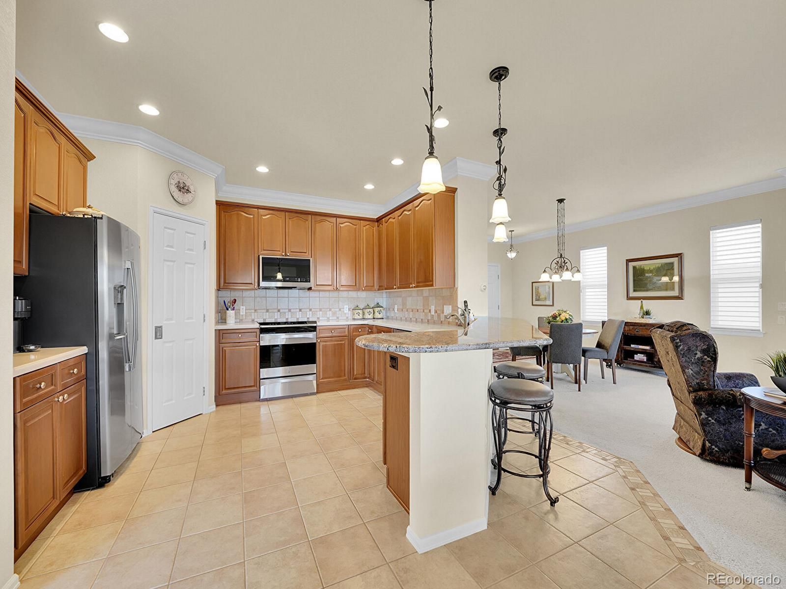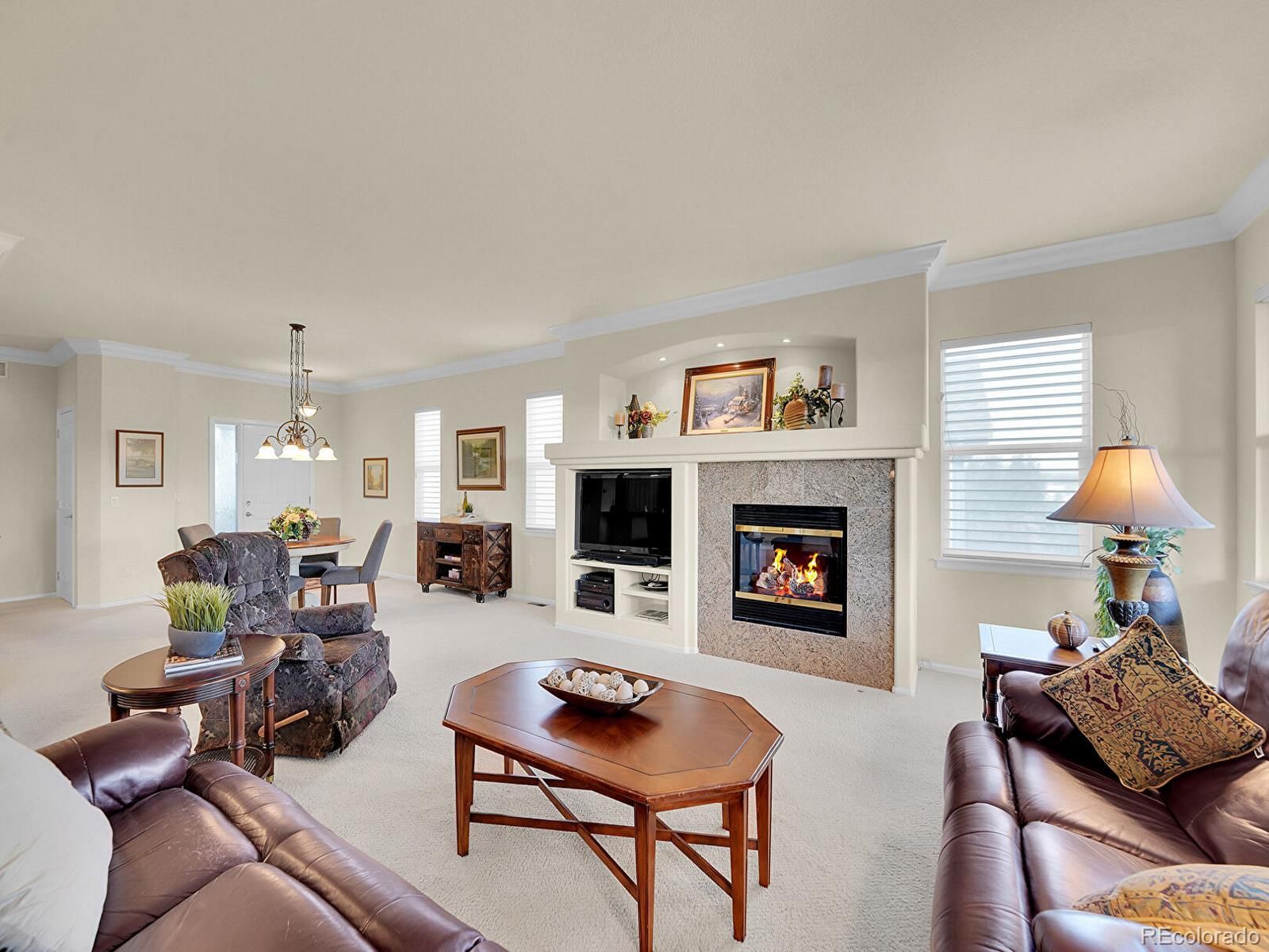 Bright and airy single-family ranch in sought-after Heritage Eagle Bend! Designed for main-level living and entertaining, this 4-bed, 3-bath home boasts tranquil greenspace views surrounded by evergreens, a brand-new roof, an oversized 2-car garage, and a finished walkout basement. Lush garden beds and a covered patio lead into the open main level, accented by crown molding and bright windows. A formal dining area flows seamlessly into the living room, an expansive space for entertaining anchored by a gas fireplace and warm built-ins. Boasting rich cherry cabinetry, stainless appliances, a pantry, and a peninsula with seating, the open kitchen keeps the chef in the action. The dining room opens to the covered upper deck through sliding glass doors, perfect for barbecues or morning coffee. Unwind in the main-level primary suite, featuring a tray ceiling, walk-in closet, and five-piece en suite bath with soaking tub, stand-up shower, and seated vanity. A comfortable second bedroom with a walk-in closet connects to a dual-access en suite full bath, while a third non-conforming bedroom is brightened by wall-to-wall windows and French doors, perfect for a guest room or home office. Convenient main-level laundry with extra storage! The walkout basement features a sprawling rec room with a kitchenette, built-in bookcases, gas fireplace, and sliding glass doors leading to the covered patio. A basement bedroom, dual-access ¾ bath, and 2 bonus rooms create privacy for multigenerational living or guests. Enjoy peaceful greenspace on the covered upper deck or lower patio, perfect for dining al fresco. Embrace the Heritage Eagle Bend lifestyle! This gated 45+ community is built around an 18-hole golf course, indoor/outdoor pools, fitness center, restaurant, and activities like pickleball, tennis, bocce, and billiards. Located just minutes from Southlands Mall, Aurora Reservoir, and Parker Main Street, with easy access to C-470 and DIA.