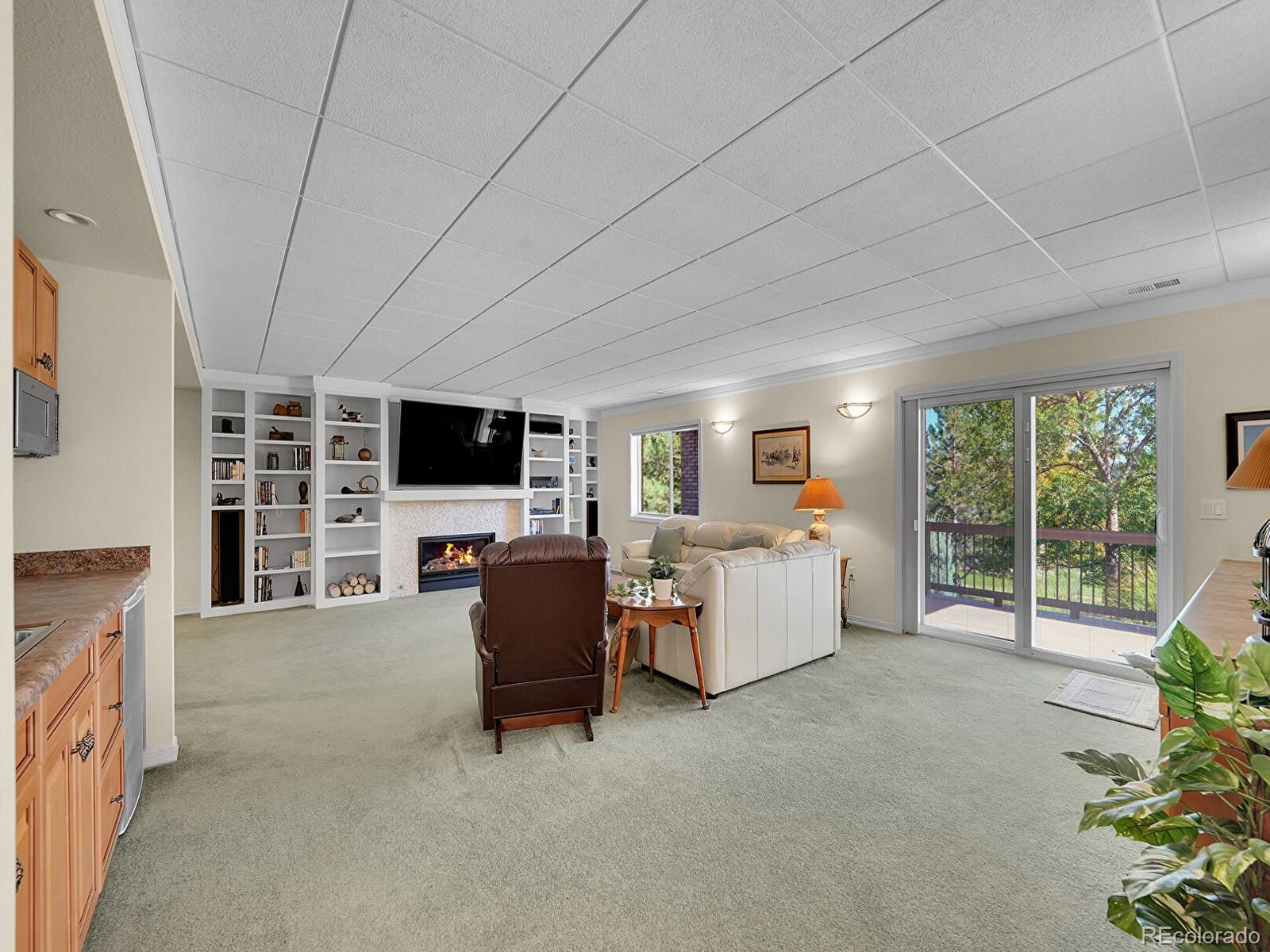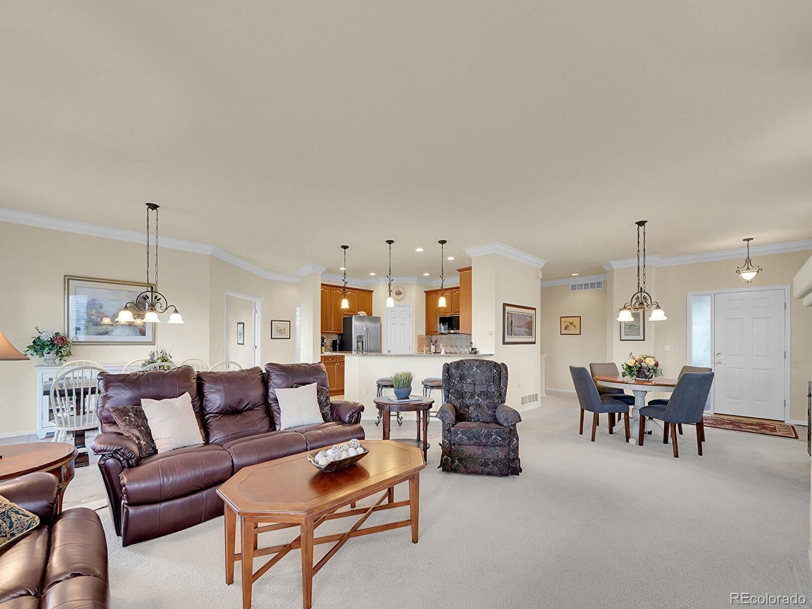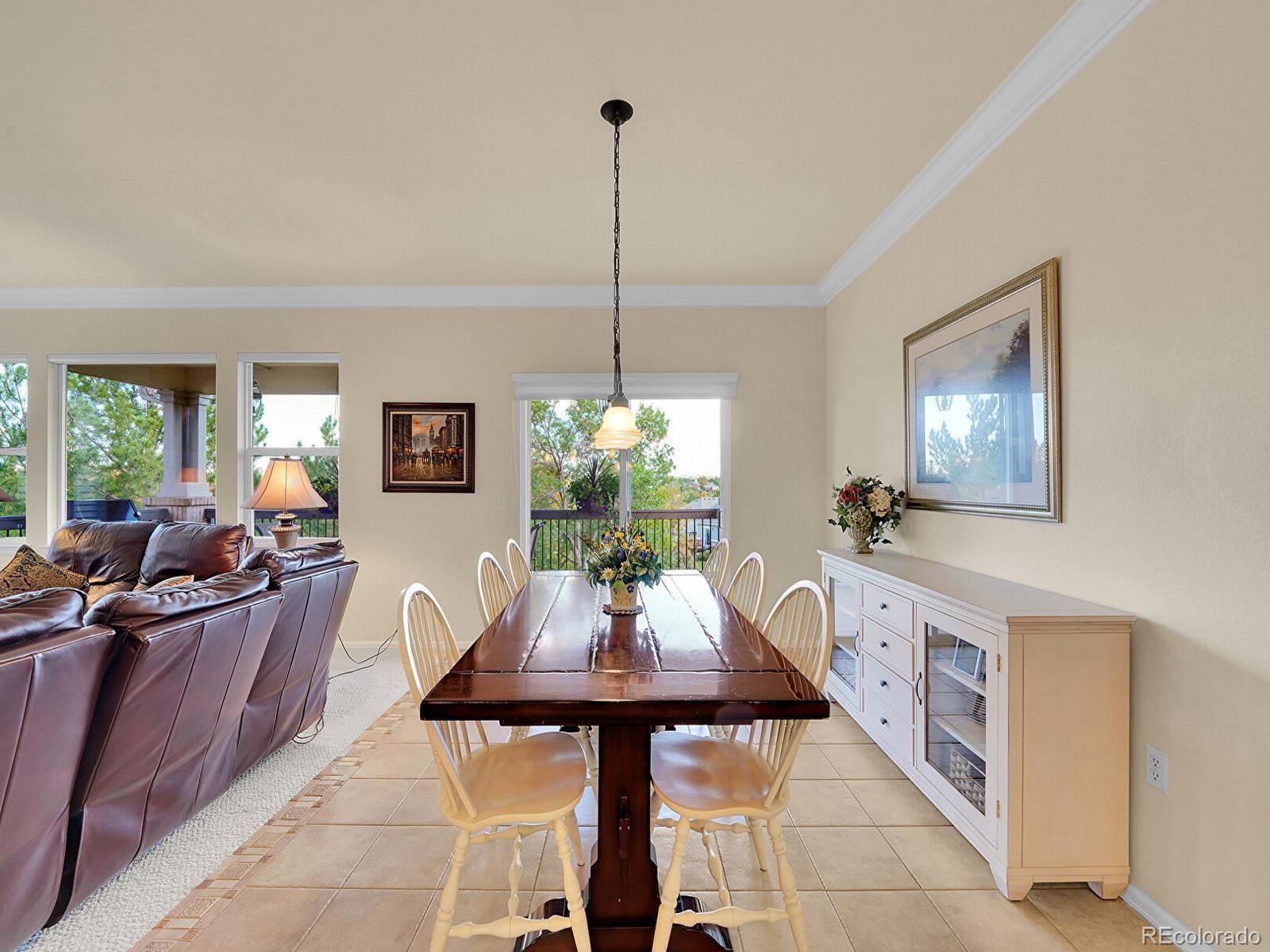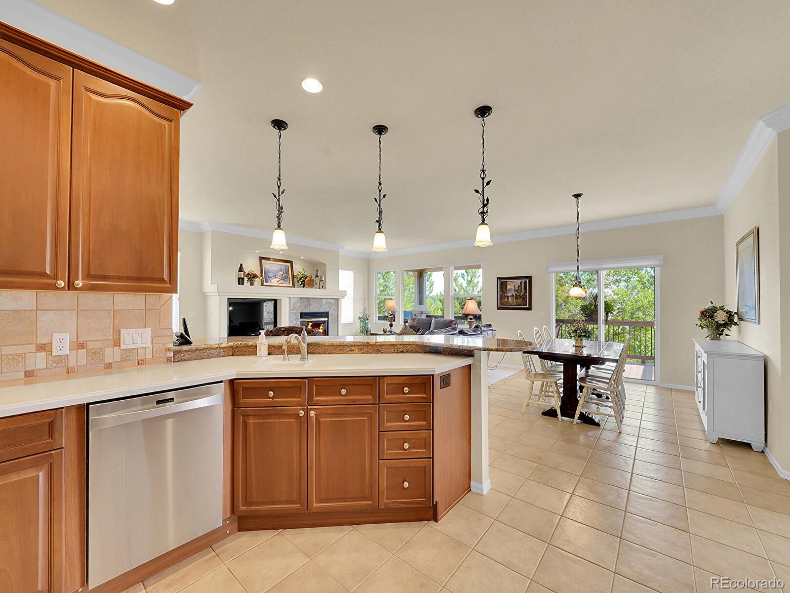 Bright and airy single-family ranch in sought-after Heritage Eagle Bend! Designed for main-level living and entertaining, this 4-bed, 3-bath home boasts tranquil greenspace views surrounded by evergreens, a brand-new roof, an oversized 2-car garage, and a finished walkout basement. Lush garden beds and a covered patio lead into the open main level, accented by crown molding and bright windows. A formal dining area flows seamlessly into the living room, an expansive space for entertaining anchored by a gas fireplace and warm built-ins. Boasting rich cherry cabinetry, stainless appliances, a pantry, and a peninsula with seating, the open kitchen keeps the chef in the action. The dining room opens to the covered upper deck through sliding glass doors, perfect for barbecues or morning coffee. Unwind in the main-level primary suite, featuring a tray ceiling, walk-in closet, and five-piece en suite bath with soaking tub, stand-up shower, and seated vanity. A comfortable second bedroom with a walk-in closet connects to a dual-access en suite full bath, while a third non-conforming bedroom is brightened by wall-to-wall windows and French doors, perfect for a guest room or home office. Convenient main-level laundry with extra storage! The walkout basement features a sprawling rec room with a kitchenette, built-in bookcases, gas fireplace, and sliding glass doors leading to the covered patio. A basement bedroom, dual-access ¾ bath, and 2 bonus rooms create privacy for multigenerational living or guests. Enjoy peaceful greenspace on the covered upper deck or lower patio, perfect for dining al fresco. Embrace the Heritage Eagle Bend lifestyle! This gated 45+ community is built around an 18-hole golf course, indoor/outdoor pools, fitness center, restaurant, and activities like pickleball, tennis, bocce, and billiards. Located just minutes from Southlands Mall, Aurora Reservoir, and Parker Main Street, with easy access to C-470 and DIA.
