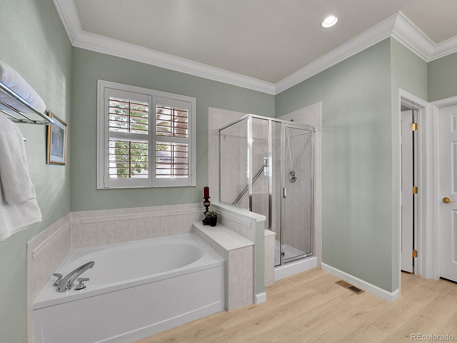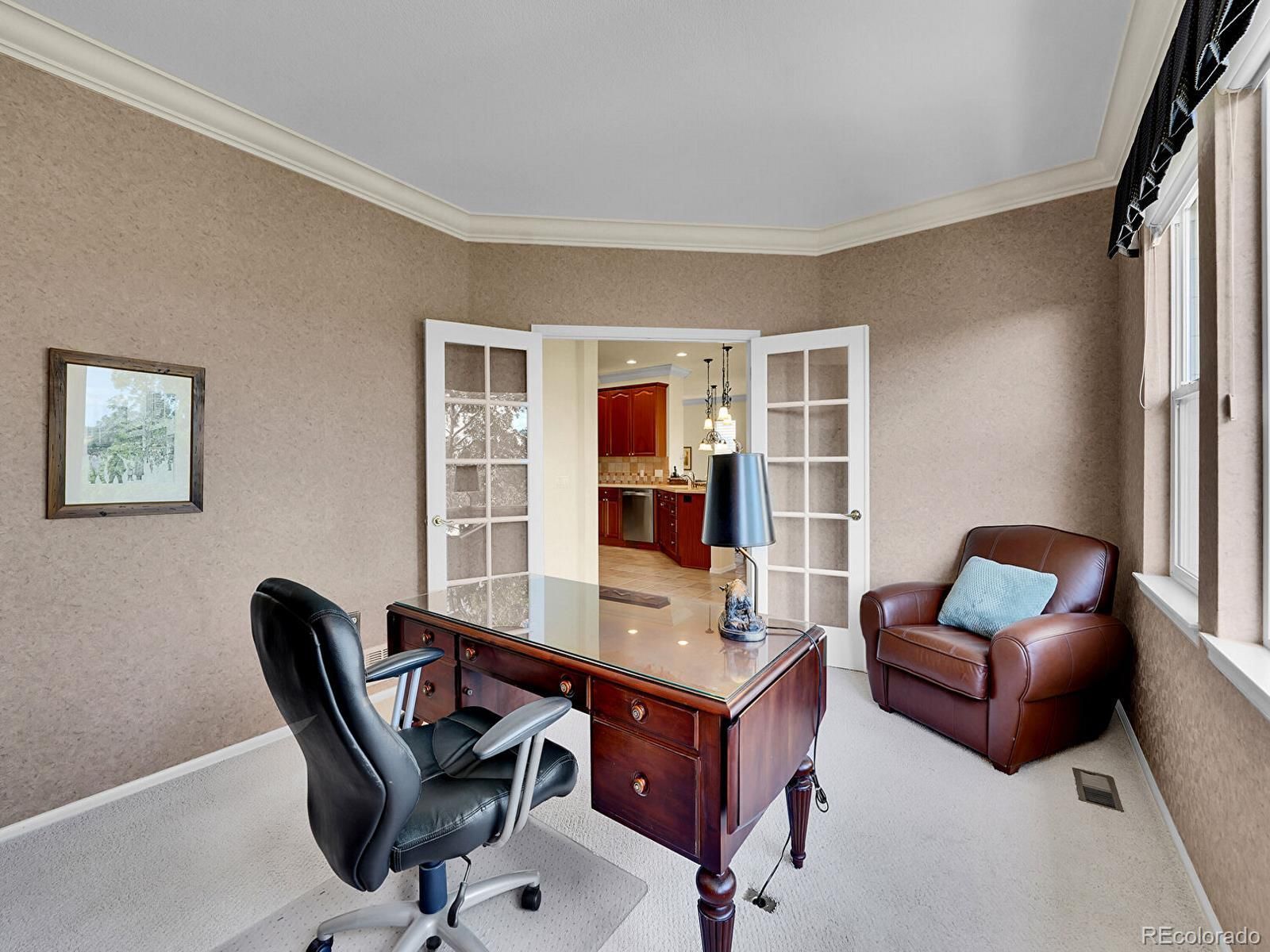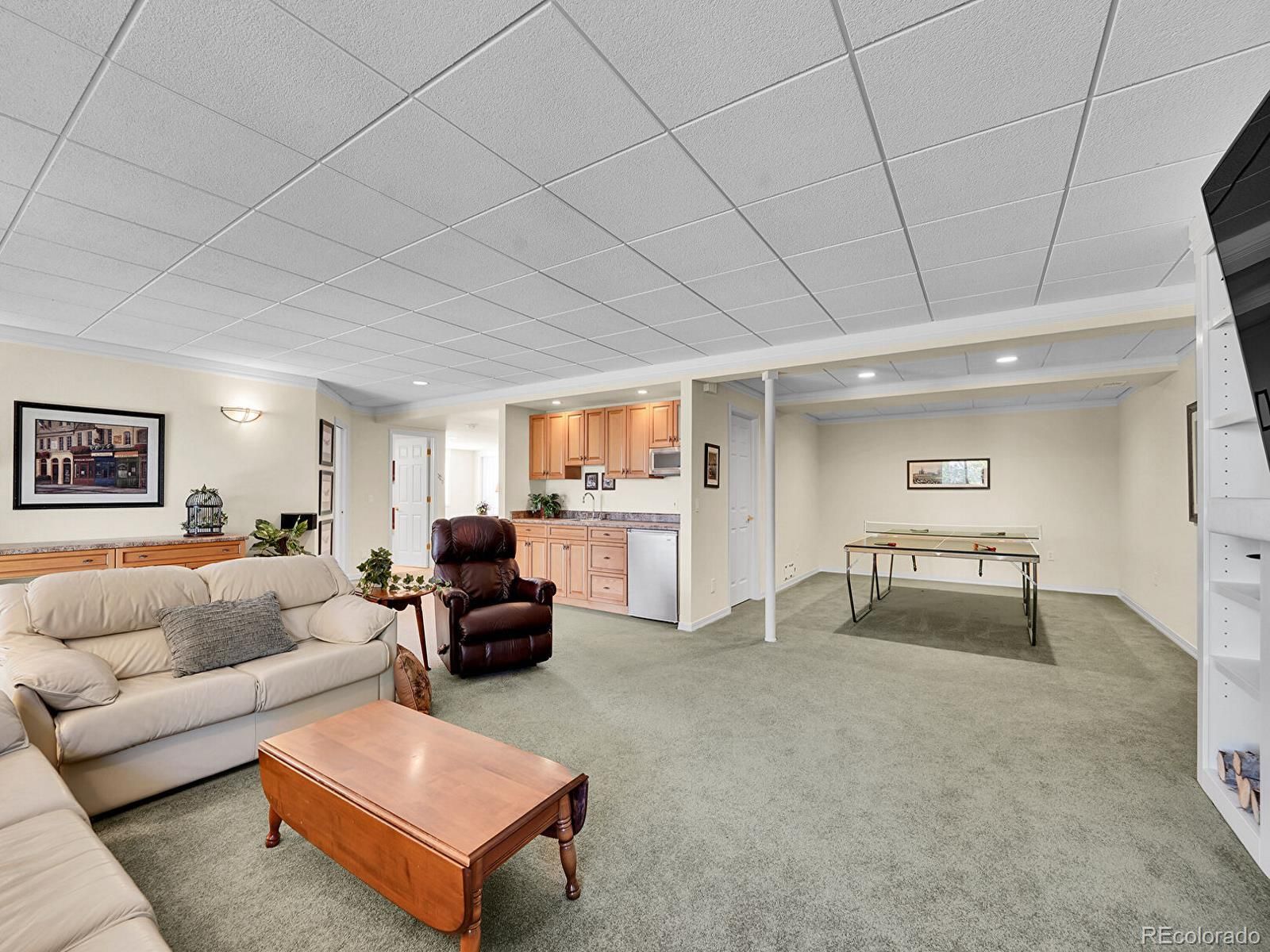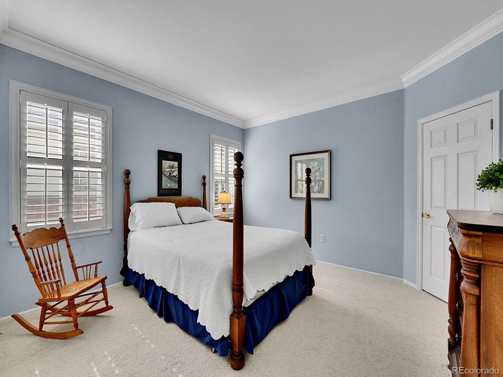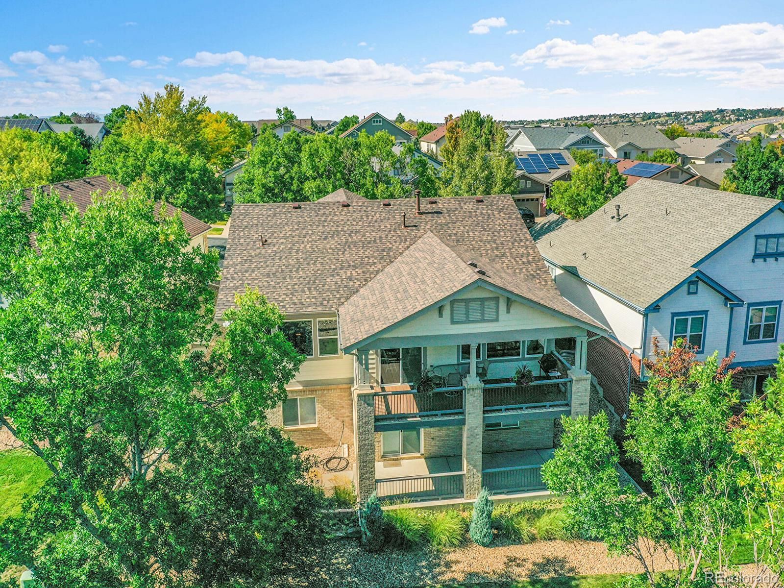 Bright and airy single-family ranch in sought-after Heritage Eagle Bend! Designed for main-level living and entertaining, this 4-bed, 3-bath home boasts tranquil greenspace views surrounded by evergreens, a brand-new roof, an oversized 2-car garage, and a finished walkout basement. Lush garden beds and a covered patio lead into the open main level, accented by crown molding and bright windows. A formal dining area flows seamlessly into the living room, an expansive space for entertaining anchored by a gas fireplace and warm built-ins. Boasting rich cherry cabinetry, stainless appliances, a pantry, and a peninsula with seating, the open kitchen keeps the chef in the action. The dining room opens to the covered upper deck through sliding glass doors, perfect for barbecues or morning coffee. Unwind in the main-level primary suite, featuring a tray ceiling, walk-in closet, and five-piece en suite bath with soaking tub, stand-up shower, and seated vanity. A comfortable second bedroom with a walk-in closet connects to a dual-access en suite full bath, while a third non-conforming bedroom is brightened by wall-to-wall windows and French doors, perfect for a guest room or home office. Convenient main-level laundry with extra storage! The walkout basement features a sprawling rec room with a kitchenette, built-in bookcases, gas fireplace, and sliding glass doors leading to the covered patio. A basement bedroom, dual-access ¾ bath, and 2 bonus rooms create privacy for multigenerational living or guests. Enjoy peaceful greenspace on the covered upper deck or lower patio, perfect for dining al fresco. Embrace the Heritage Eagle Bend lifestyle! This gated 45+ community is built around an 18-hole golf course, indoor/outdoor pools, fitness center, restaurant, and activities like pickleball, tennis, bocce, and billiards. Located just minutes from Southlands Mall, Aurora Reservoir, and Parker Main Street, with easy access to C-470 and DIA.