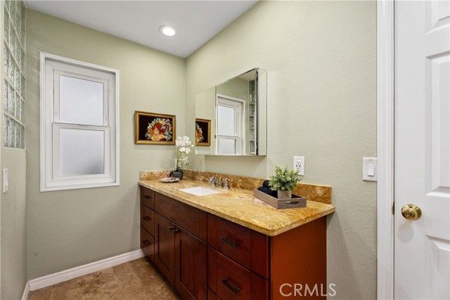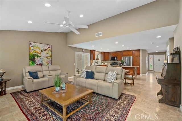 Welcome to your dream home in the 55+ community of Casta del Sol—This exquisitely remodeled, single-level residence blends timeless design with modern comfort. Sitting on a corner lot, the open floor plan seamlessly connects the living, dining, and kitchen areas, creating a fluid and functional layout ideal for both daily living and entertaining. Travertine tile flooring throughout the home compliment the warm wood kitchen cabinetry and granite counters. A large island offers plenty of storage with roll out shelves and a place for conversation. The spacious updated primary suite boasts a stunning en-suite bathroom, large walk-in closet with custom built-ins and a walk-in shower. The additional bedrooms are equally spacious and versatile, perfect for guest accommodations, a home office, or creative space. A second full bathroom has also been completely updated, featuring a walk-in shower with glass enclosure. (The third bedroom is currently open to the family room and used as an office. It can easily be converted by adding a door) The garage includes plenty of storage with built-in cabinetry and a pull-down ladder for easy attic access. Other updates to the home include custom book shelves in office, recessed lighting, paneled interior doors, double pane windows with plantation shutters and scraped ceilings, as well updated water heater, furnace and A/C. Refrigerator, washer, dryer and family room TV included. The property was RE-PIPED with PEX piping. Casta del Sol offers an extensive range of community amenities that include swimming pools and spas, tennis courts, pickle ball courts, billiards, craft room, lawn bowling, shuffleboard, walking paths, outdoor BBQ’s and plenty of social activities and events to participate in to connect with residents. This property includes a membership to Lake Mission Viejo where you can enjoy fishing or taking a boat out for a ride, along with summer movies and concerts.