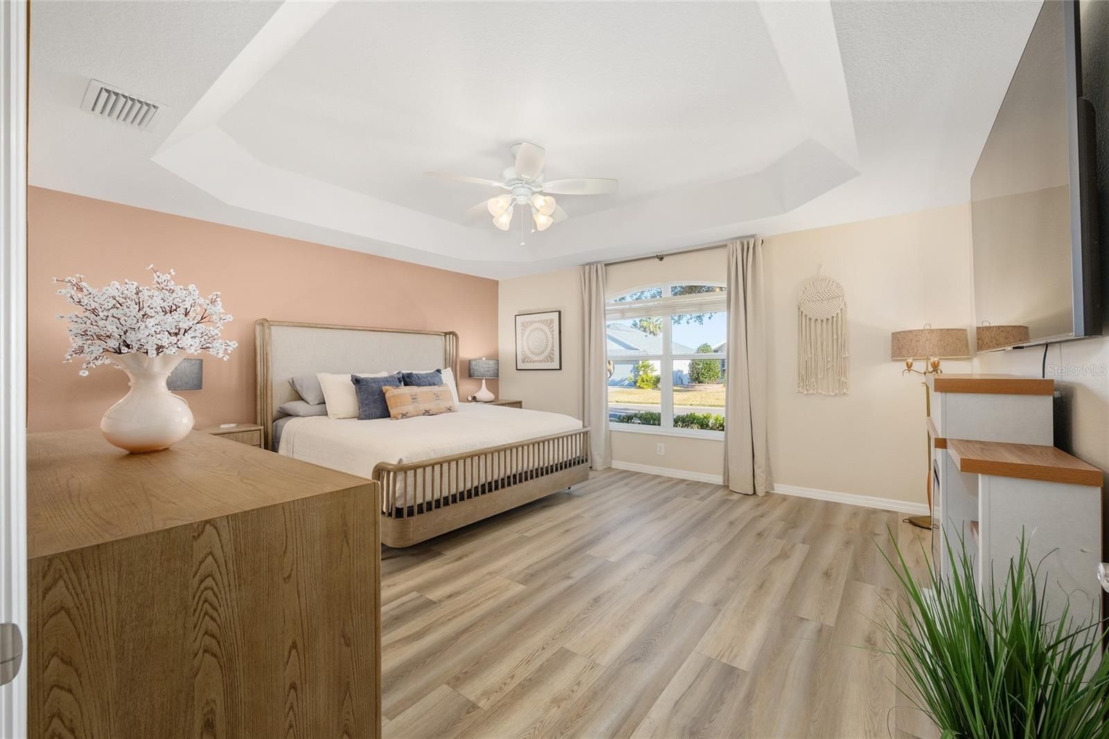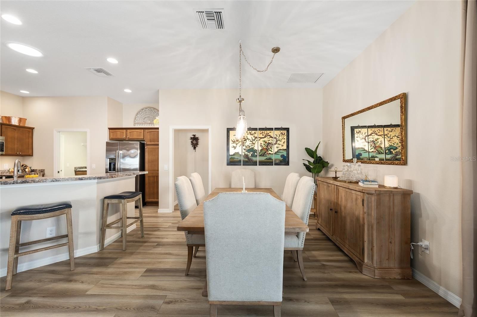 The Village of TAMARIND GROVE, ELM Designer Model, MOVE-IN Ready, Meticulously Maintained and Tastefully Updated with REAR PRIVACY WALL!!! This 3-bedroom, 2 Bath Concrete Block & Stucco Home offers 2,010 Sq Ft under Heat & Air -- The Exterior Features Landscape Beds with Rock Mulch, Custom Painted Driveway, Walkway and Covered Front Porch, Gutters & Downspouts, and a 25 Ft x 10 Ft Rear Covered & Screened Lanai with 2 Ceiling Fans, Recessed Lighting, Custom Painted Floor, and Door to Paver BBQ Pad. -- Inside you will find Luxury Vinyl Plank Flooring Throughout, a Spacious Foyer with Coat Closet, and a Kitchen featuring a SOLAR TUBE, Stainless Steel Appliances, Recessed Lighting, Stationary Kitchen Island with Pull-out Shelving & Electric Outlet, Wood Cabinetry with Pot Drawers, Pull-out Shelving, Under Cabinet Lighting, Crown Molding, Pantry Cabinet with Pull-out Shelves, and Breakfast Bar. -- The Living Room is 16 Ft x 16 Ft with a Vaulted Ceiling, Windows to Side Yard, and Glass Slider to Lanai. -- The Dining Room includes a 5-Globe Updated Chandelier. -- The Owner’s En-Suite Bedroom features an Arched Entry, Beautiful Large Tray Ceiling with Ceiling Fan, and 2 Windows to the Front Yard. The En-suite Bathroom offers Pocket Door Entry, Ceiling Fan with Light, Large Single Vanity with Dual Sinks, and Private Privy. The Roman Walk-In Shower includes Tile Walls, Tile Floor, Glass Blocks, Transom Window, and Built-in Shampoo Caddy. The Owner’s Walk-in Closet is 10 Ft x 10 Ft with Attic Access and Extra Wire Shelving. –- The Guest Wing boasts Pocket Door Entry from the Dining Room, with a Linen Closet. -- Bedroom 2 with Walk-in Closet and Window to Side Yard, and Bedroom 3 with Window to Backyard and Built-in Closet. -- The Guest Bathroom is Conveniently Located with a Door to the Lanai with Internal Blinds, Tub/Shower Combo with Tiled Walls, Transom Window for Natural Light, Large Single Vanity, Updated Lighting, Cabinet Linen Closet, and Private Privy with Pocket Door Entry. –- The Garage accommodates 2 Cars and includes Pull-down Attic Stairs, Window to Side Yard, Liftmaster Motorized Garage Door with Lites & MyQ Technology, Rachio 3 Smart Sprinkler System, and Whole House Water Filtration System. -- Don’t Miss Out on this UNIQUE Move-in Ready Elm Designer Home with REAR PRIVACY WALL !! --- Unit 160 Bond Assessment: $1,374.73/yr, (Bond Balance: $13,210.50), Unit 160 Maintenance: $609.23/yr, Villages Fire District: $320.71/yr. Amenity Fee: $204./mo