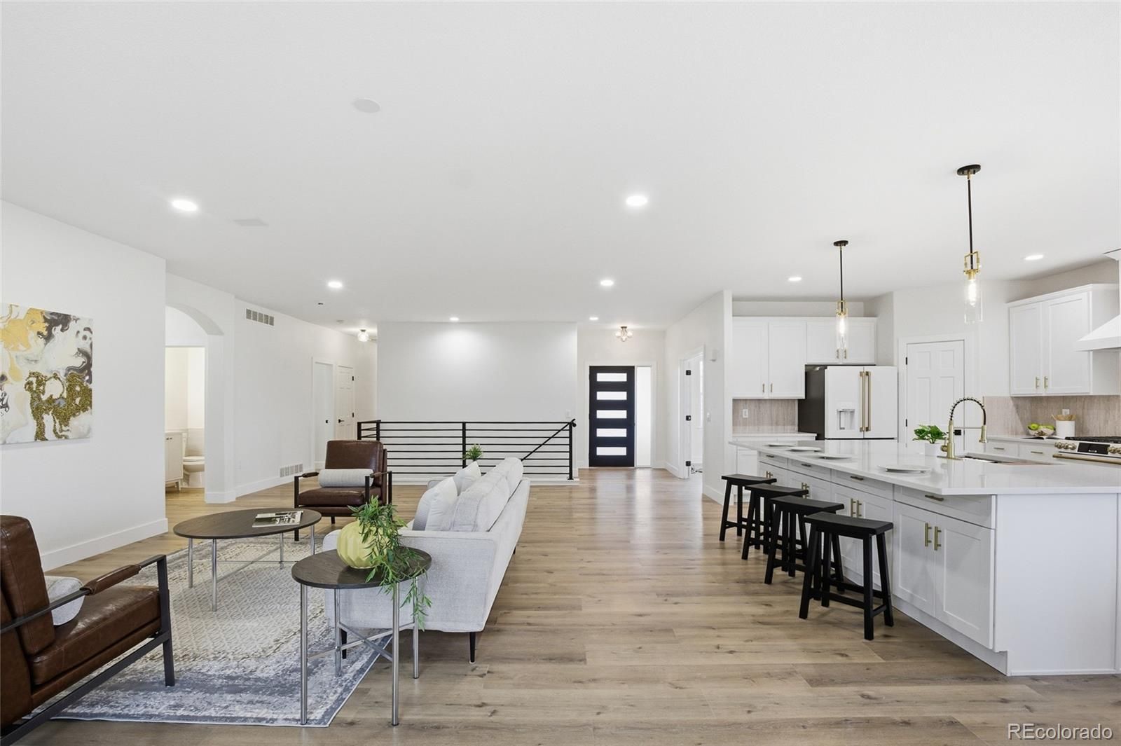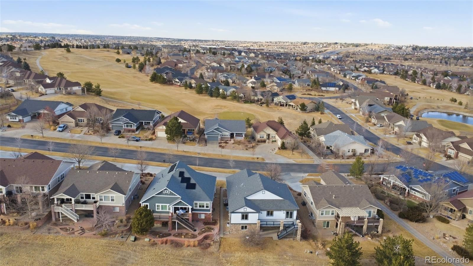Located within a sought-after 45+ gated community, this ranch-style home stands out in all the right ways. Tucked behind the gates of Heritage Eagle Bend Golf Club and backing to the golf course, it offers a setting that feels private, open, and genuinely special. Inside, the open-concept design is elevated by fresh interior and exterior paint and thoughtful custom touches throughout. The kitchen is striking yet timeless, featuring custom cabinetry, quartz countertops, matte white GE Café appliances, and finishes that feel carefully chosen rather than expected. Custom railings add a subtle architectural statement, giving the home a refined edge you don’t often see. The main level flows effortlessly with a dedicated office, a welcoming mudroom with built-in seating and laundry, and a spacious primary suite that functions as a true retreat. The primary bedroom offers a walk-in closet, a five-piece bath, and direct access to the back porch. It is perfect for slow mornings overlooking the course. The finished walk-out basement takes this home to another level, featuring a wet bar, flexible living space, and a second primary suite. It is ideal for long-term guests, multi-generational living, or hosting in comfort and privacy. This space easily adapts to your lifestyle, whether as a home gym, theater, storage, or private lower-level retreat. A separated driveway adds both privacy and practicality, while dual HVAC systems for the main floor and basement, including a newly installed basement system, ensure comfort on every level. Conveniently located near E-470, Parker Road, and I-25, this home offers easy access while maintaining a peaceful, tucked-away feel. Quietly distinctive, easy to live in, and thoughtful designed for you to have a home that feels like your own oasis. Welcome home! 3D tour link: https://download.spiro.media/23464_e_heritage_pkw-8773/virtual-tour