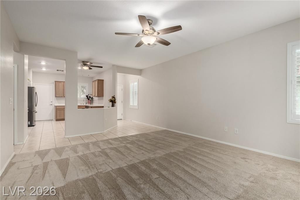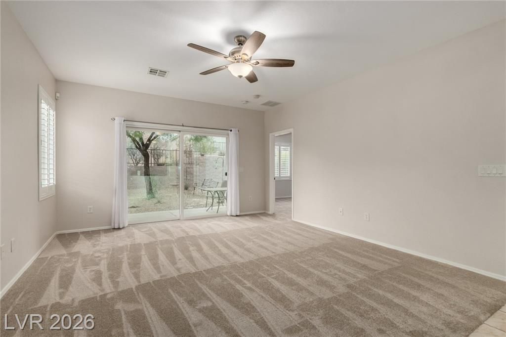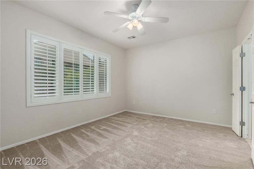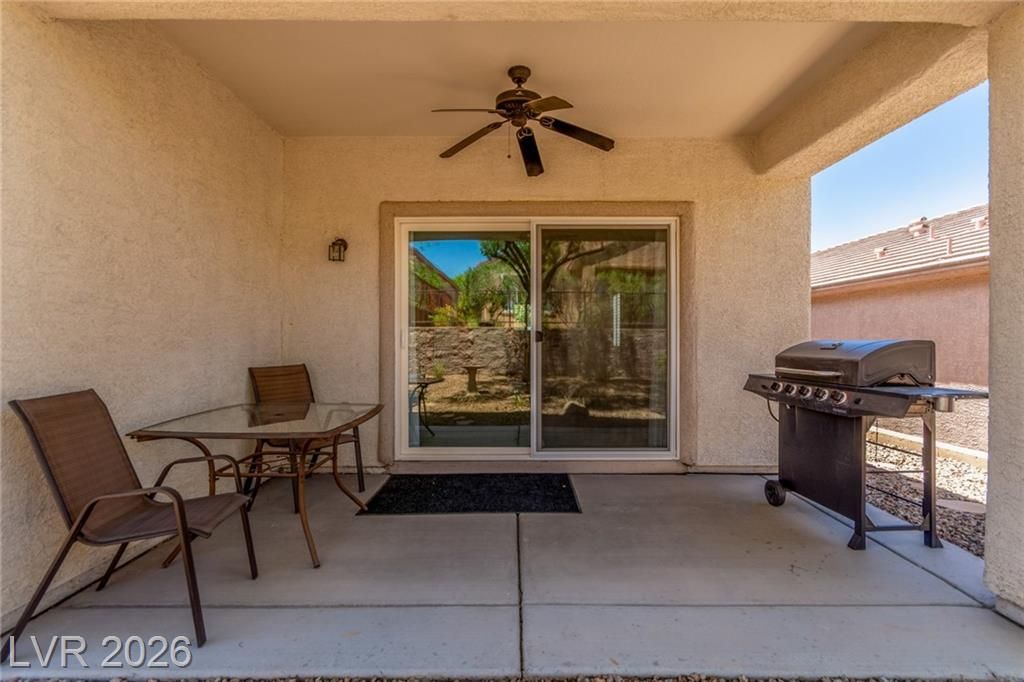 Move in ready! Beautiful 2 Bedroom - 2 Bath, 2 car Lewis floor plan. This well maintained home features exquisite curb appeal highlighting a stone veneer elevation and manicured landscape. The interior features an open-concept design that flows seamlessly from the kitchen into the living room offering perfect functionality. The kitchen boasts stainless steel appliances, a pantry, plenty of cabinet storage and dual windows over the sink. The stylish textured walls & ceiling, tile flooring and elegant shutters throughout the house creates a warm ambiance. The spacious primary suite features a ceiling fan, an en-suite bathroom with a large shower, dual sinks and a spacious walk-in closet. Enjoy your peaceful and tranquil backyard year around with a recessed covered patio, fan, BBQ and plenty of shade from the trees. Additional features include a 2 year old HVAC, H2O Softener and New carpet & padding. The 55+ community in Solera at Anthem is a wonderful place to call home!