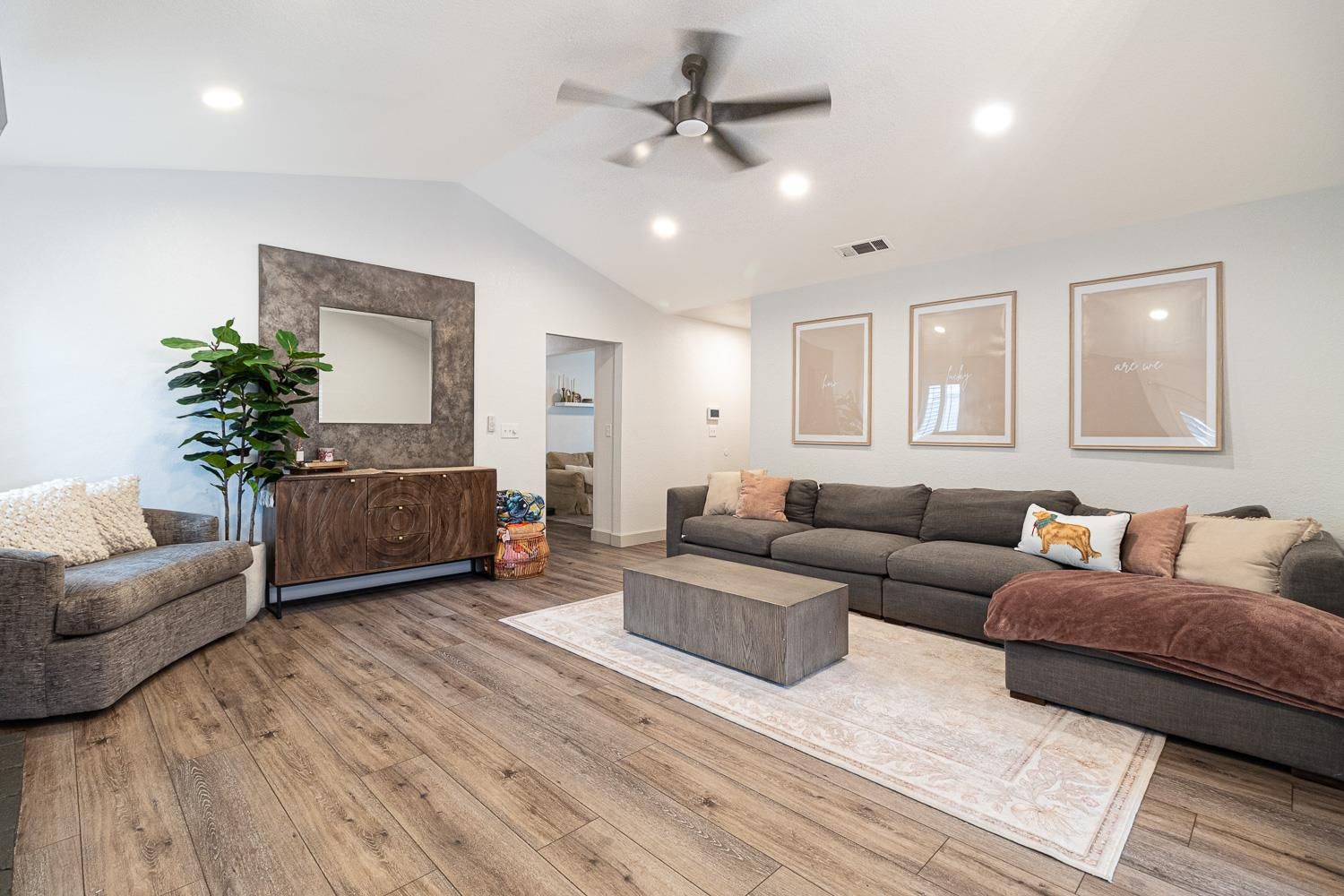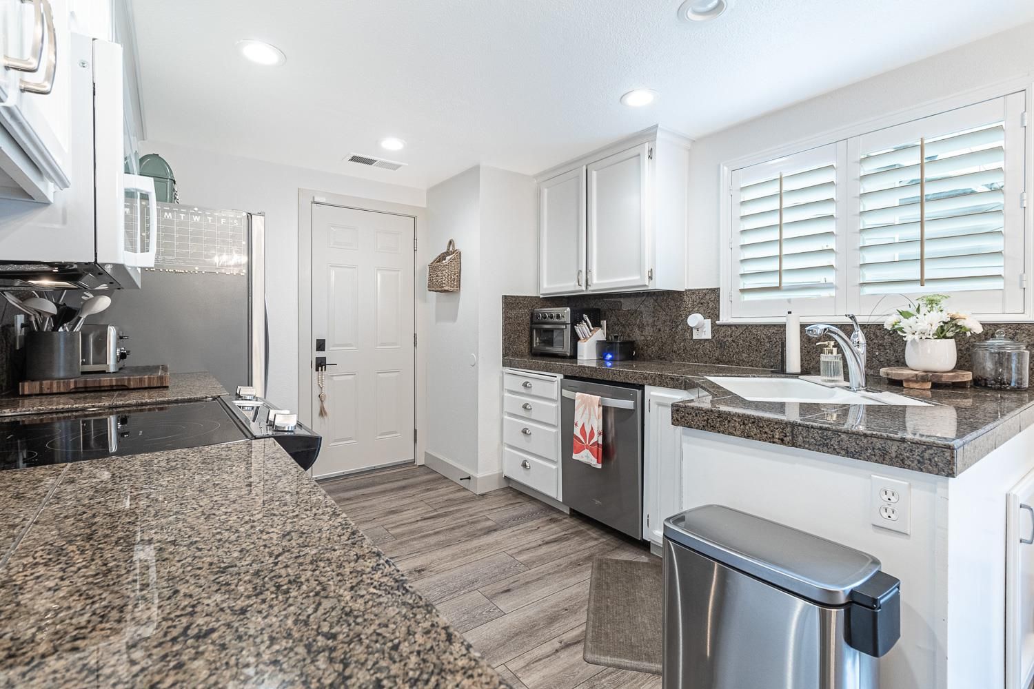 Welcome to a beautifully transformed residence in Regency Park, offering luxurious modern living with zero maintenance needed. This fully remodeled home sits on a significantly larger lot than typical, providing expanded outdoor living and exceptional privacy. Step inside to fresh interior and exterior paint, new luxury vinyl wood flooring, new plush carpet, custom recessed lighting, upgraded fixtures, and an elegant kitchen featuring all-new appliances. Both bathrooms have undergone a complete remodel with new vanities, countertops, tile, and fixtures. Major system upgrades include new toilets, upgraded plumbing, a new hot water heater, and a fire-safe kitchen-to-garage door. The backyard has been fully re-landscaped with artificial turf, extended patio and cement areas, refreshed fencing, and a premium putting greencreating an ideal environment for effortless indoor-outdoor living. A rare opportunity to own a fully modernized home in a highly sought-after community.