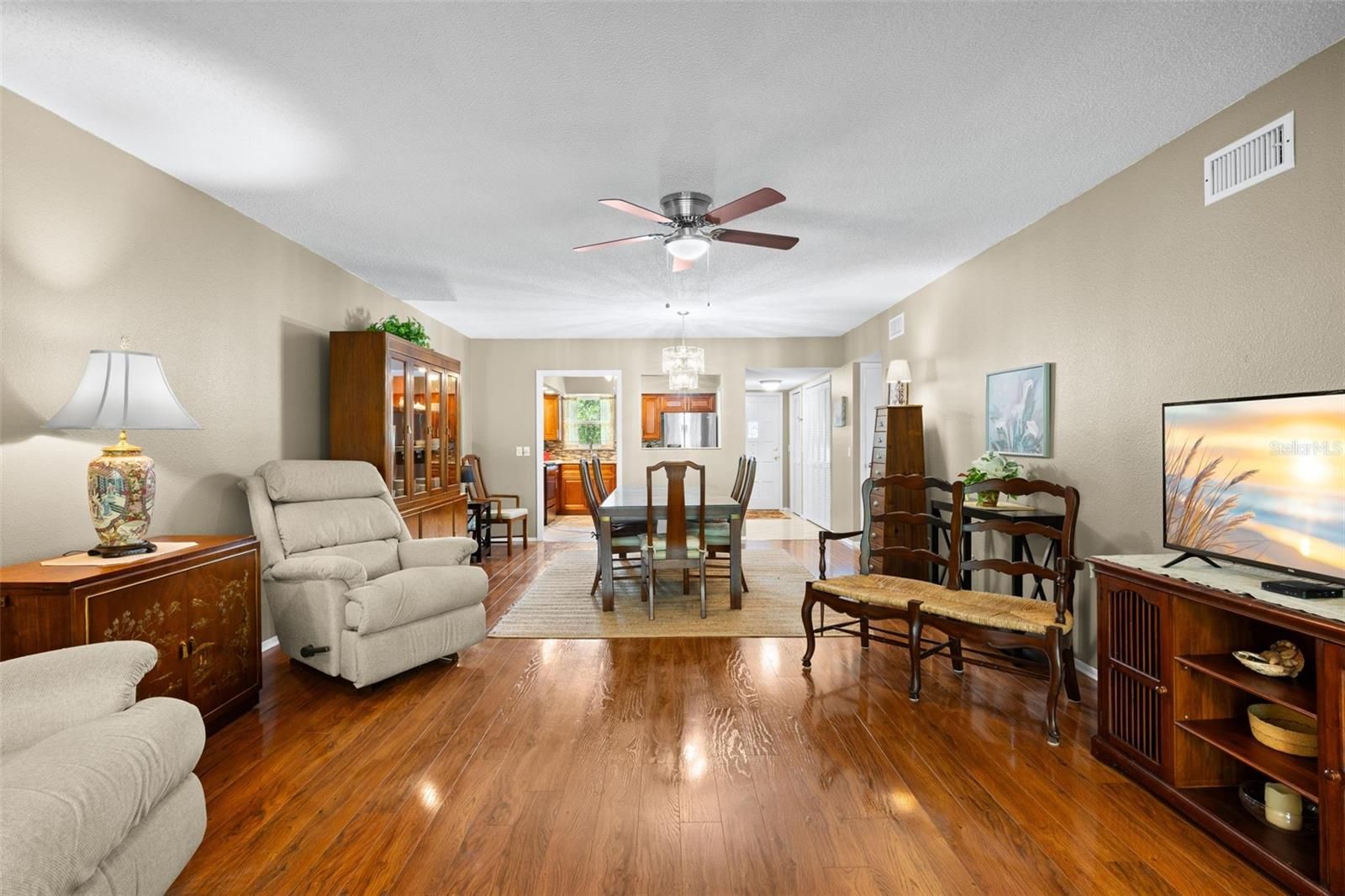 - Ceiling Fan(s), Eat-in Kitchen, Living/Dining Room, Solid-Wood Cabinets, Stone Counters