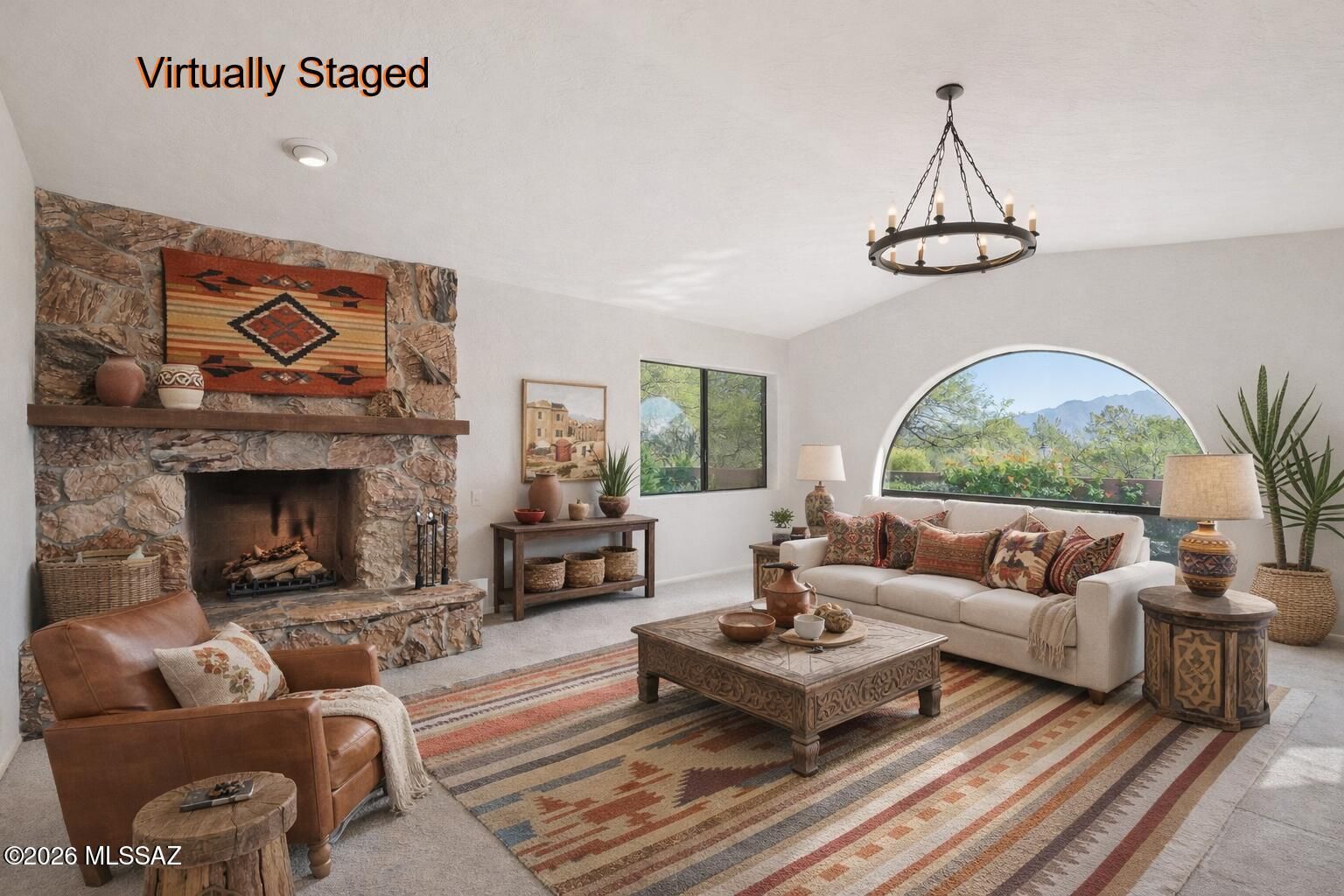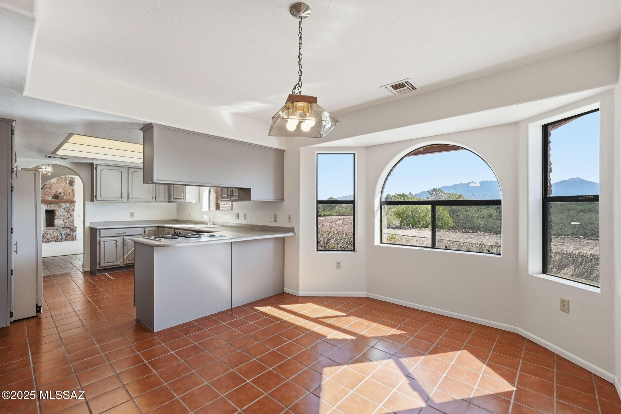 Nestled in the coveted, non-age restricted Desert Hills Estates (South Acres), this charming 3BD/2.5BA Territorial-style ranch home showcases brick construction, graceful arched entryways, and an elevated 1-acre private lot with no neighbors in front or behind. Enjoy breathtaking mountain views and a tranquil setting directly across from the private Desert Hills Golf Club. A stately stone wall and cobblestone driveway lead to the fully enclosed paver front courtyard - an inviting space ideal for entertaining while the mountains glow in vibrant orange and pink at sunset. Inside, the inviting family room features a vaulted ceiling and rustic stone wood-burning fireplace for cozy evenings.