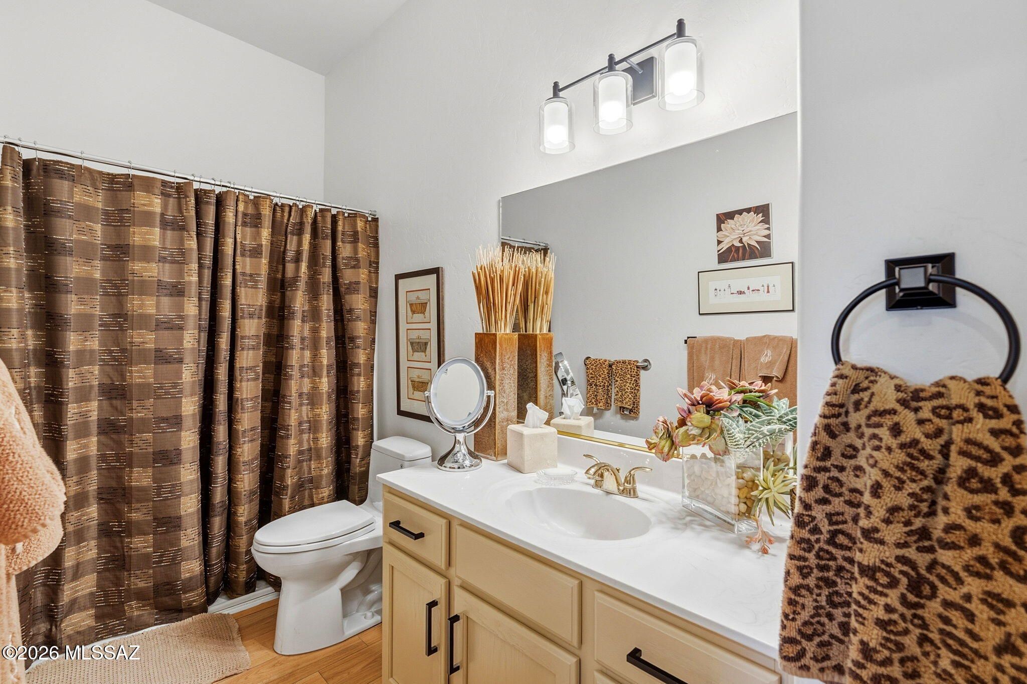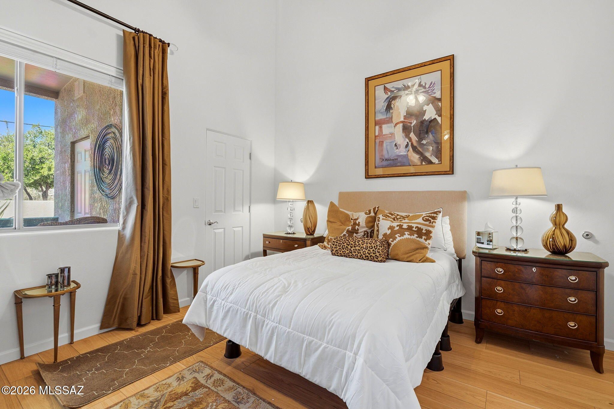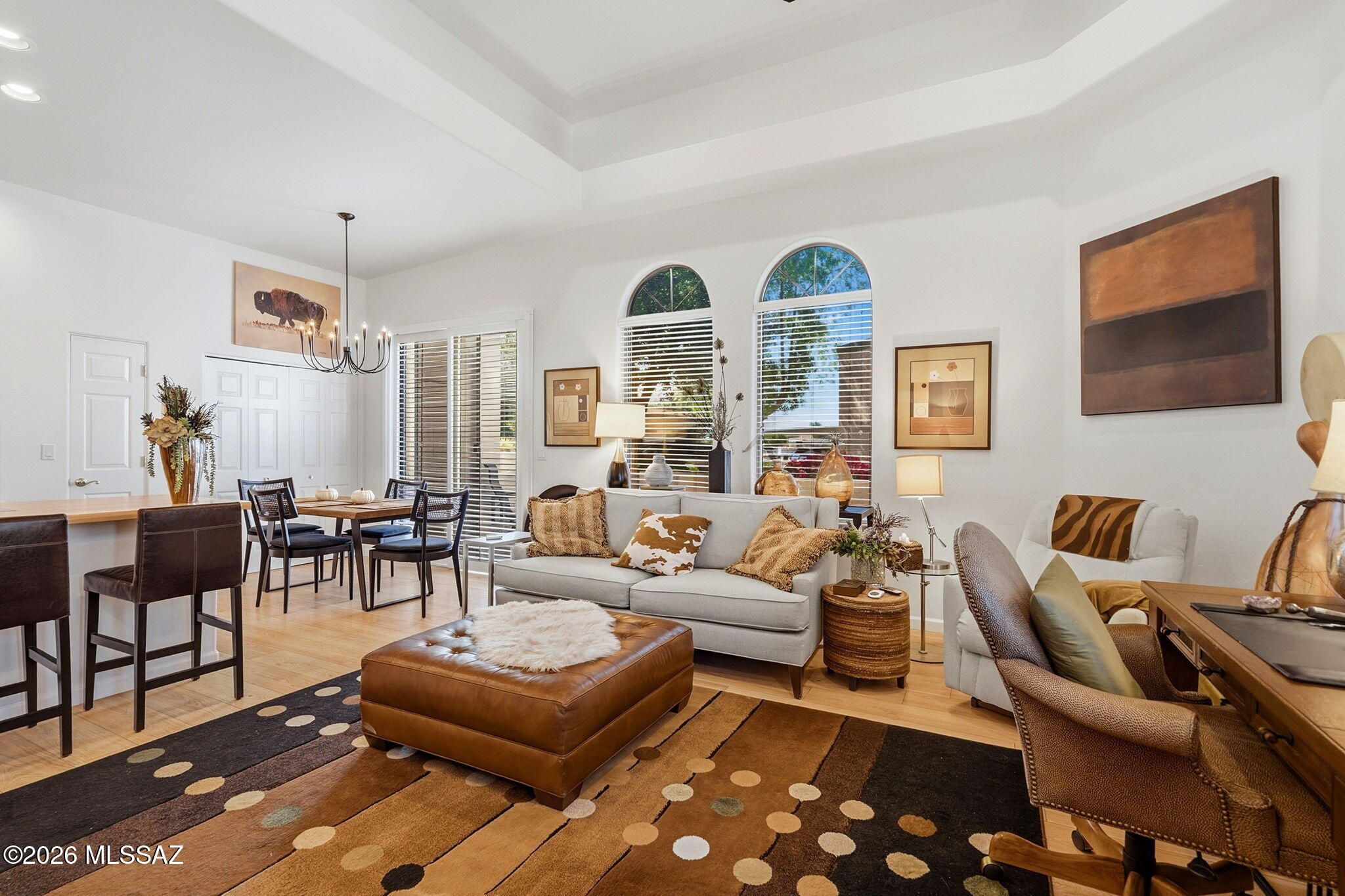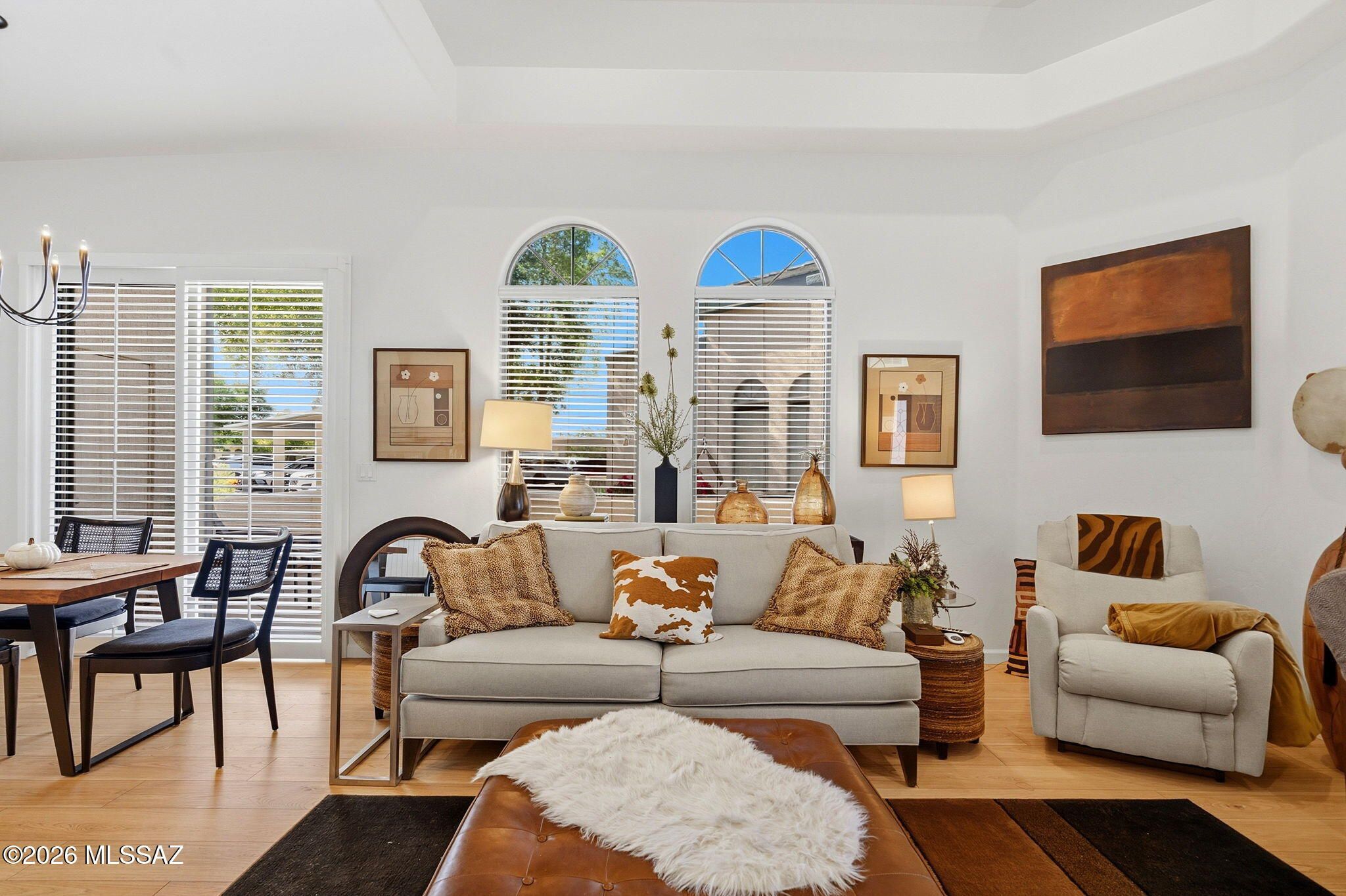 Welcome to this charming townhome in Northwest Tucson! Located in a 55+ gated community with beautifully landscaped grounds, residents enjoy access to a pool, spa, and rec center. HOA covers water, sewer, waste pickup, community landscaping, tile roof, exterior maintenance, and gated entry. Wonderful low-care home features soaring cathedral ceilings, a bright great room floor plan, and abundant natural light throughout. Mountain views enhance the space, while laminate flooring, custom window coverings, accented interior paint, and an updated walk-in shower with grab bars add comfort and style. Spacious bedroom includes two closets. Enjoy mountain views and Arizona sunsets from two private patios in a quiet interior location. Conveniently located near dog park, Ann Day Community