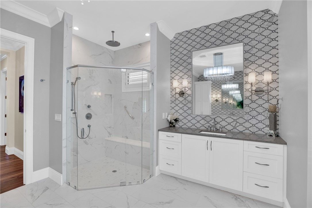 - Closet Cabinetry, Crown Molding, High Ceilings, Kitchen Island, Split Bedrooms