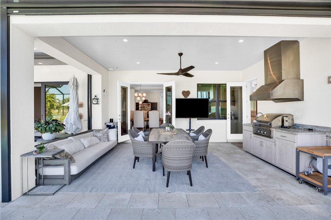 Enjoy stunning lakefront sunsets from your luxurious lanai with resort-style pool, spa, fountain, and fire feature. Outdoor living shines with a built-in grill, summer kitchen with sink, and two covered seating areas with hurricane-protected metal screening. Inside, a spacious two-island gourmet kitchen with Dacor appliances, reverse osmosis water filter, coffered/tray ceilings, a large primary suite, and all impact windows/doors await. Numerous premium upgrades—often costly in new builds—are already included (see feature sheet).
