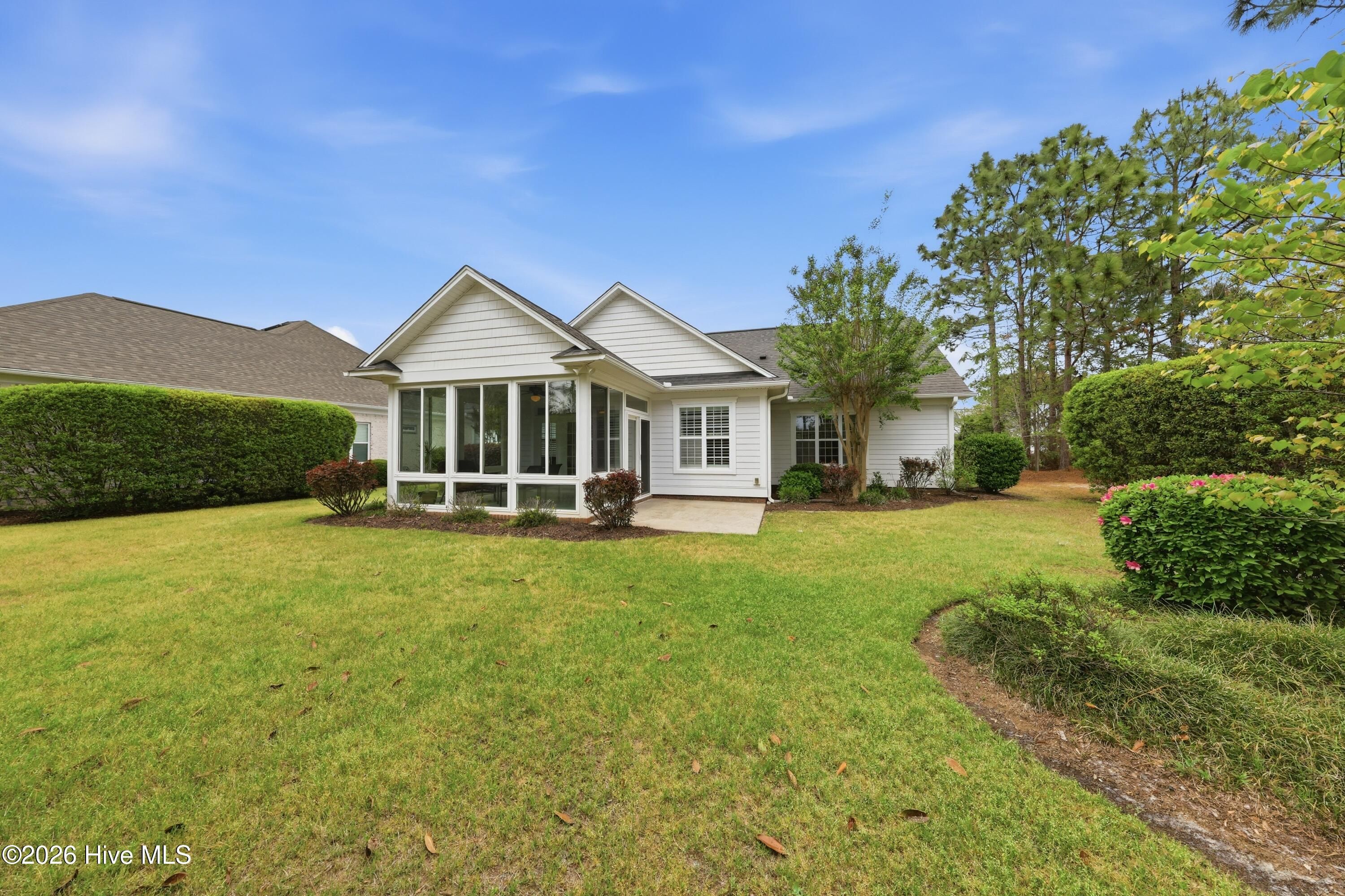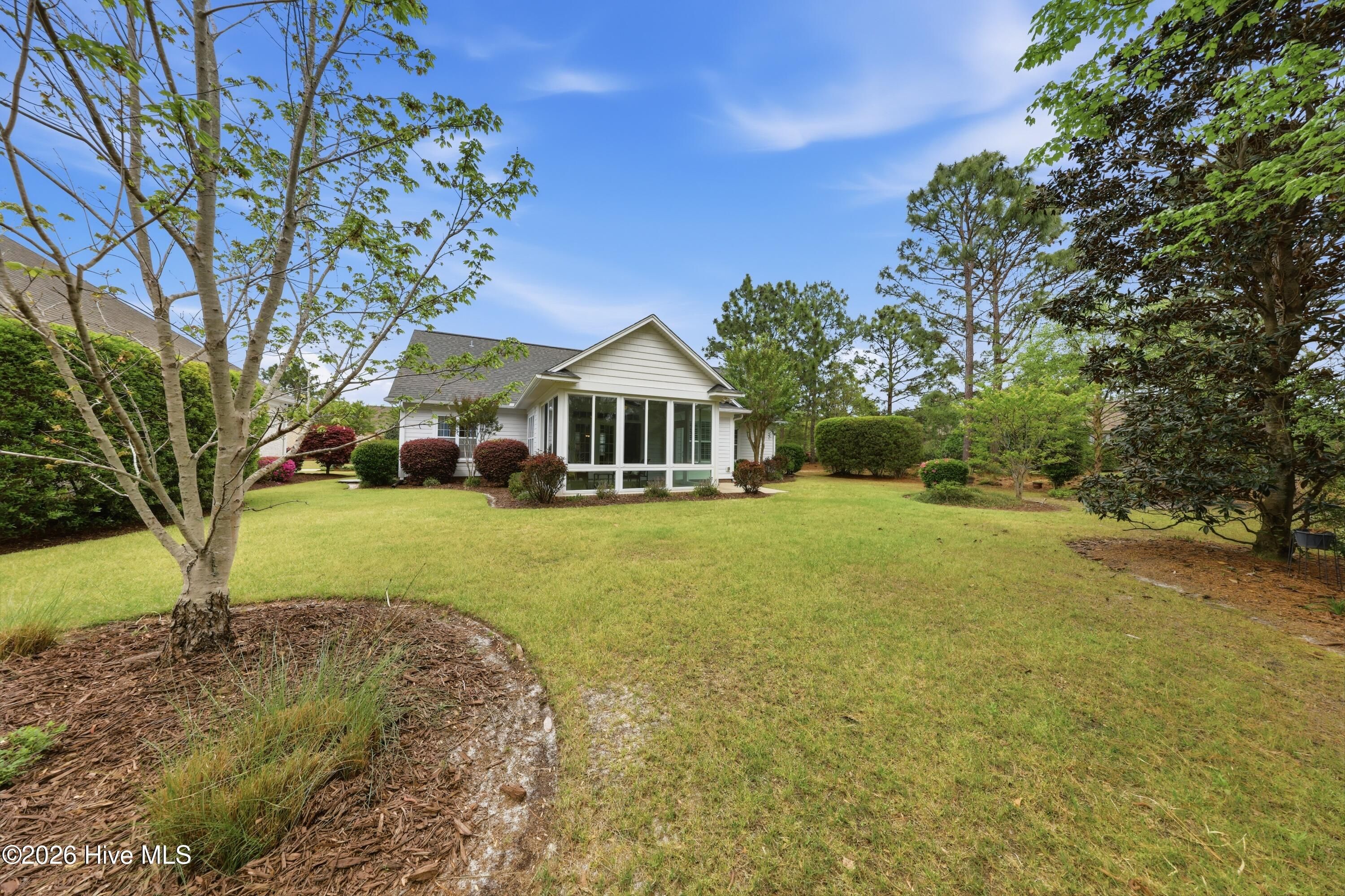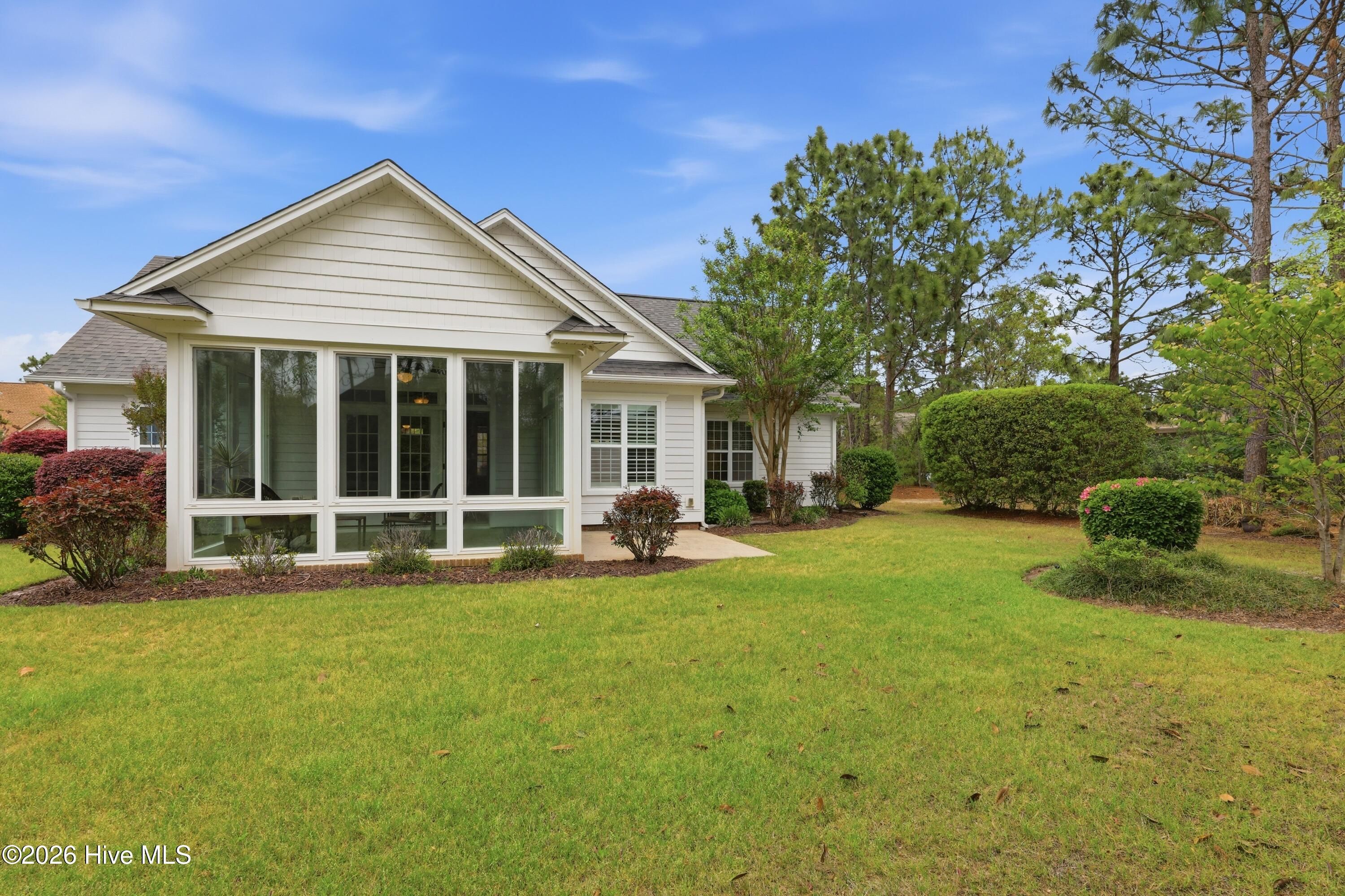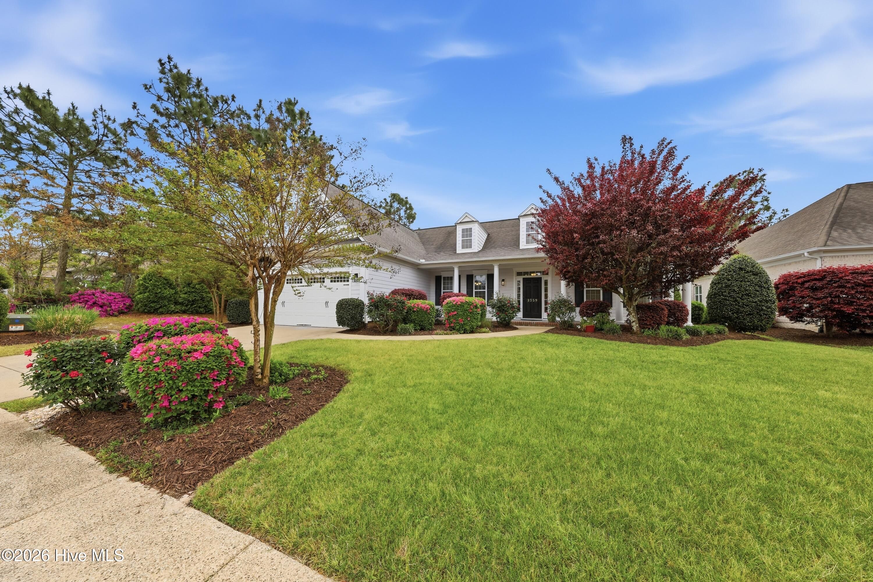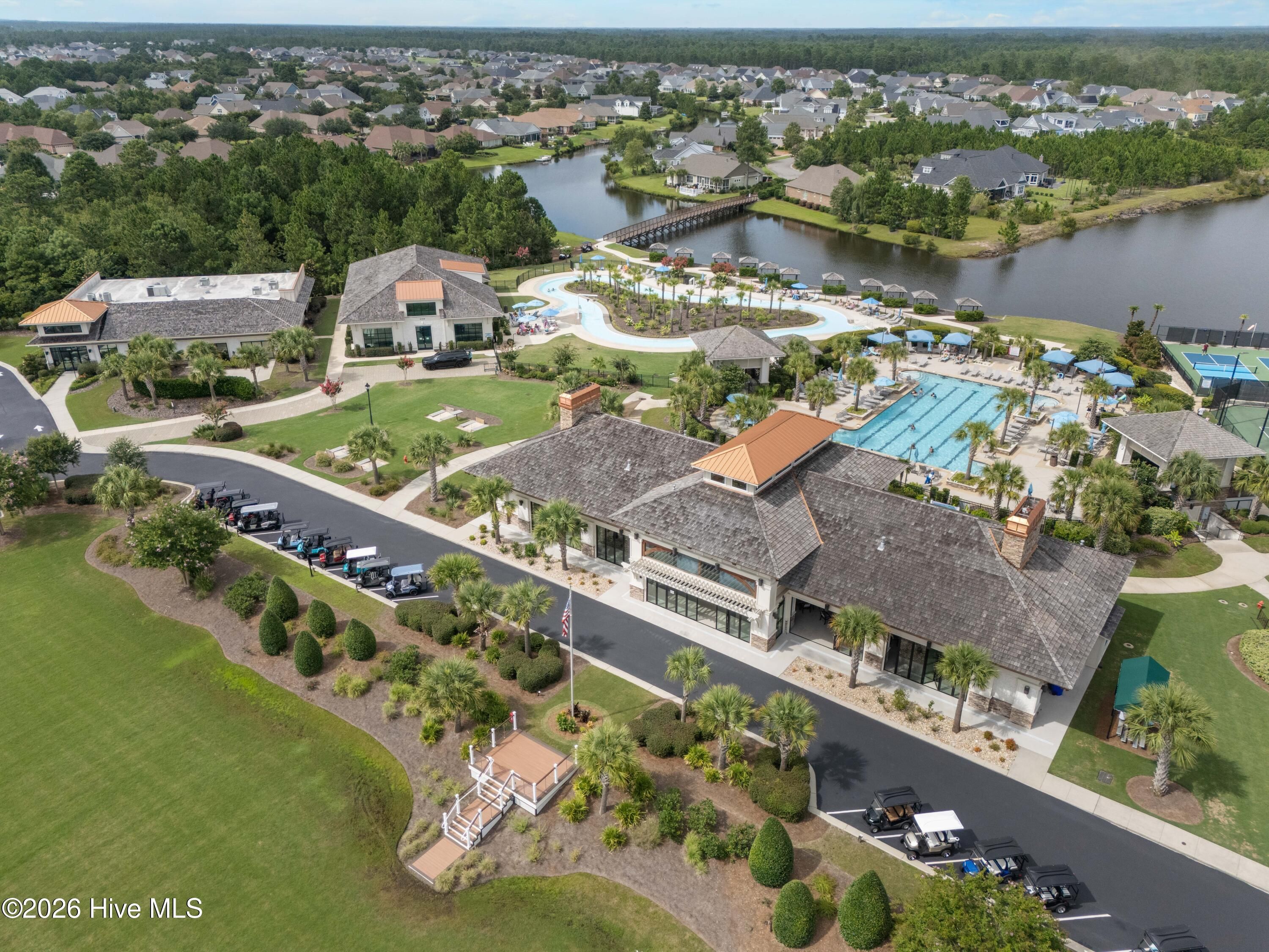 Welcome to a sanctuary of elegance and comfort nestled within the prestigious Compass Pointe community in Leland. Step inside this move-in ready, expansive home where every detail radiates luxury and warmth. Sunlight pours through the long windows of the breakfast nook, adorned with plantation shutters, gently illuminating your morning coffee and inviting you to embrace each day. Delight in the open floor plan, perfect for entertaining and everyday living, with a formal dining space accented by sophisticated chair-rail and wainscoting, and a great room paired with a sunroom featuring rich hardwood flooring. Vaulted ceilings soar overhead, while built-in shelves and a cozy fireplace create a welcoming ambiance. Retreat to the stately master suite, tucked away for privacy, where a spa-inspired bath awaits, boasting a garden tub, walk-in tile shower, double vanity, and an oversized walk-in closet. Entertain with ease in the glassed-in lanai, graced by stamped concrete floors, or enjoy the serenity of the rear yard, thoughtfully landscaped and buffered for your exclusive retreat. The home grants exclusive access to Compass Pointe's resort-style amenities, including the Grand Lanai Clubhouse, Health and Wellness Center, multiple pools, a lazy river, tennis and pickleball courts, and a large events lawn. Golf and social memberships are available at Compass Pointe Golf Club, featuring an 18-hole course, restaurant, and state-of-the-art facilities. Why wait to build when you can enjoy this exceptional home and its savings today?