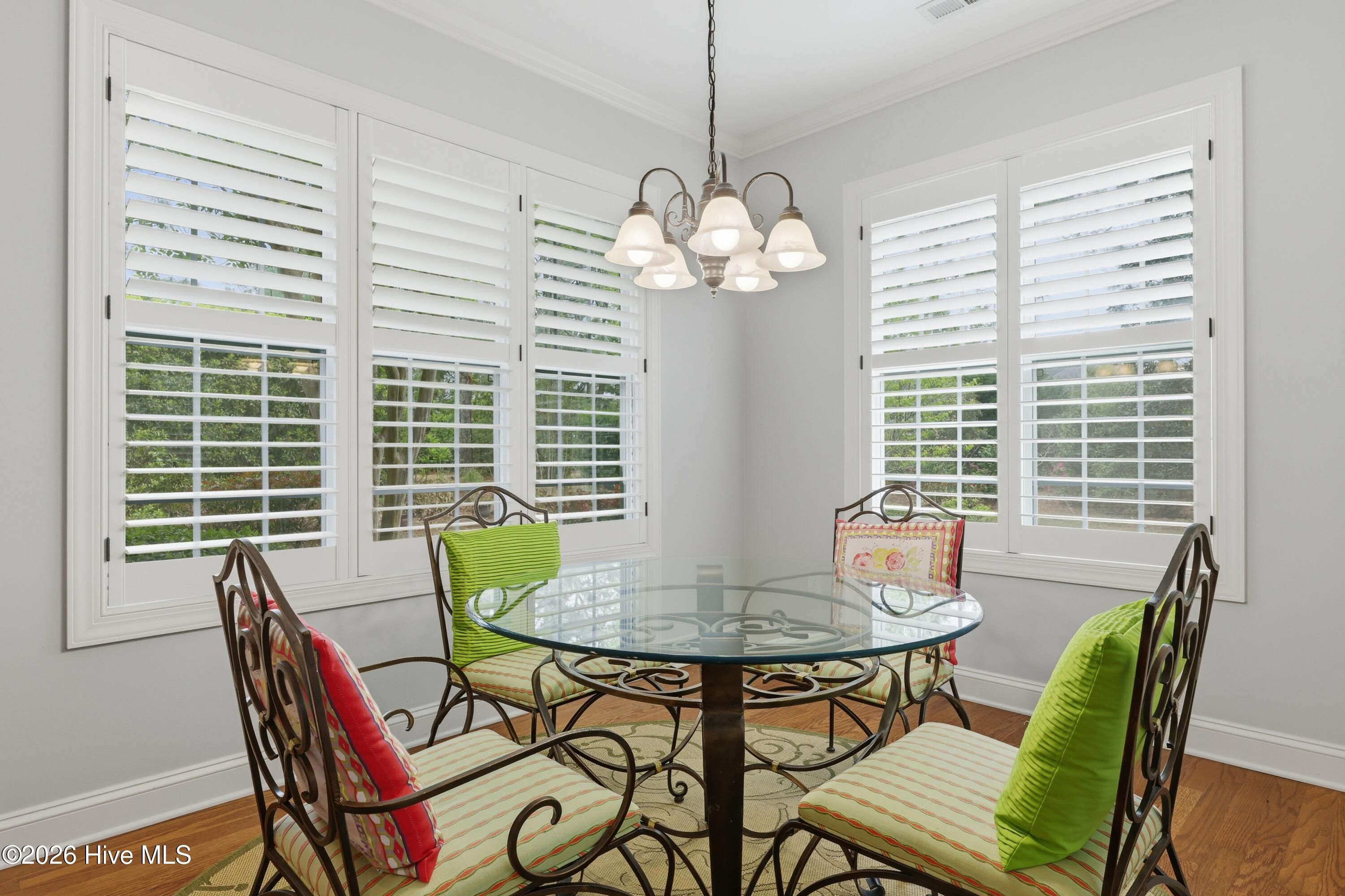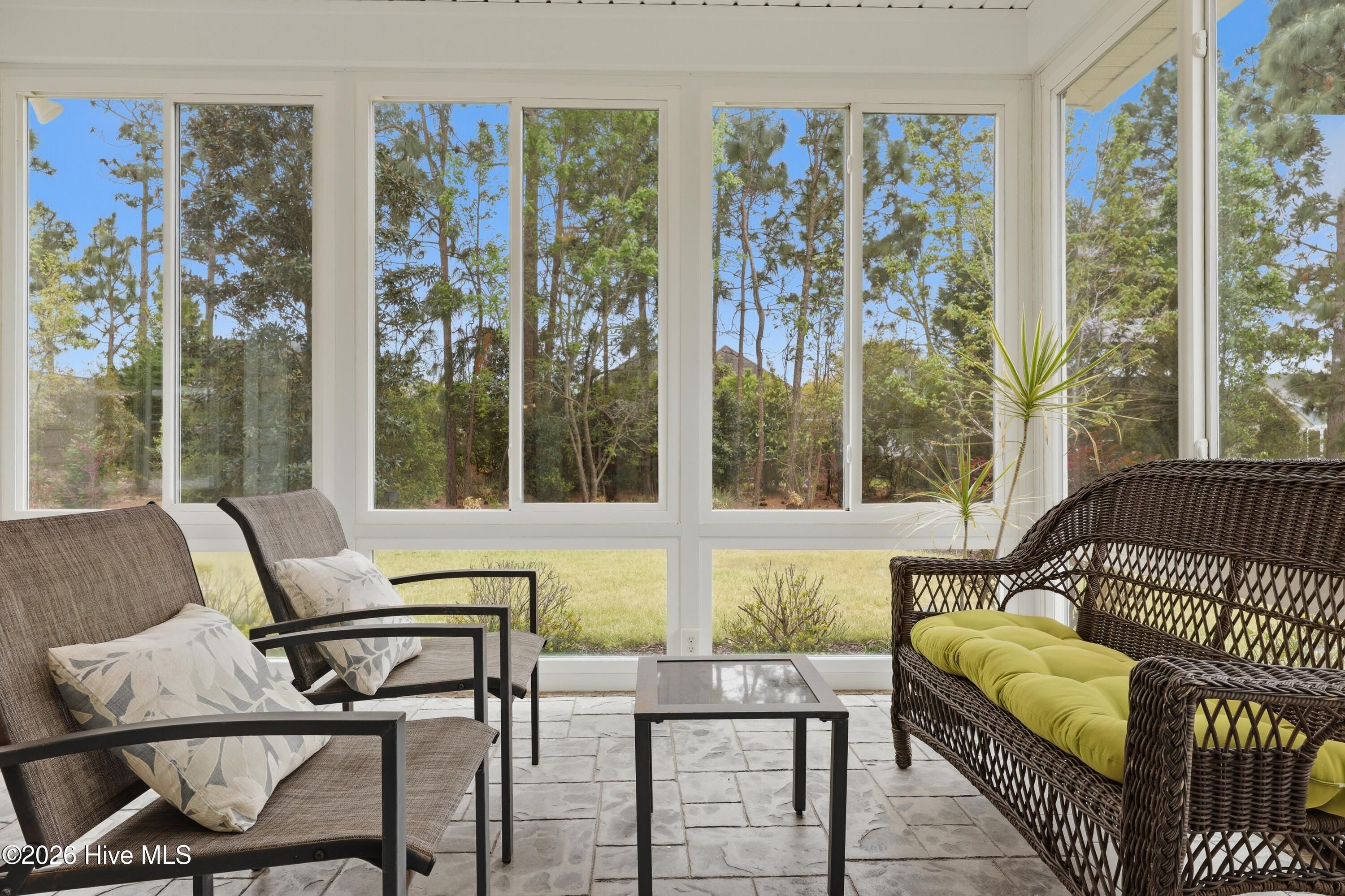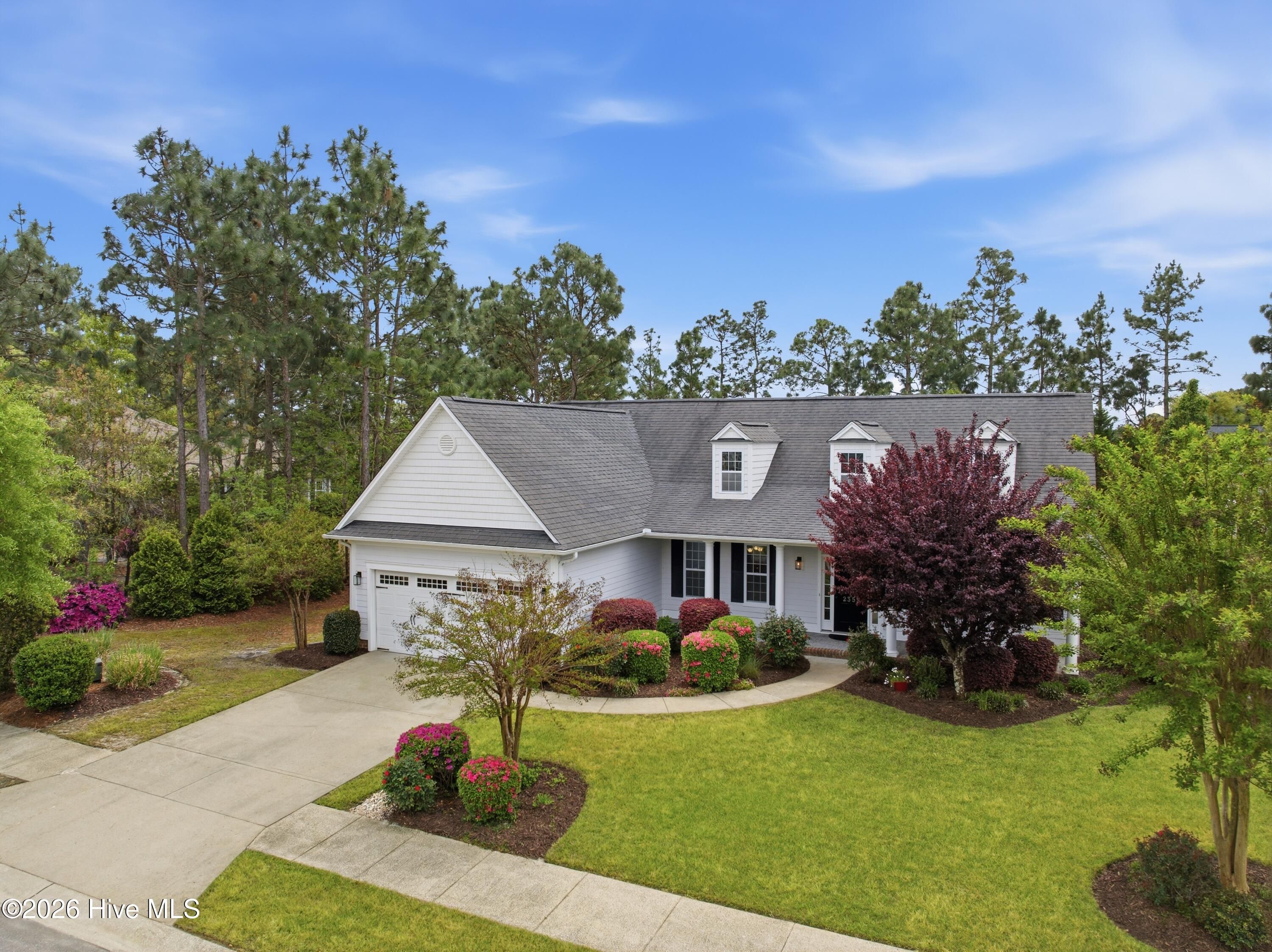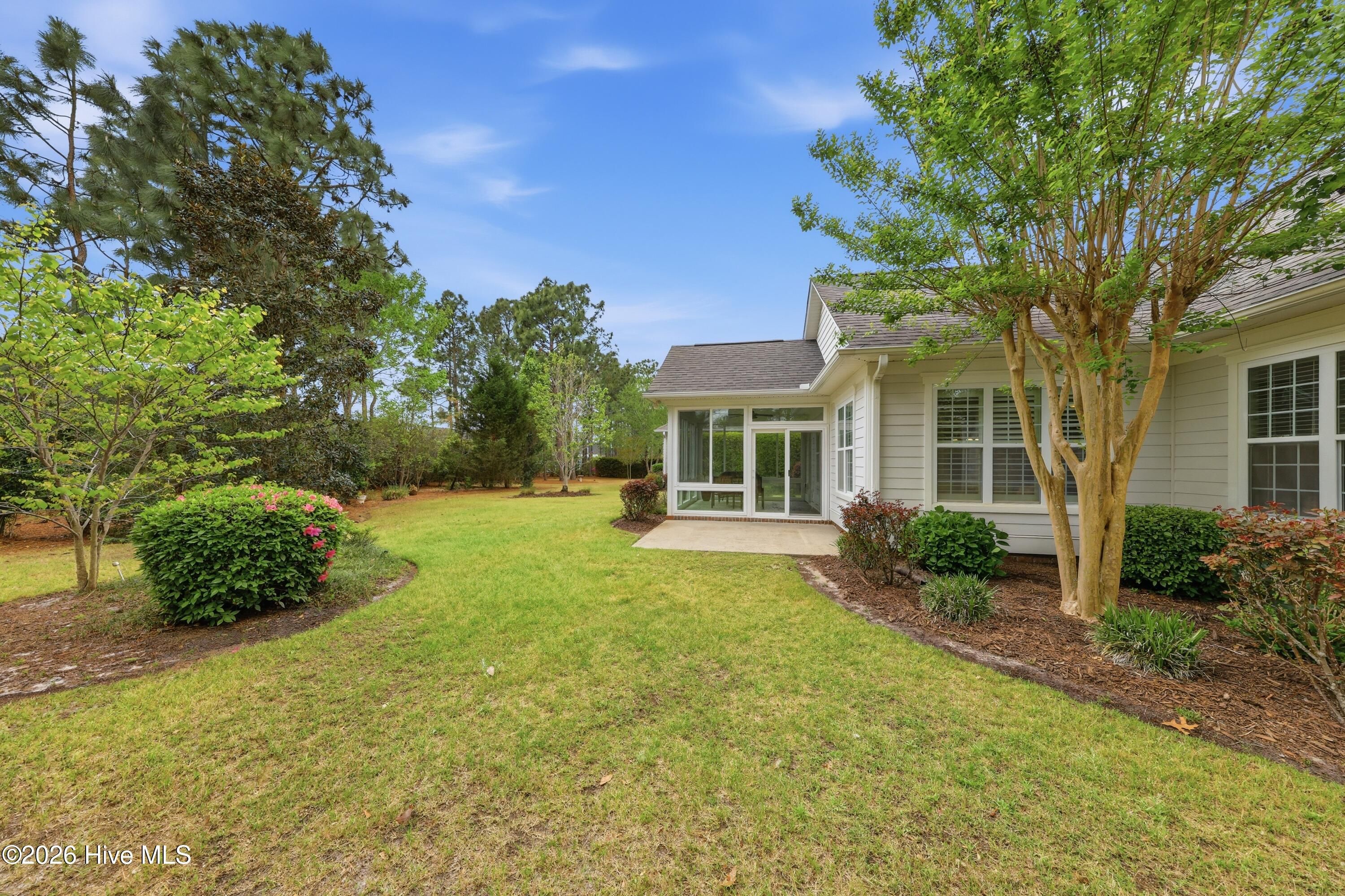 Welcome to a sanctuary of elegance and comfort nestled within the prestigious Compass Pointe community in Leland. Step inside this move-in ready, expansive home where every detail radiates luxury and warmth. Sunlight pours through the long windows of the breakfast nook, adorned with plantation shutters, gently illuminating your morning coffee and inviting you to embrace each day. Delight in the open floor plan, perfect for entertaining and everyday living, with a formal dining space accented by sophisticated chair-rail and wainscoting, and a great room paired with a sunroom featuring rich hardwood flooring. Vaulted ceilings soar overhead, while built-in shelves and a cozy fireplace create a welcoming ambiance. Retreat to the stately master suite, tucked away for privacy, where a spa-inspired bath awaits, boasting a garden tub, walk-in tile shower, double vanity, and an oversized walk-in closet. Entertain with ease in the glassed-in lanai, graced by stamped concrete floors, or enjoy the serenity of the rear yard, thoughtfully landscaped and buffered for your exclusive retreat. The home grants exclusive access to Compass Pointe's resort-style amenities, including the Grand Lanai Clubhouse, Health and Wellness Center, multiple pools, a lazy river, tennis and pickleball courts, and a large events lawn. Golf and social memberships are available at Compass Pointe Golf Club, featuring an 18-hole course, restaurant, and state-of-the-art facilities. Why wait to build when you can enjoy this exceptional home and its savings today?