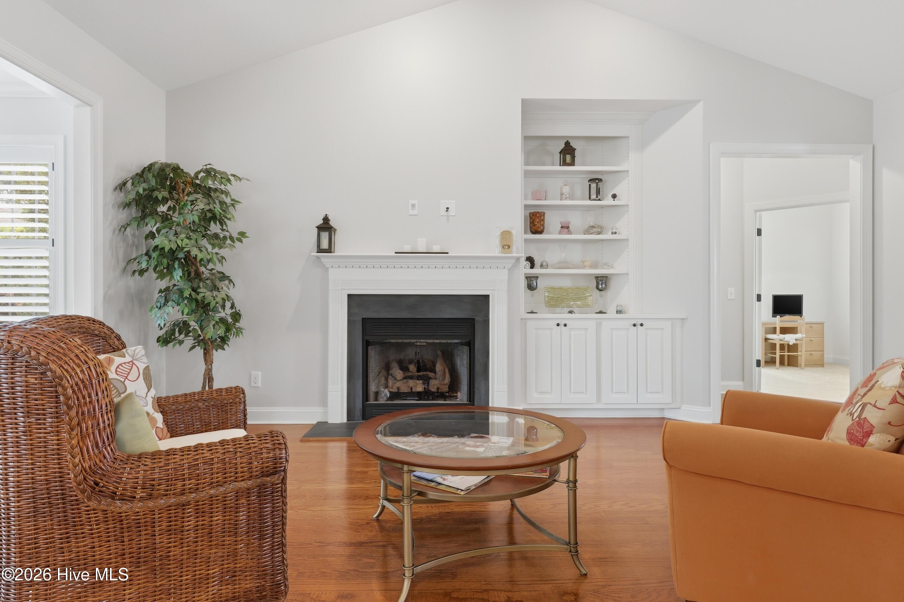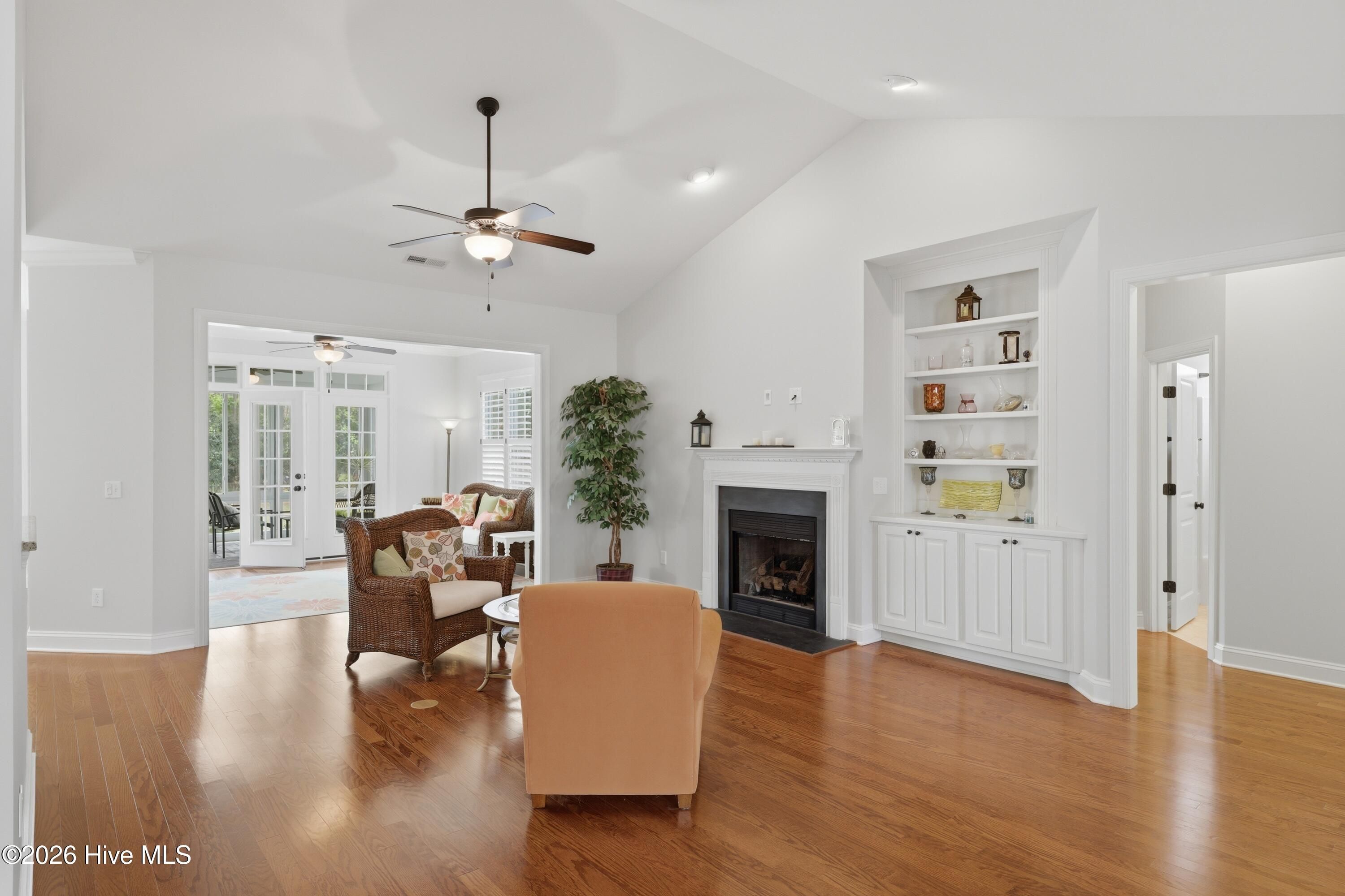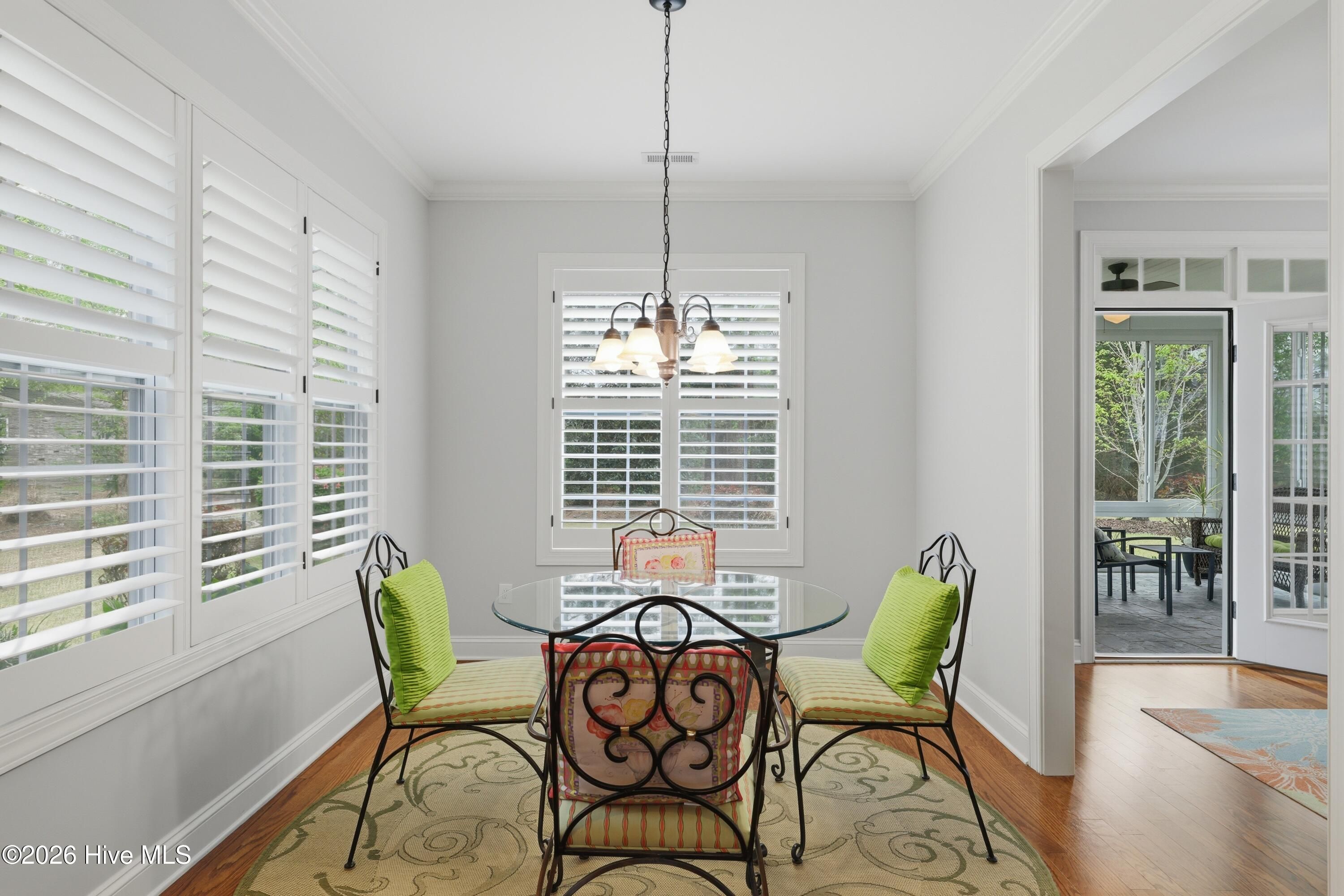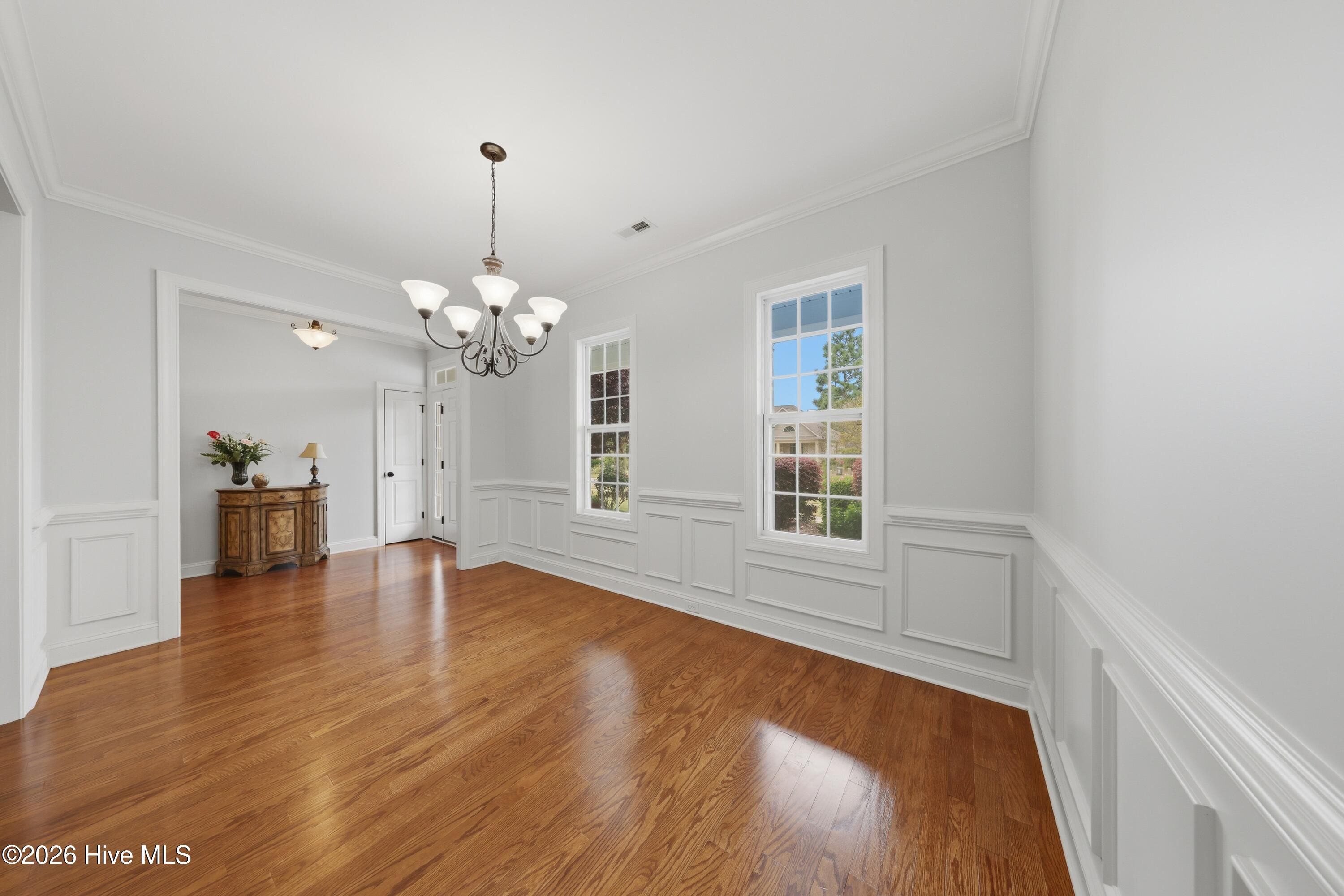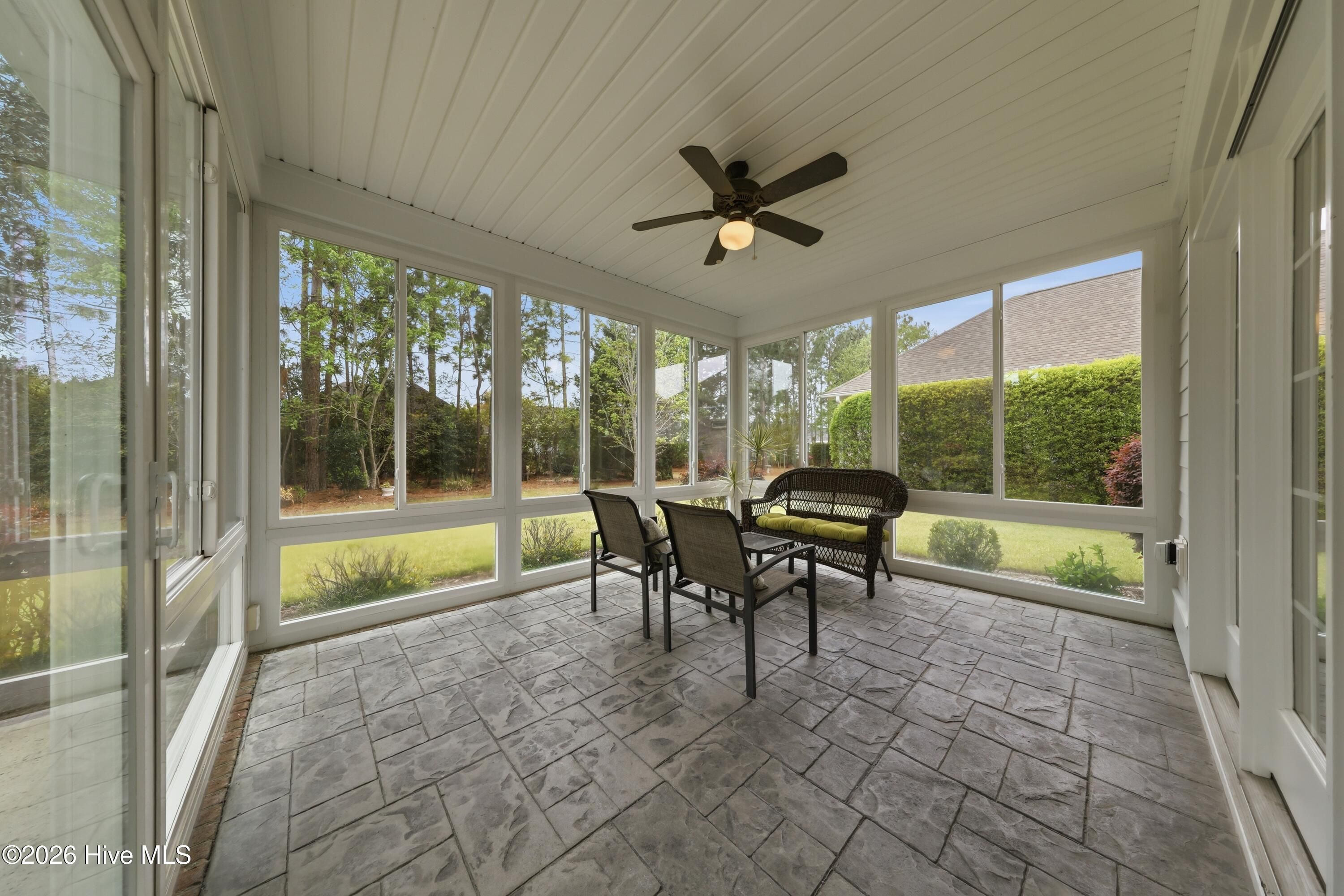 Welcome to a sanctuary of elegance and comfort nestled within the prestigious Compass Pointe community in Leland. Step inside this move-in ready, expansive home where every detail radiates luxury and warmth. Sunlight pours through the long windows of the breakfast nook, adorned with plantation shutters, gently illuminating your morning coffee and inviting you to embrace each day. Delight in the open floor plan, perfect for entertaining and everyday living, with a formal dining space accented by sophisticated chair-rail and wainscoting, and a great room paired with a sunroom featuring rich hardwood flooring. Vaulted ceilings soar overhead, while built-in shelves and a cozy fireplace create a welcoming ambiance. Retreat to the stately master suite, tucked away for privacy, where a spa-inspired bath awaits, boasting a garden tub, walk-in tile shower, double vanity, and an oversized walk-in closet. Entertain with ease in the glassed-in lanai, graced by stamped concrete floors, or enjoy the serenity of the rear yard, thoughtfully landscaped and buffered for your exclusive retreat. The home grants exclusive access to Compass Pointe's resort-style amenities, including the Grand Lanai Clubhouse, Health and Wellness Center, multiple pools, a lazy river, tennis and pickleball courts, and a large events lawn. Golf and social memberships are available at Compass Pointe Golf Club, featuring an 18-hole course, restaurant, and state-of-the-art facilities. Why wait to build when you can enjoy this exceptional home and its savings today?