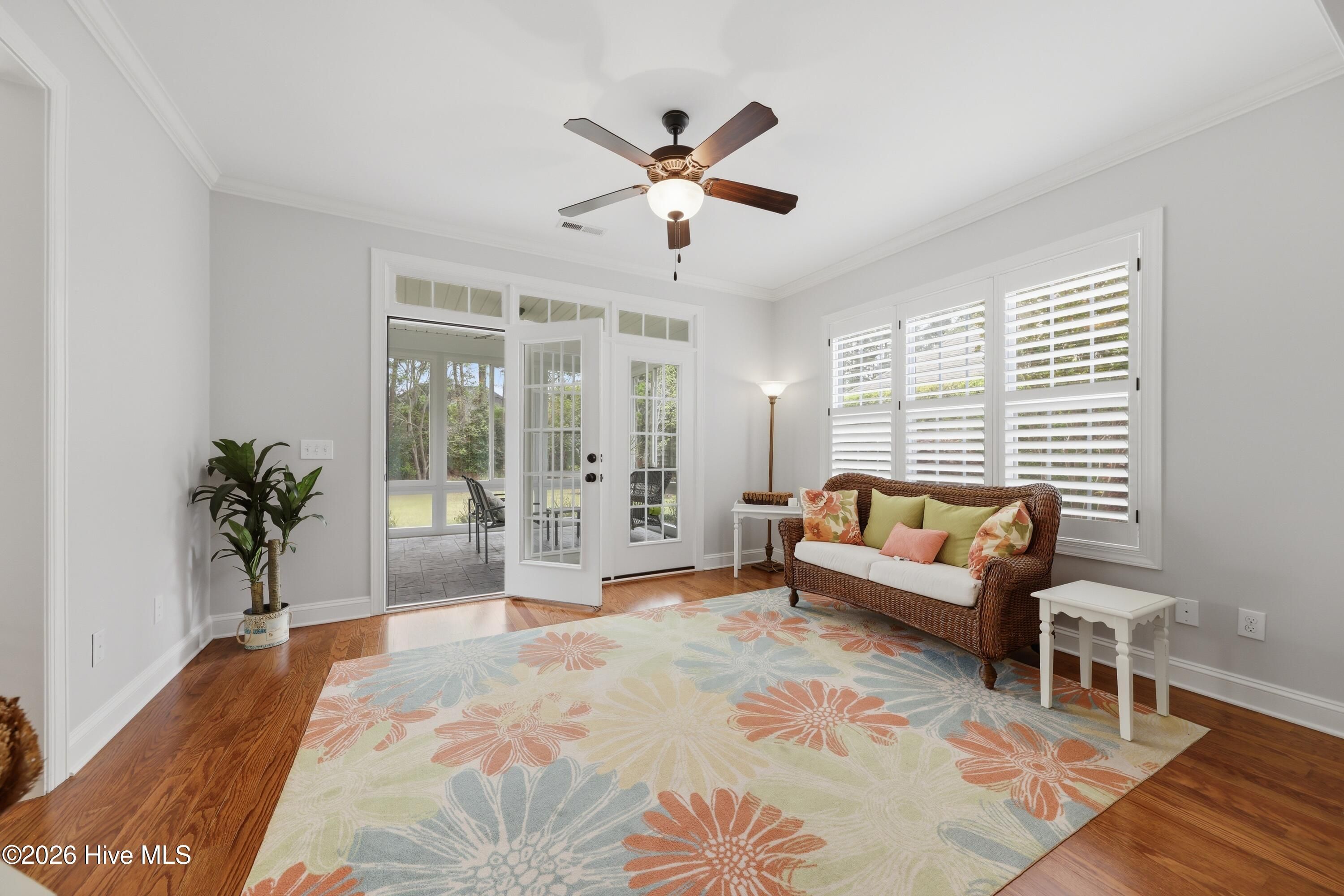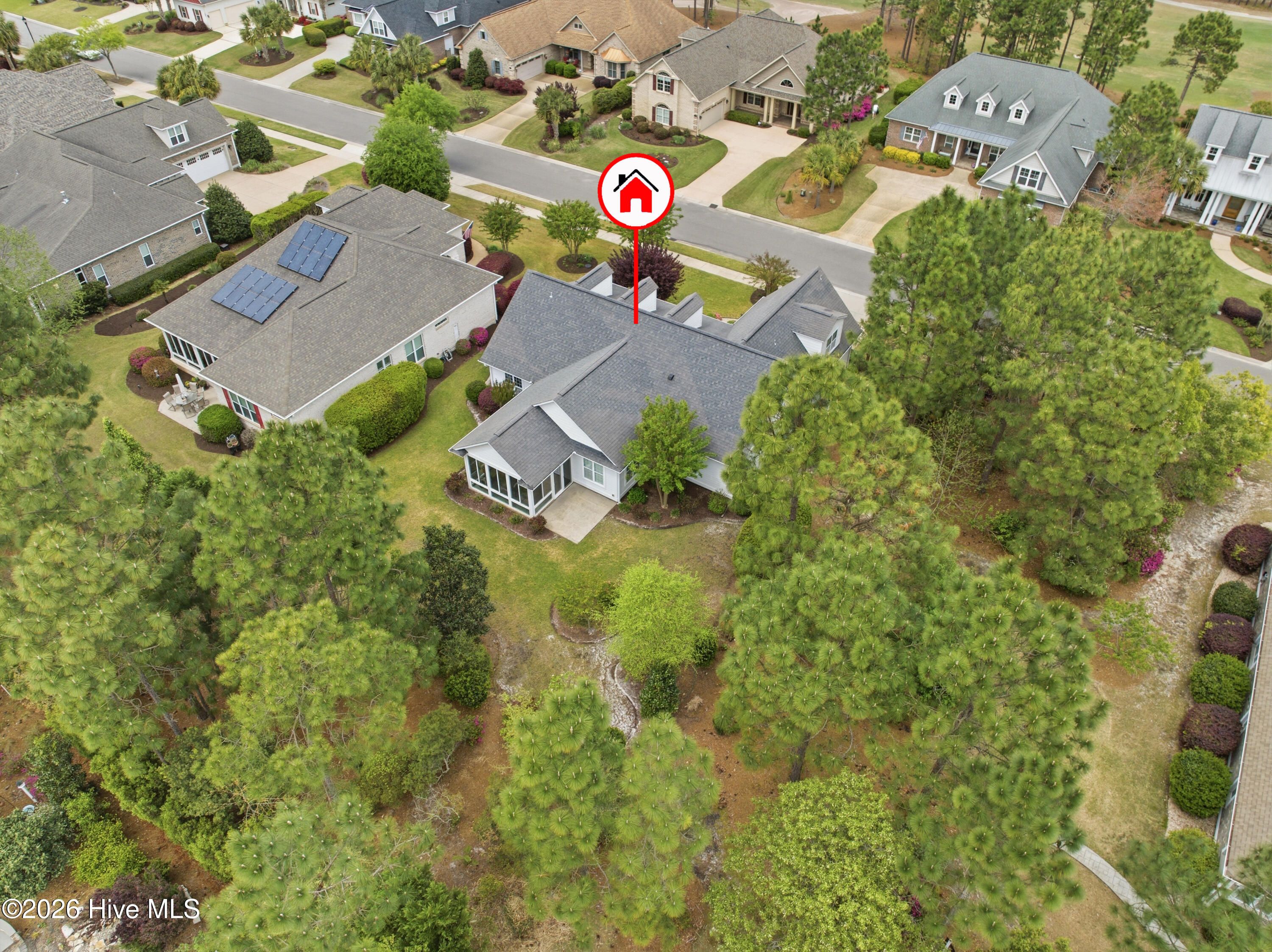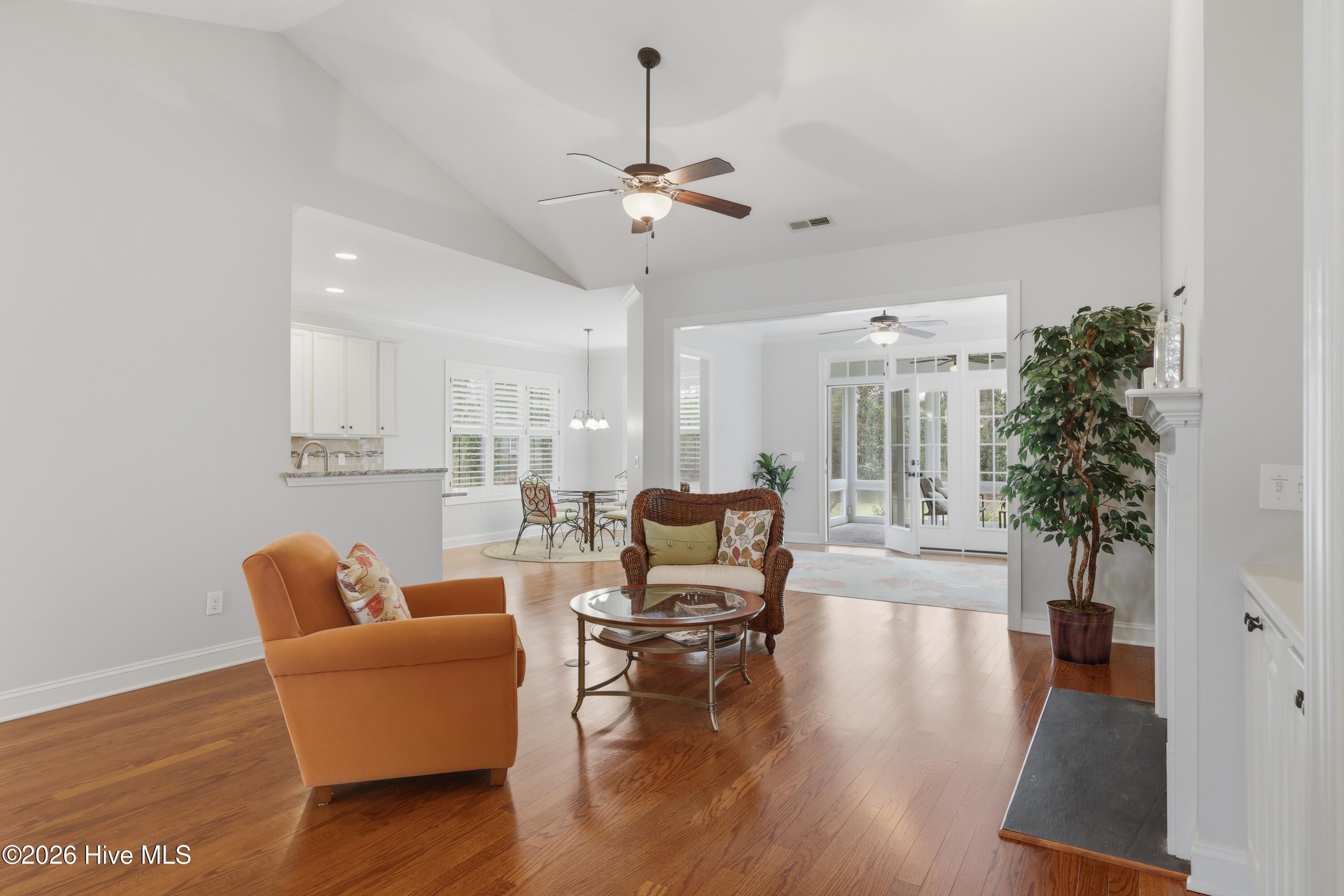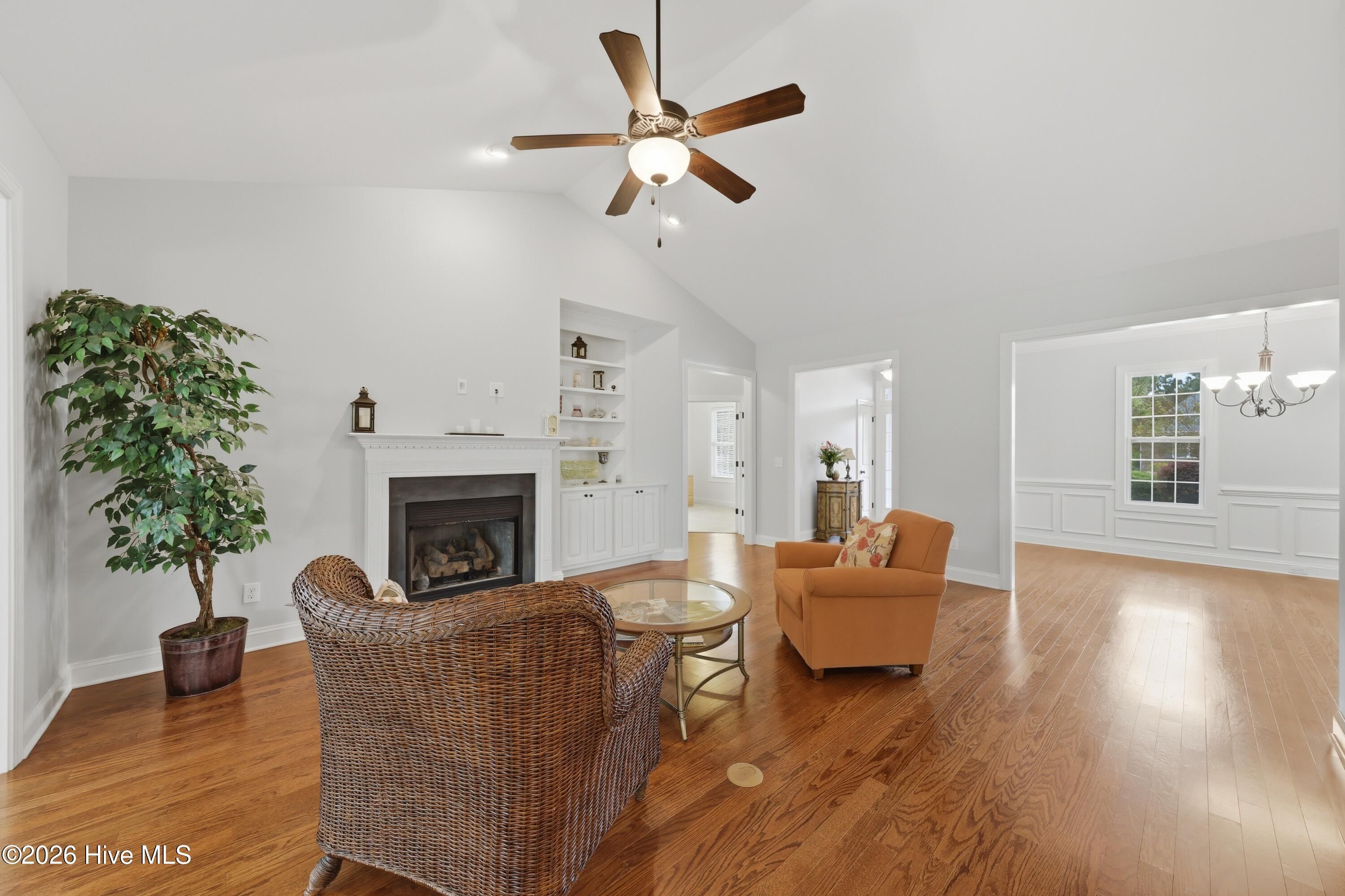 Welcome to a sanctuary of elegance and comfort nestled within the prestigious Compass Pointe community in Leland. Step inside this move-in ready, expansive home where every detail radiates luxury and warmth. Sunlight pours through the long windows of the breakfast nook, adorned with plantation shutters, gently illuminating your morning coffee and inviting you to embrace each day. Delight in the open floor plan, perfect for entertaining and everyday living, with a formal dining space accented by sophisticated chair-rail and wainscoting, and a great room paired with a sunroom featuring rich hardwood flooring. Vaulted ceilings soar overhead, while built-in shelves and a cozy fireplace create a welcoming ambiance. Retreat to the stately master suite, tucked away for privacy, where a spa-inspired bath awaits, boasting a garden tub, walk-in tile shower, double vanity, and an oversized walk-in closet. Entertain with ease in the glassed-in lanai, graced by stamped concrete floors, or enjoy the serenity of the rear yard, thoughtfully landscaped and buffered for your exclusive retreat. The home grants exclusive access to Compass Pointe's resort-style amenities, including the Grand Lanai Clubhouse, Health and Wellness Center, multiple pools, a lazy river, tennis and pickleball courts, and a large events lawn. Golf and social memberships are available at Compass Pointe Golf Club, featuring an 18-hole course, restaurant, and state-of-the-art facilities. Why wait to build when you can enjoy this exceptional home and its savings today?