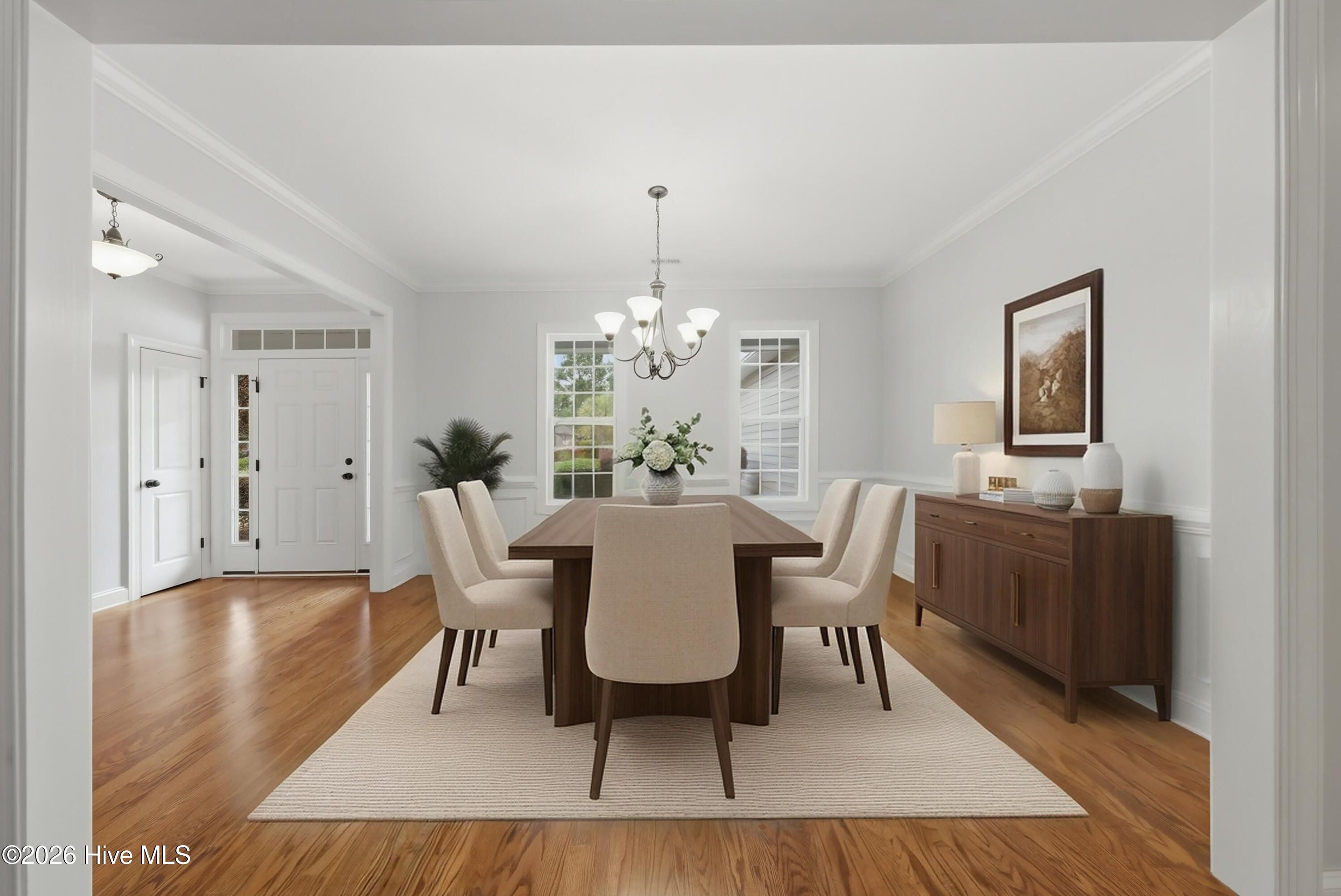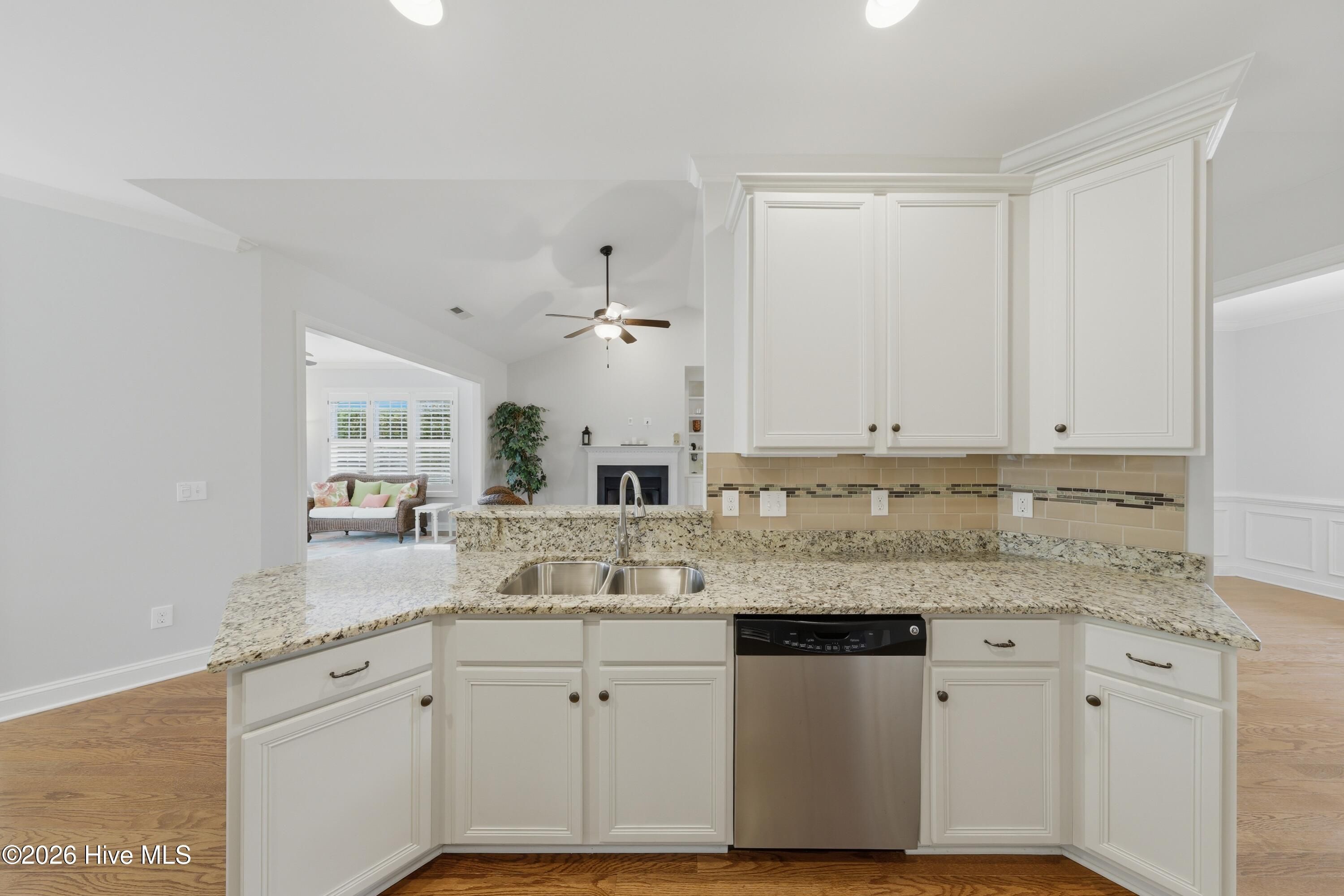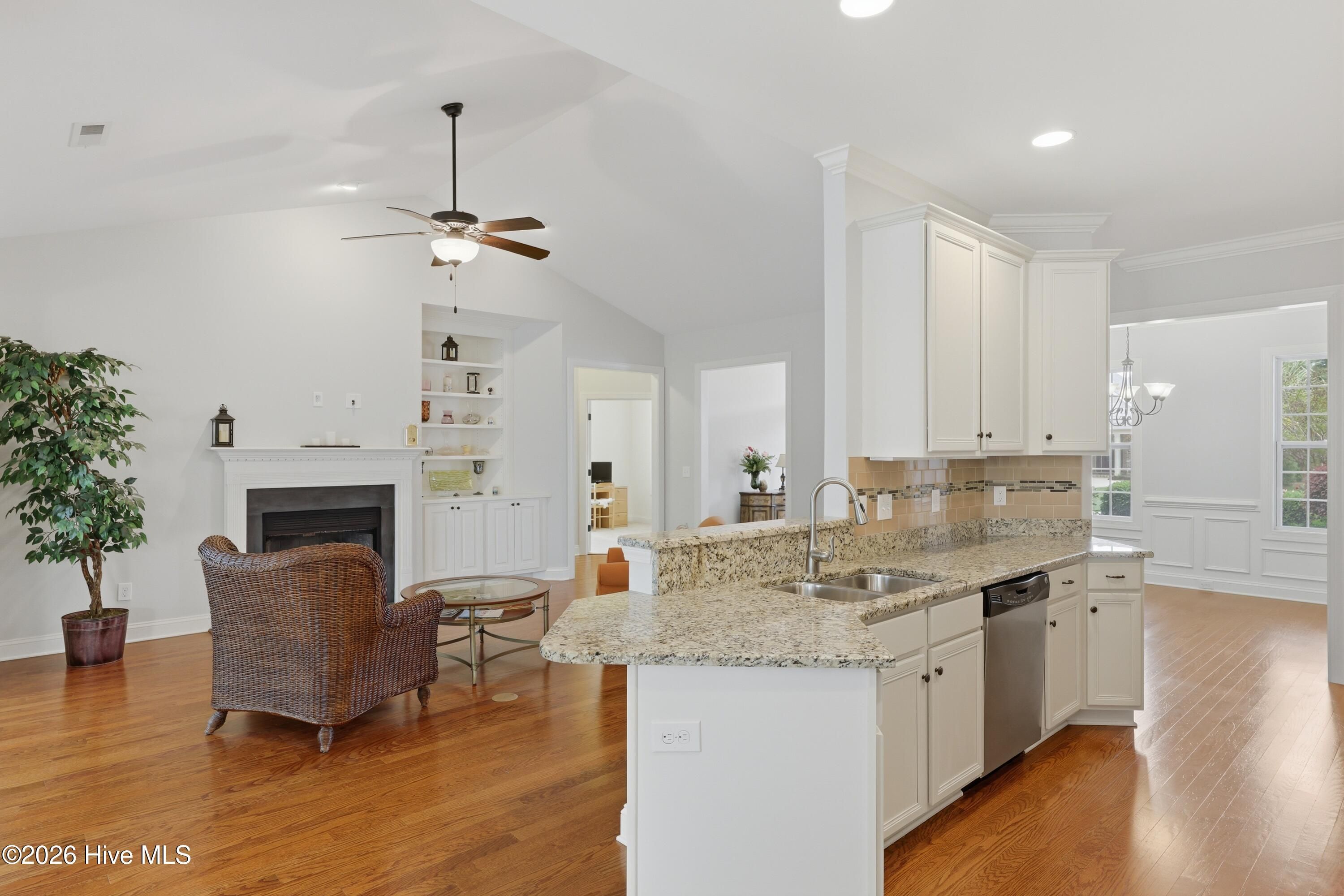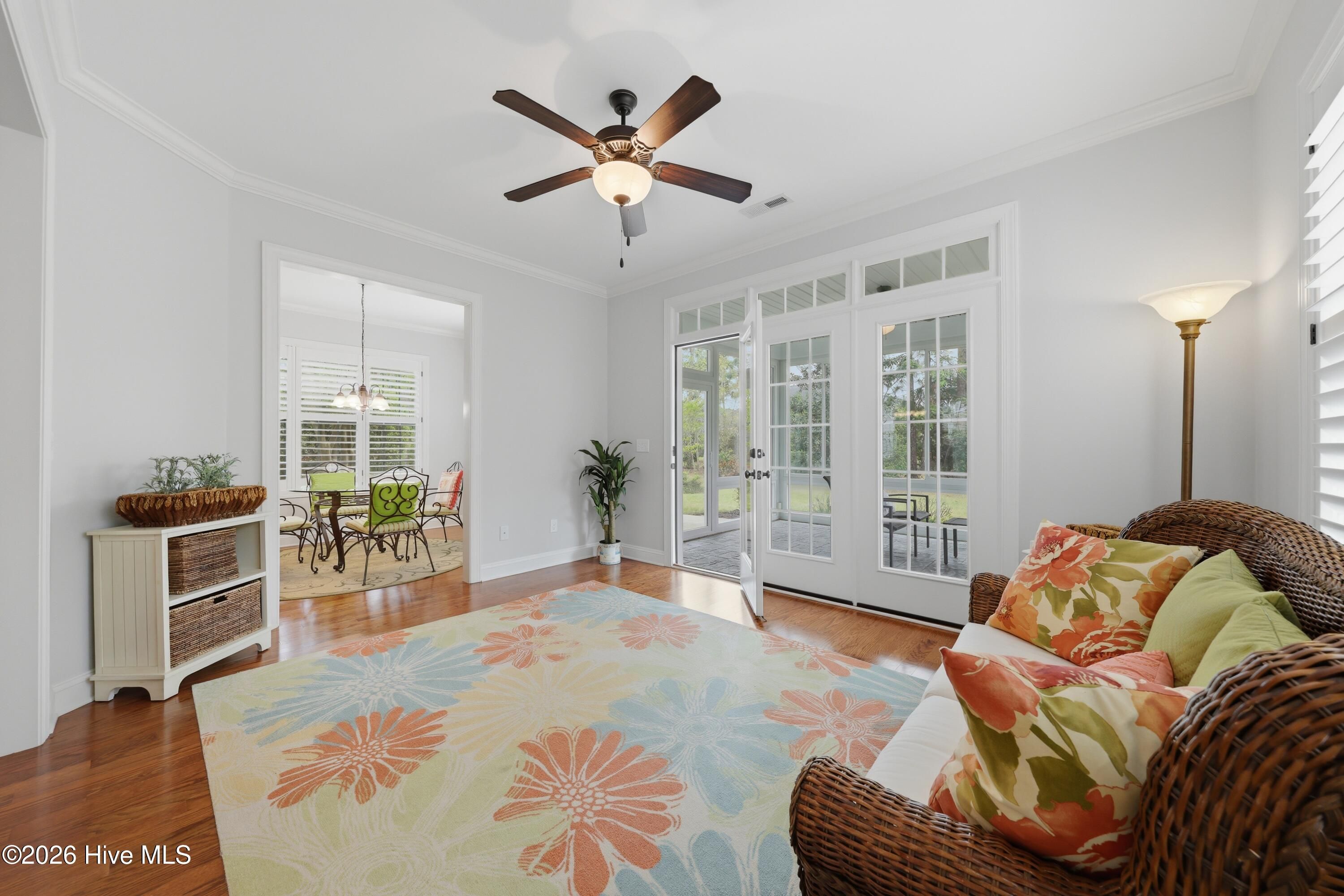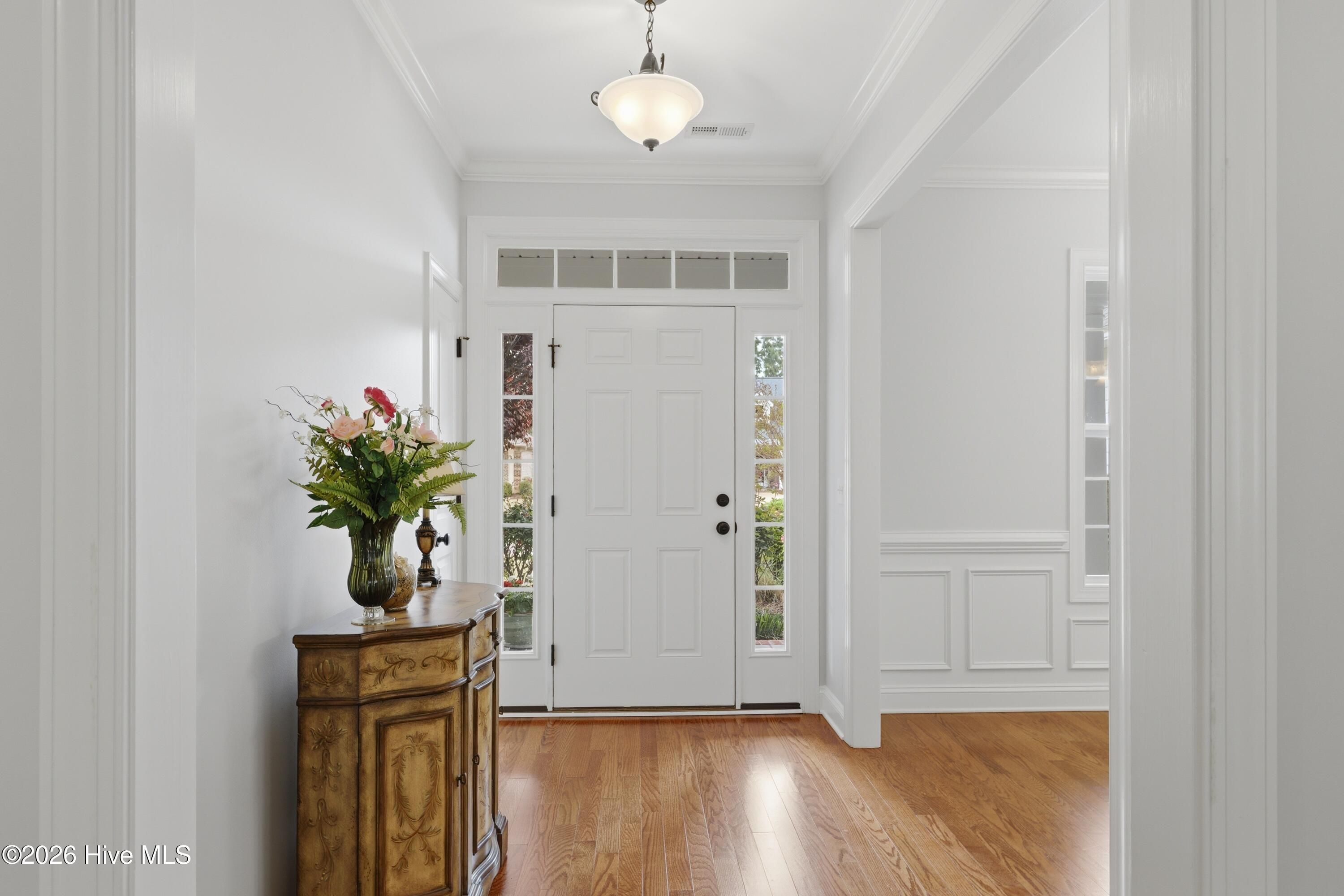 Welcome to a sanctuary of elegance and comfort nestled within the prestigious Compass Pointe community in Leland. Step inside this move-in ready, expansive home where every detail radiates luxury and warmth. Sunlight pours through the long windows of the breakfast nook, adorned with plantation shutters, gently illuminating your morning coffee and inviting you to embrace each day. Delight in the open floor plan, perfect for entertaining and everyday living, with a formal dining space accented by sophisticated chair-rail and wainscoting, and a great room paired with a sunroom featuring rich hardwood flooring. Vaulted ceilings soar overhead, while built-in shelves and a cozy fireplace create a welcoming ambiance. Retreat to the stately master suite, tucked away for privacy, where a spa-inspired bath awaits, boasting a garden tub, walk-in tile shower, double vanity, and an oversized walk-in closet. Entertain with ease in the glassed-in lanai, graced by stamped concrete floors, or enjoy the serenity of the rear yard, thoughtfully landscaped and buffered for your exclusive retreat. The home grants exclusive access to Compass Pointe's resort-style amenities, including the Grand Lanai Clubhouse, Health and Wellness Center, multiple pools, a lazy river, tennis and pickleball courts, and a large events lawn. Golf and social memberships are available at Compass Pointe Golf Club, featuring an 18-hole course, restaurant, and state-of-the-art facilities. Why wait to build when you can enjoy this exceptional home and its savings today?