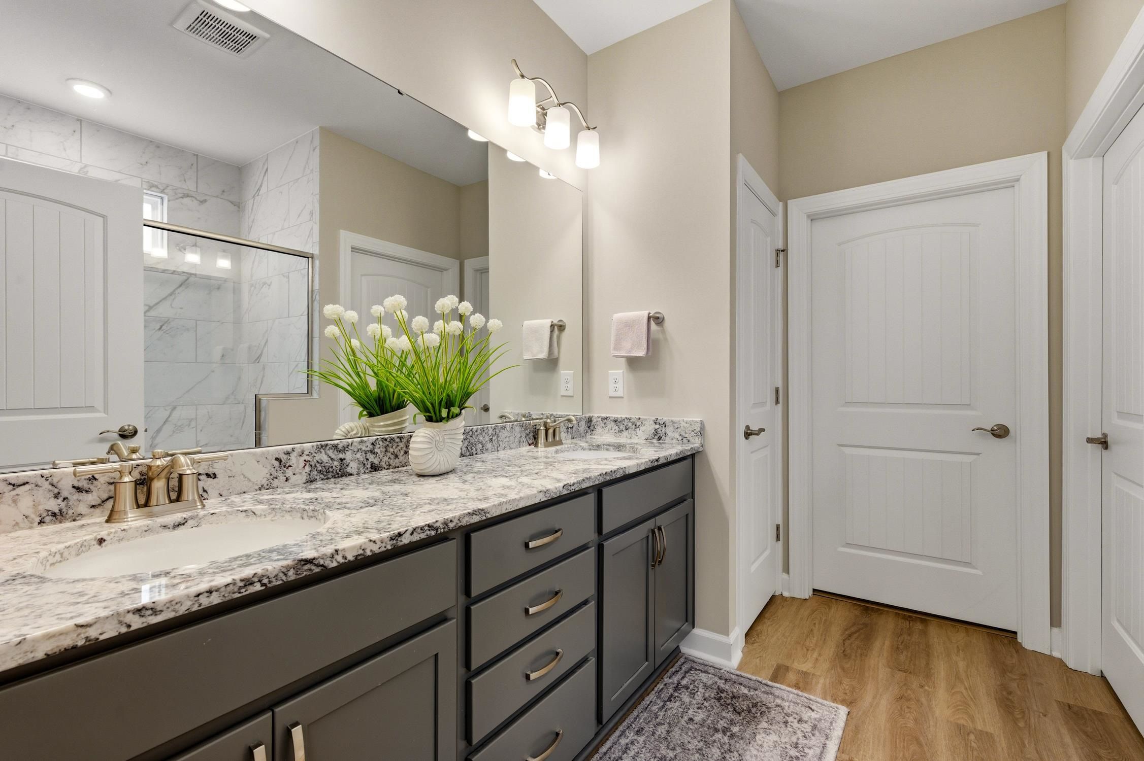 The Newberry perfectly blends relaxed outdoor living with a coastal-inspired interior, inviting you to slip off your sandals and unwind. This home features 4 bedrooms, 3 bathrooms, a private office, a bonus area updaters equipped with a full bathroom, and a two-car garage. An open-concept kitchen, dining, and great room welcomes you from the foyer, with sliding glass doors leading to a beautifully upgraded covered porch—ideal for warm evenings and casual gatherings. Thoughtful upgrades such as stamped concrete throughout, tinted windows, premier curbing, and upgraded landscaping enhance both style and curb appeal. Inside, a spacious drop zone and laundry area make it easy to unload beach gear, with convenient garage storage for chairs and outdoor essentials. The private owner’s suite offers a peaceful retreat with a tray ceiling, oversized walk-in closet, dual vanities, and a seated shower.