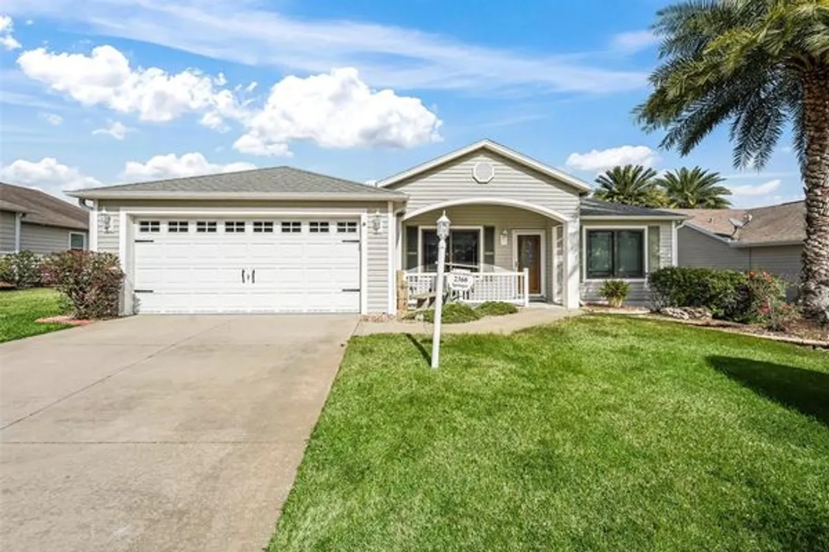 One or more photo(s) has been virtually staged. NEW ROOF!!! Updated FLOORING! Welcome to Hopespring Loop, the best neighbors in The Villages in one of the most sought after areas in St James Place! Expanded SUN KISSED MODEL with an open concept living room/dining/kitchen with a vaulted ceiling and crown molding. Split 3 bedrooms, 2 baths with a two car garage. Updated windows and remote control blinds in living room for ease of use. In the kitchen you have stainless steel appliances and an abundance of cabinet and counter space. Lots of storage in laundry room with a utility sink. Built in closest system in primary bedroom. Double vanity sinks and large shower in the primary en-suite. Enclosed lanai and and outside pergola patio with outlet for a spa. 2 Solar tubes for added natural light. Enjoy your coffee sitting on your rocking chair front porch or in your enclosed Lanai. The home has a water filtration system. Located close to the pool, mailbox and golf course. Great for year around residents, snowbirds, or for a rental investment. Beautiful Lemon tree located in front yard. Now is the time to see it! New Windows and Hot water tank 2022. HVAC 2011. Some photos have been virtually staged.