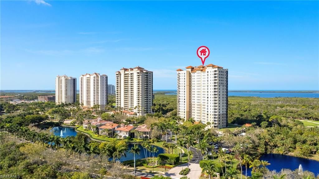 Welcome to your luxurious 8th-floor retreat nestled within the prestigious Sorrento at The Colony. This exquisite condo offers unparalleled vistas spanning 180 degrees of Southwest Florida's breathtaking landscape, showcasing panoramic views of The Colony's Golf fairways, the shimmering Estero Bay, and the majestic Gulf of Mexico.Upon entering this meticulously crafted residence, you're greeted by an ambiance of elegance and sophistication. Windows bathe the living spaces in natural light, inviting the outside beauty to seamlessly merge with the interior comforts. The one-level concept layout effortlessly connects the living room, dining area, and gourmet kitchen, providing an ideal setting for both relaxation and entertainment.Imagine waking up to the sun-kissed panoramas of the Gulf, as each morning begins with a breathtaking masterpiece painted across the horizon. The spacious master suite offers a serene sanctuary, complete with access to your balcony where you can unwind while indulging in the captivating vistas that stretch as far as the eye can see. An additional bedroom + den provide ample space for guests, each offering their unique views of Southwest Florida's coastal paradise.Step outside onto the balcony, where alfresco dining and lounging await against the backdrop of azure waters and lush greenery. Whether savoring your morning coffee or toasting another stunning sunset, this outdoor oasis is sure to enchant and inspire.Amenities at Sorrento include a resort-style pool, social room, additional storage, guest suites, billiards, and a fitness center. The Colony Golf and Bay Club offers 18 hole Jerry Pate-designed championship golf course, tennis courts, pickle ball, heated lap pool, fitness center & spa, 34-acre private island beach park with complimentary boat shuttle to and from the beach, kayak parks, and private waterfront dining at The Bay Club! Best location minutes from dining and shopping!Experience the epitome of coastal living in this exceptional 8th-floor condo at Sorrento, where every moment is elevated by the unparalleled beauty of Southwest Florida's panoramic vistas. Welcome home to a life of luxury, tranquility, and endless possibilities.