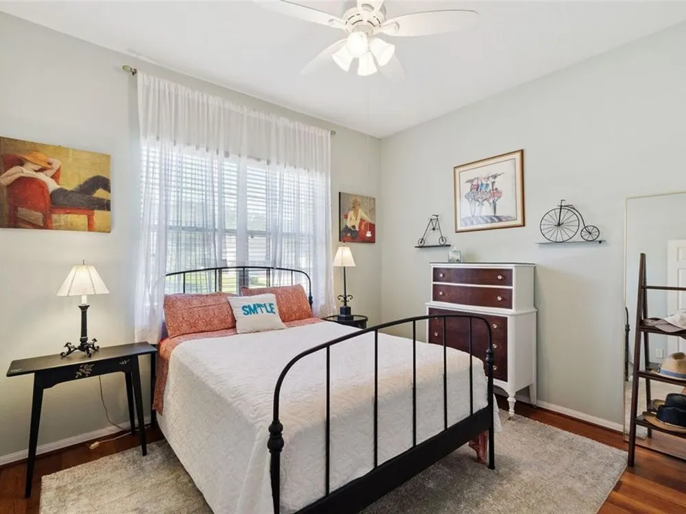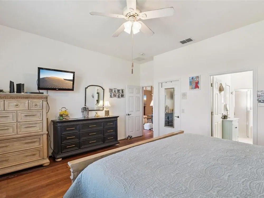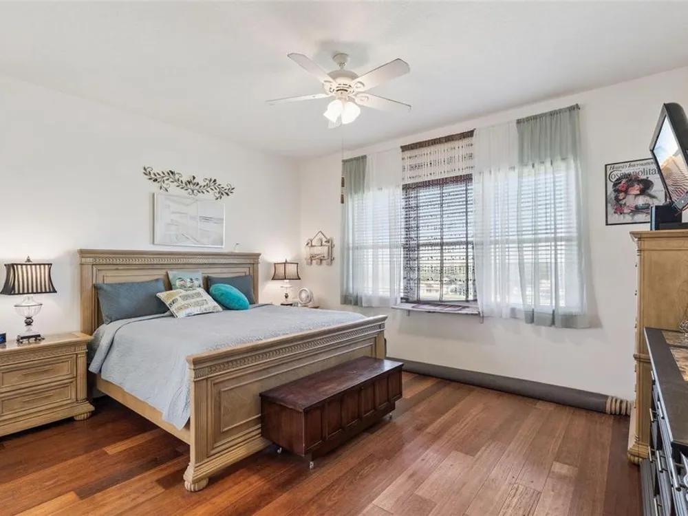 - Ceiling Fan(s), Eat-in Kitchen, High Ceilings, Main Level Primary, Solid Surface Counters, Solid-Wood Cabinets, Split Bedrooms, Stone Counters, Thermostat, Vaulted Ceiling(s), Window Treatments