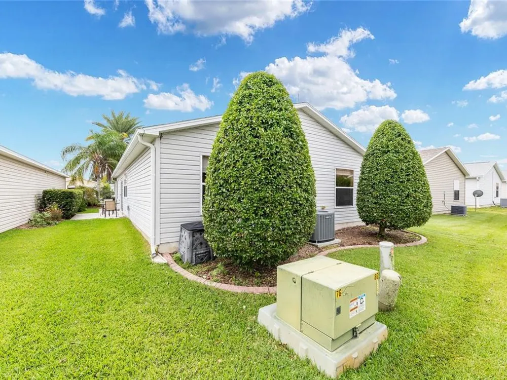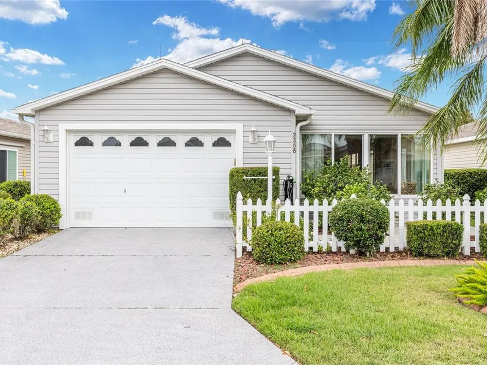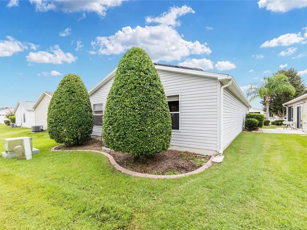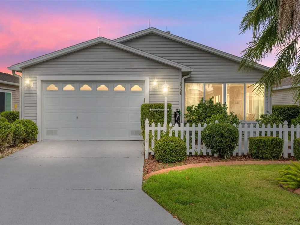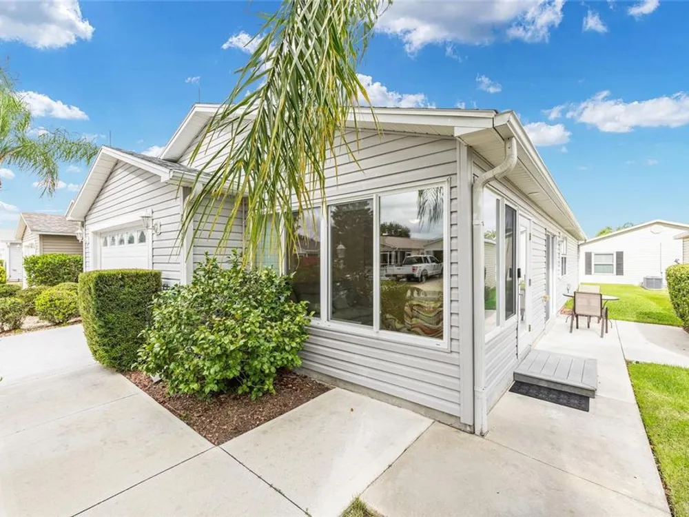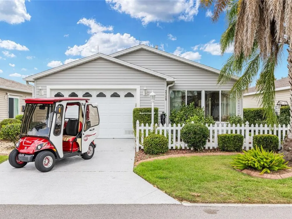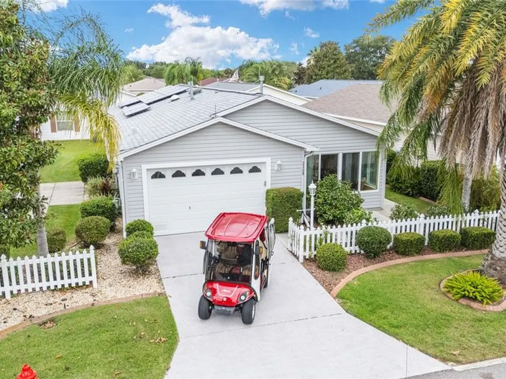 Welcome to the charming Village of Duval! This beautifully maintained Cabot Cove Patio Villa is being offered TURNKEY, complete with a 2011 Yamaha gas golf cart with enclosures, making it the perfect Florida retreat. This home features natural gas, a new roof (2021), electric HVAC (2014), solar panels installed in 2025, a gas water heater (2018) and Quantum Fiber. It also boasts lightning rods and a whole-house Nova water filtration system for added peace of mind. The exterior shines with a painted concrete driveway, professional landscaping, and gutters and downspouts for easy maintenance. Inside, you’ll find an added den/study, giving you extra square footage for flexible living—ideal as an office, craft room, or cozy reading nook. The open floor plan includes inside laundry and a huge pantry, and the home is filled with natural light thanks to three solar tubes in the kitchen and bathrooms. The dining and living areas open to a lovely outdoor patio through sliding glass doors—perfect for enjoying the Florida lifestyle! The primary suite features a spacious walk-in closet, a private water closet, and even a bidet for a touch of luxury. The guest bathroom offers a convenient tub/shower combo. Need storage? The garage is fully equipped with epoxy flooring, custom cabinets, and a built-in workbench. Not Far From Activities! Lake Sumter Market Square™ 3.4M, Brownwood Paddock Square™ 4 M, Duval Adult Pool and Mail Station .4M!! This home is packed with extras and ready for you to move in and enjoy. Don’t miss the drone video tour included with the listing.