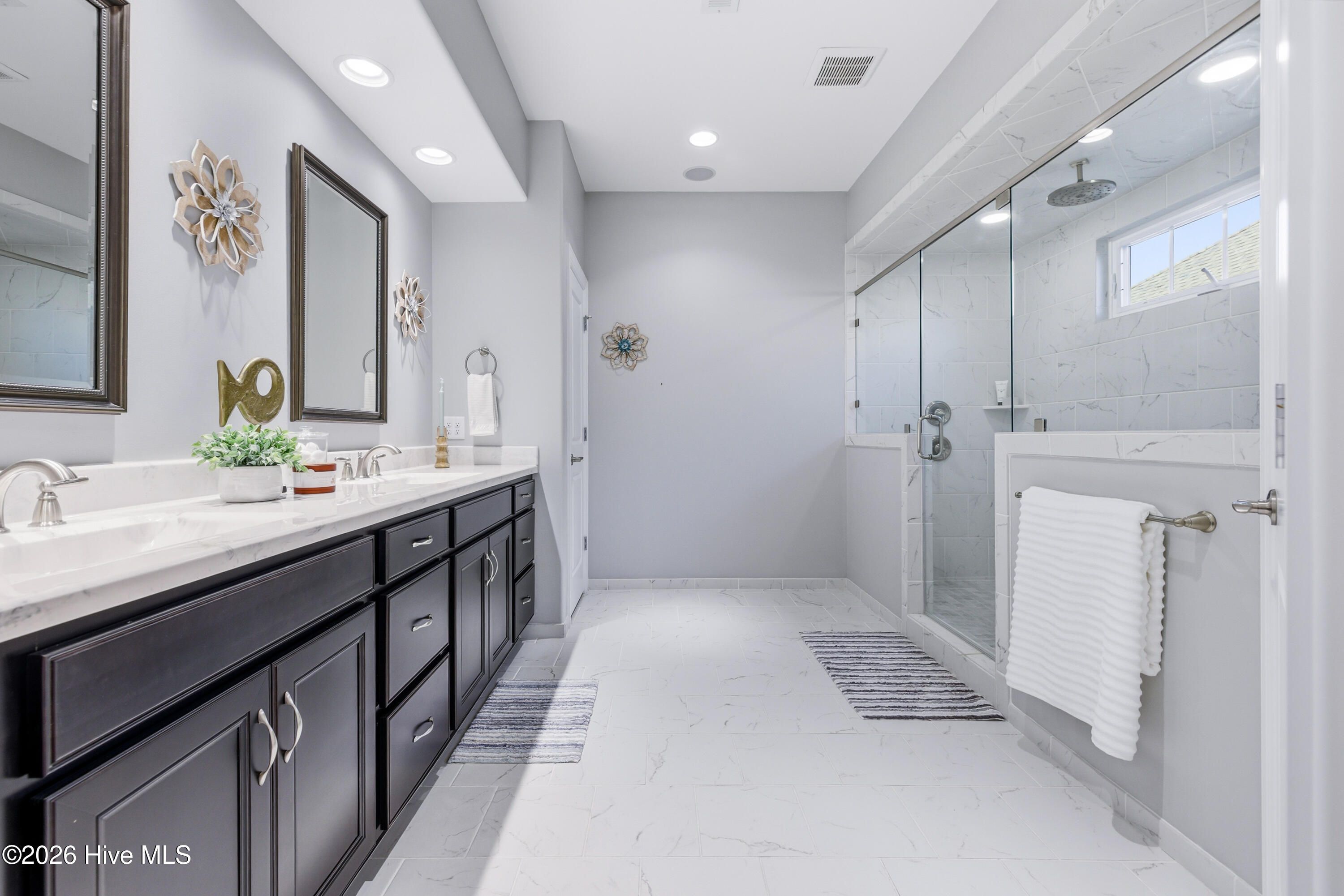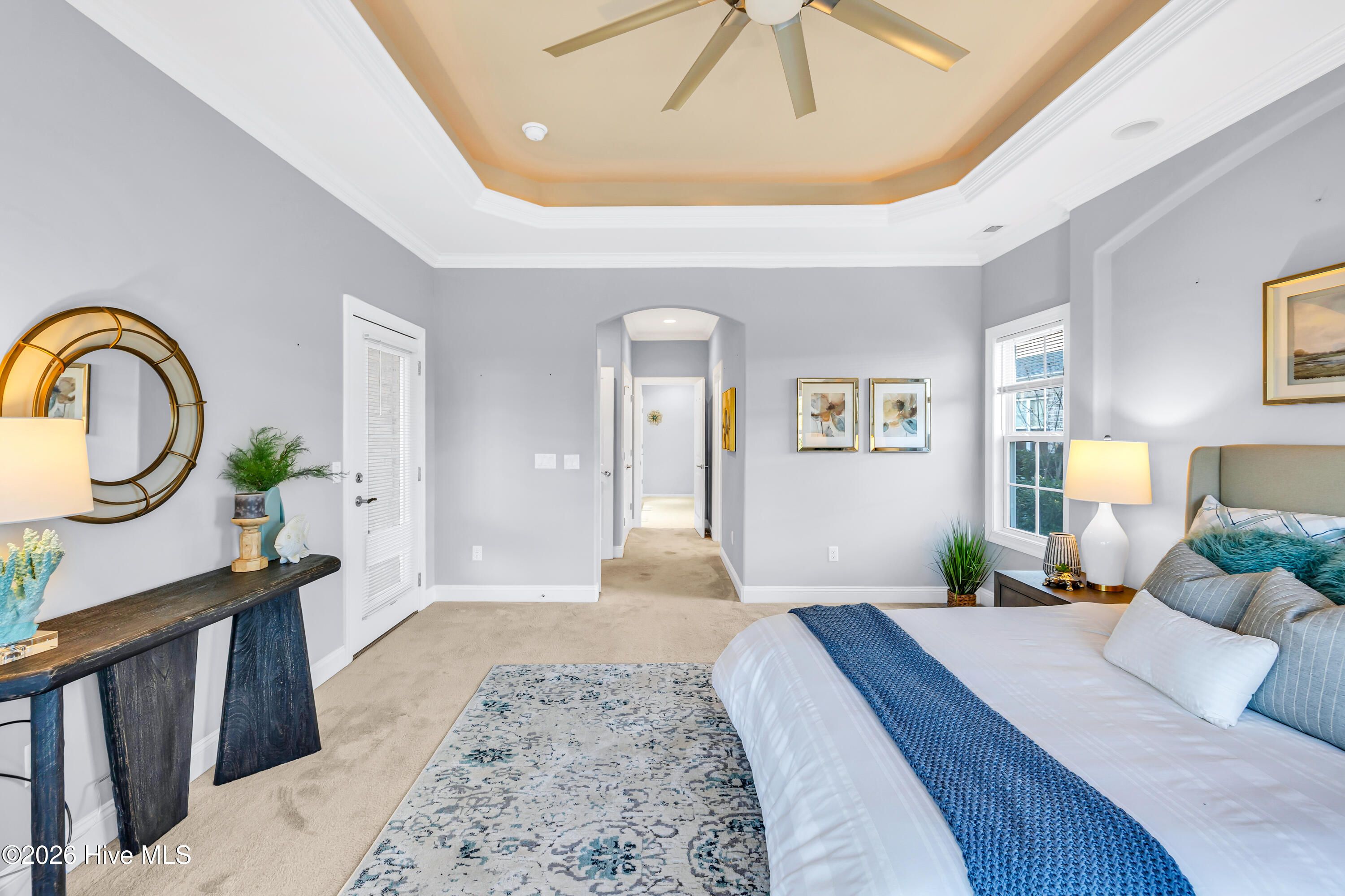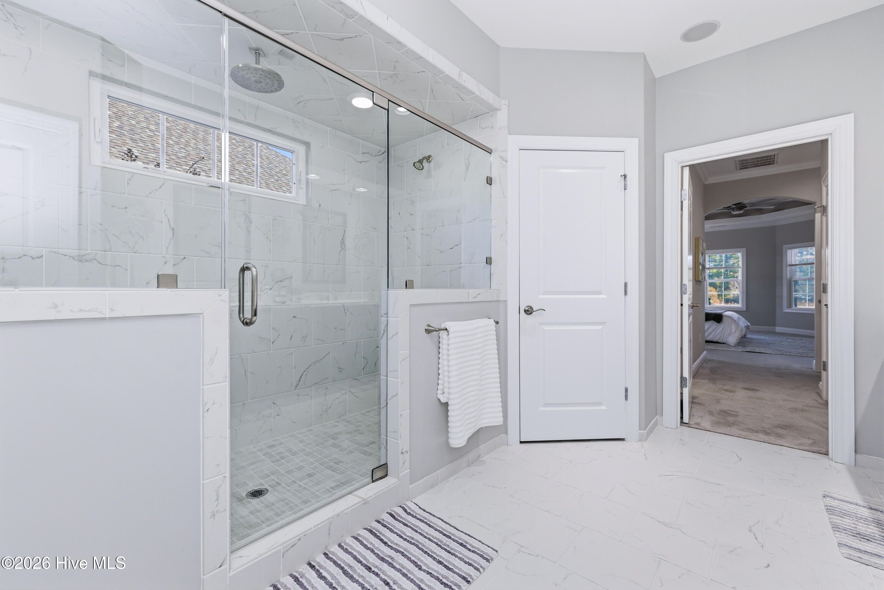 - Master Downstairs, Walk-In Closet(s), Tray Ceiling(s), High Ceilings, Entrance Foyer, Bookcases, Kitchen Island, Ceiling Fan(s), Walk-In Shower, Blinds