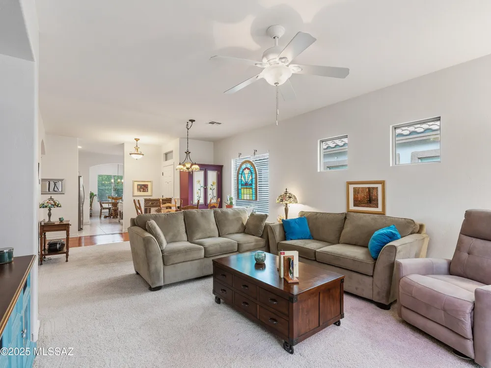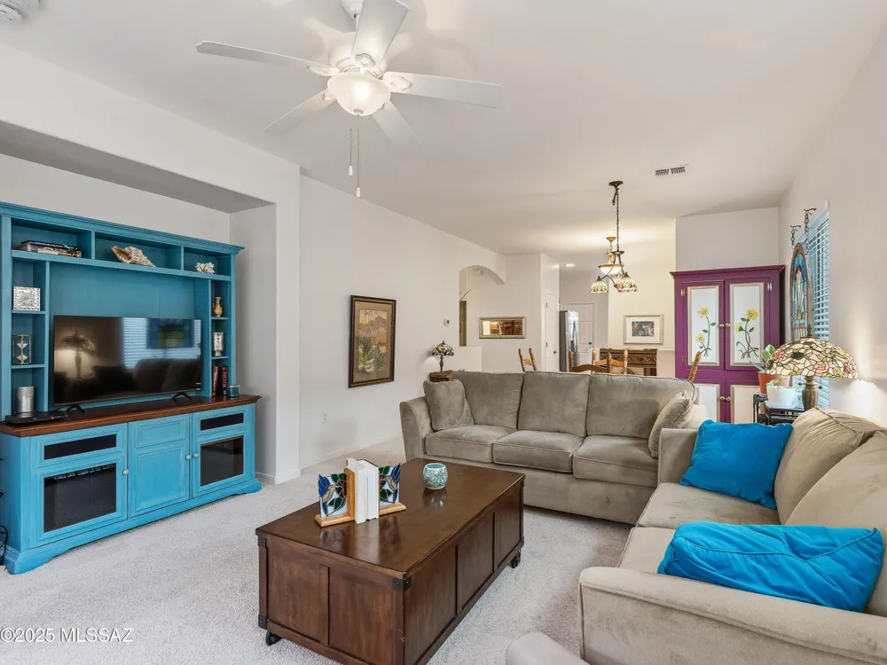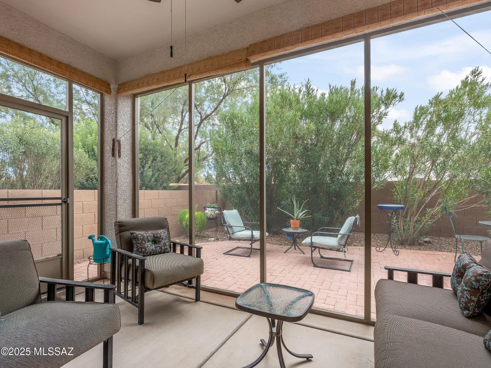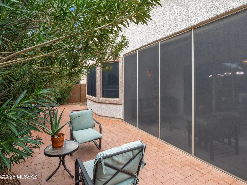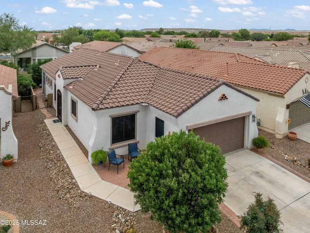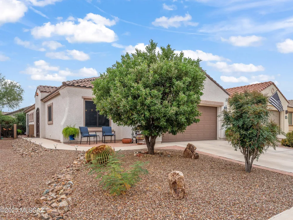 Immaculate home in the 55+ Sonora by Del Webb community--on the market for the first time! Lovingly updated, this home offers wonderful outdoor living with a lush, shaded backyard with pavers, tall oleanders, timed irrigation system, and a large screened-in patio--perfect for relaxing or entertaining. Inside, the floor plan flows seamlessly from the living room to the dining area and kitchen with breakfast nook and all windows are complete with sun screens. The primary suite features a spacious walk-in closet, laundry room, and peaceful backyard views, with a split-bedroom layout for privacy. Enjoy exclusive access to the Sonora Clubhouse with pool, spa, fitness center, and social events, plus all Rancho Sahuarita amenities including the stocked lake, water park, trails, and dog parks.