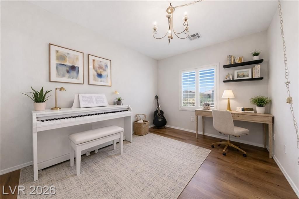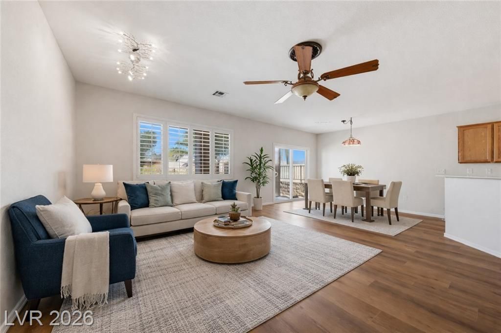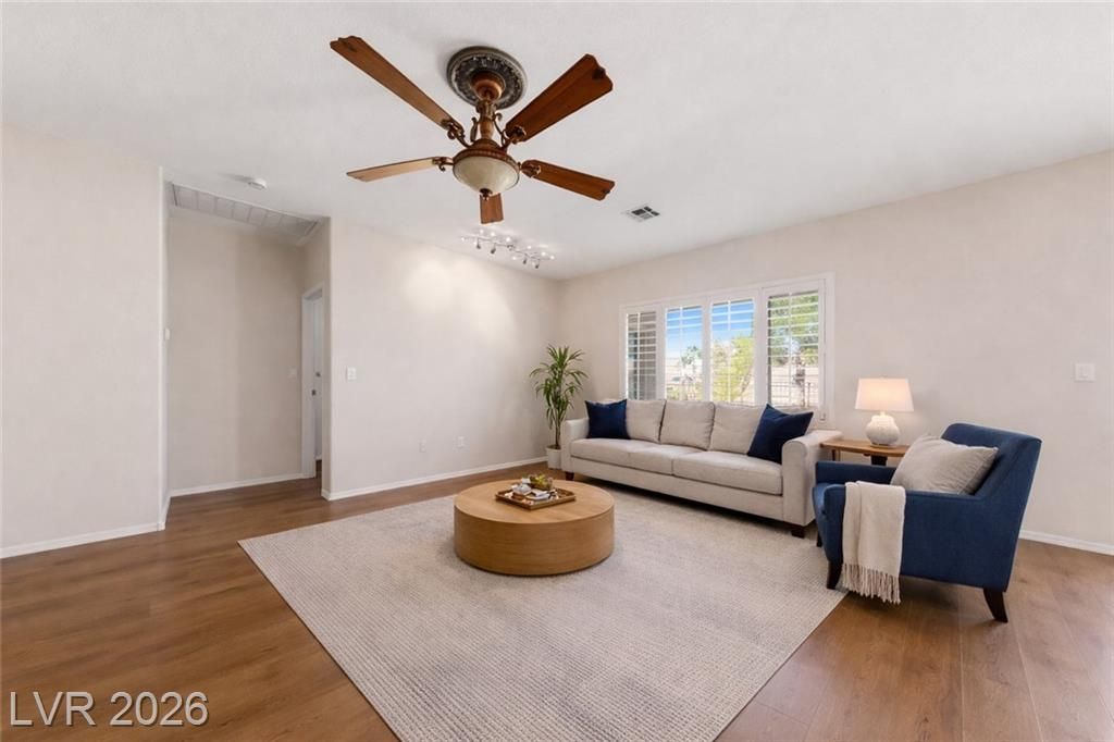 Welcome to this beautiful “Virginia” model in the Sun City Anthem 55+ community! Situated on an elevated corner lot, this 1,610 sq ft home offers privacy, curb appeal, and peaceful surroundings. Inside, you’ll find a thoughtfully designed layout featuring 2 spacious bedrooms plus a versatile den—perfect for a home office, music room, hobby room, or additional guest space. The home has been refreshed with brand new vinyl plank flooring throughout and fresh interior paint, giving it a modern, move-in ready feel. The open-concept living and dining areas flow seamlessly into the kitchen, creating an inviting space for both everyday living and entertaining. A 2-car garage provides ample storage and convenience. Enjoy all the amenities Sun City Anthem has to offer, including nearby golf courses, fitness centers, pools, and a vibrant social calendar—perfect for active retirement living.