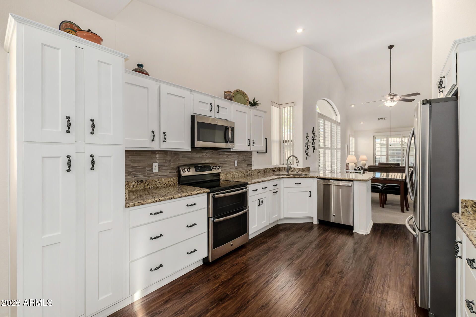 Fabulous Oakwood Villa in GATED Adult Community of Sun Lakes. This Corner Unit Portofino Model features a Huge Open Floor Plan with Extensive Windows & Vaulted Ceilings! REMODELED Open Kitchen features Granite Countertops, Breakfast Bar, Eat-In Kitchen, Cabinetry with Soft Close Drawers, Stainless Appliances, Plenty of Counter Space & Storage. Dedicated Separate Laundry Room with Cabinets. Huge Great Room, Dining Area & Plantation Shutters throughout. Light & Bright! Oversized Master Suite features Dual Vanity Sinks, New Shower Enclosure & Massive Walk in Closet. 2nd Bedroom is Perfect for Guest or Home Office! Covered Outdoor Patio overlooks Green Lush Grass! BRAND NEW ROOF (2025) TRANE AC UNIT (2018) NEW RO SYSTEM (2025) WATER HEATER (2019) Amazing Property!
