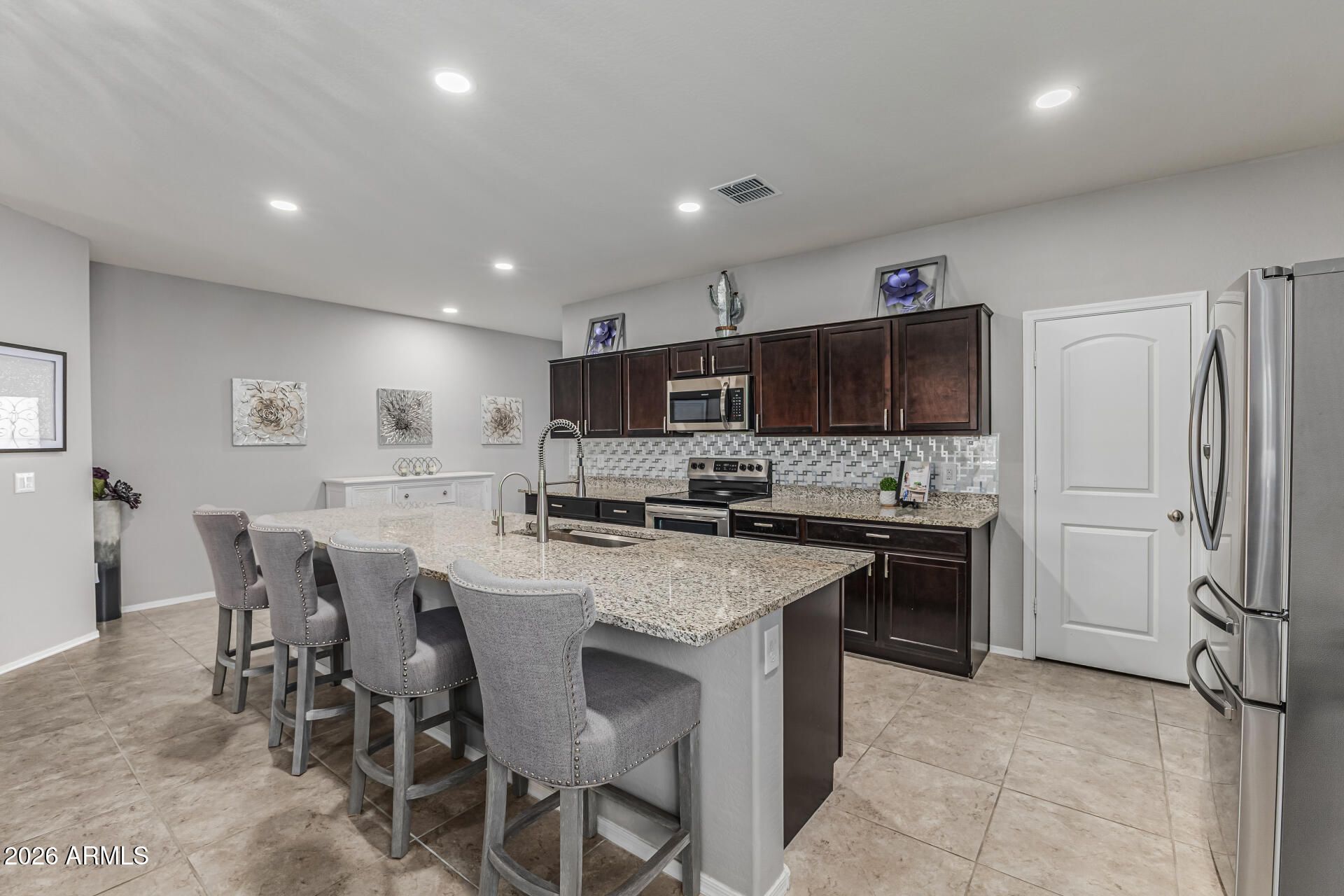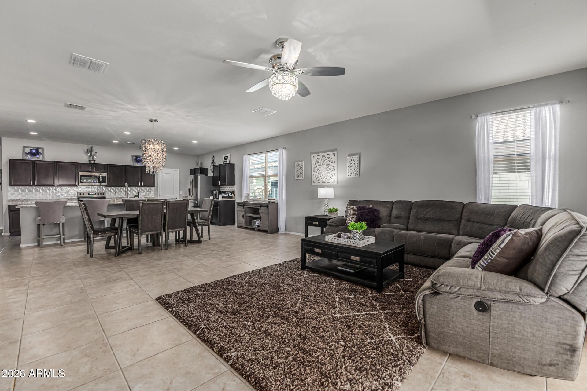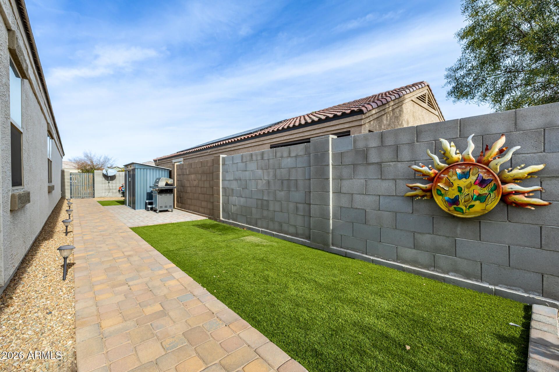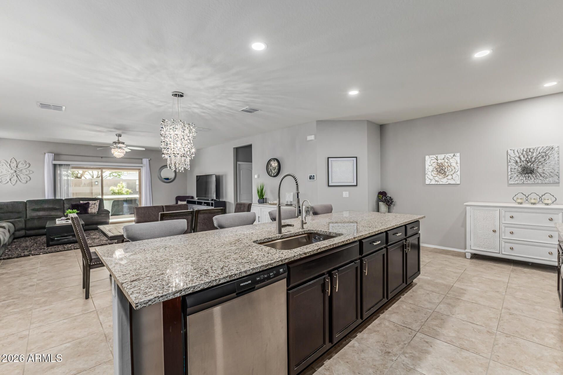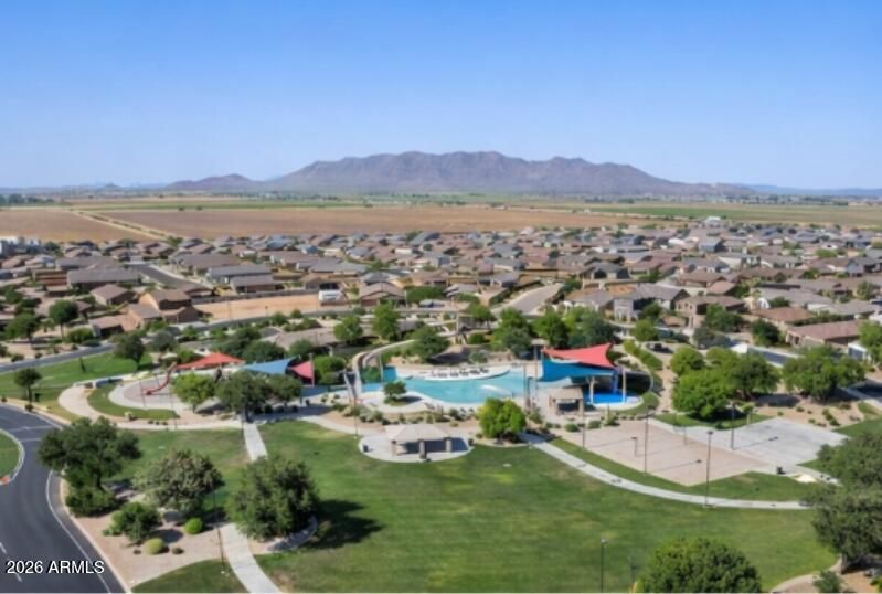 This beautiful single level home sits on a premium corner lot in the popular Mission Royale community, known for its water park with slides, parks, & scenic walking paths. The oversized 9,000+ SF lot feels like a private resort with a sparkling Pebble Tec pool, artificial turf, putting green, pergolas & custom pavers that make it feel like a true backyard getaway. Inside, the open concept floor plan is bright & welcoming with tile flooring in the main living areas & carpet in the bedrooms. The oversized kitchen is a showstopper with a large granite island, custom backsplash, espresso cabinets, large walk-in pantry, RO system, stainless steel appliances & space for bar seating, making it perfect for entertaining. The spacious family room & dining area has decorative lighting that adds a stylish touch throughout the home. The oversized primary suite offers a large walk in closet & a beautifully upgraded bathroom with dual sinks, quartz counter vanity, with custom tile backsplash, cabinets & designer finishes. Additional features include 2nd guest bathroom upgraded, an inside laundry room with washer & dryer included, blinds throughout, ceiling fans in every room & two tone interior paint. This home truly shines with its incredible backyard that has been professionally finished with mature landscaping & fully functional for backyard fun. Also, paid off solar panels for the pool help keep energy costs low for your pool heating. Mission Royale is a wonderful community with so much to do & with the oasis water park, parks, basketball & volleyball there is something for everyone to enjoy. Close to freeway, restaurants & shopping. Truly Turn-Key ready waiting for you.