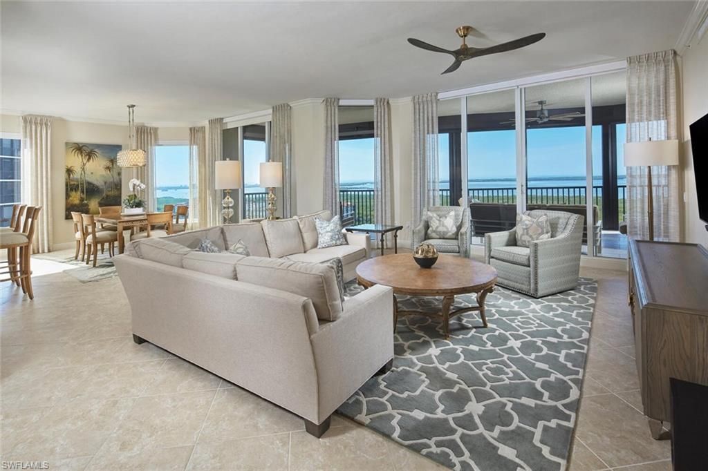 This corner residence in Treviso offers a bright, wraparound perspective of The Colony’s impeccably manicured grounds. From the moment you step off your private elevator, you are greeted by an airy, open-concept design where the indoors and outdoors blur beautifully. Whether you are hosting a formal dinner or enjoying a quiet morning in the charming breakfast nook, the backdrop is always spectacular. Bathed in natural light, the interior is defined by floor-to-ceiling glass and soaring 9’8” ceilings that frame sweeping panoramic views of the Gulf. The meticulously curated floor plan features three ensuite bedrooms, a private study, and a versatile family room, all flowing seamlessly into formal living and dining spaces. Treviso’s updated common areas feature transitional furnishings and marble floors with views over water features. Three guest suites, which include a two bedroom apartment. A beautiful secure lobby, elegant social room, billiards room, theater, and a newly updated fitness center complete the interior amenities. Spa and free form large pool with graceful beach access and a separate social pavilion. The Bay Club, a Colony private waterfront dining facility, offers intimate dining or informal sunset dining/entertainment. Experience a full array of community amenities such as a 34 acre island beach park with boat shuttle, Kayaking, canoeing, tennis, pickle ball, bocce and sailing. Close to Coconut Point Shopping Center. 15 minutes to the airport.