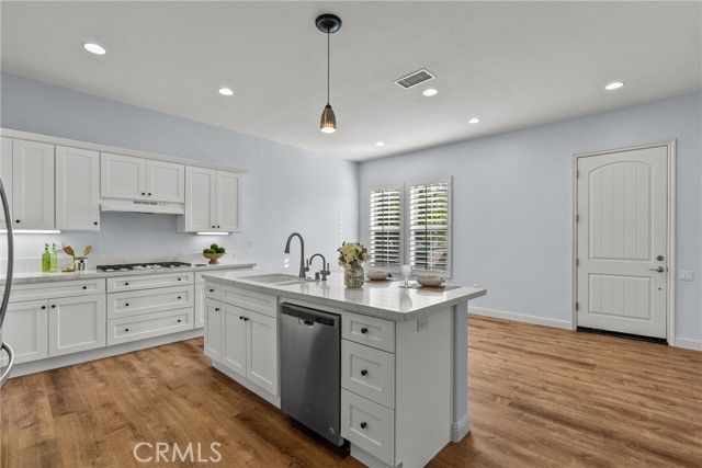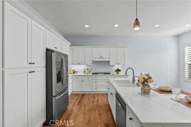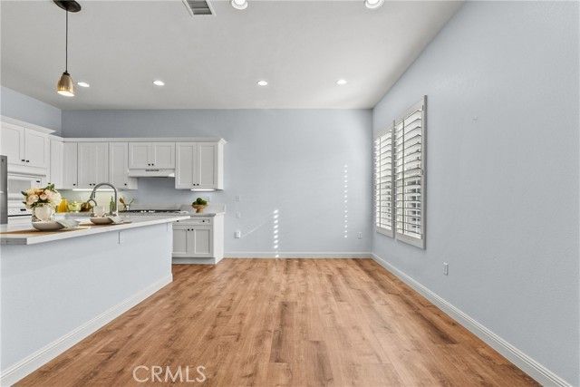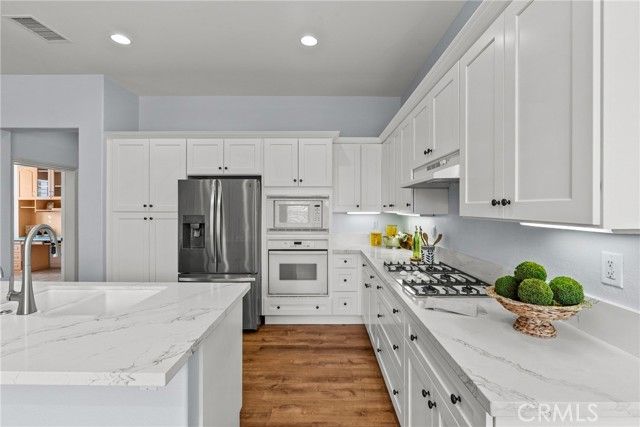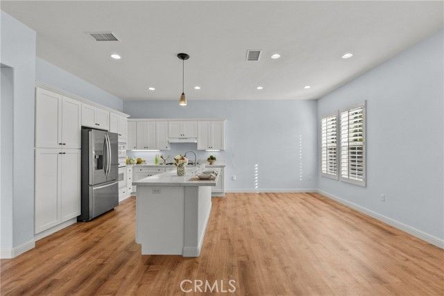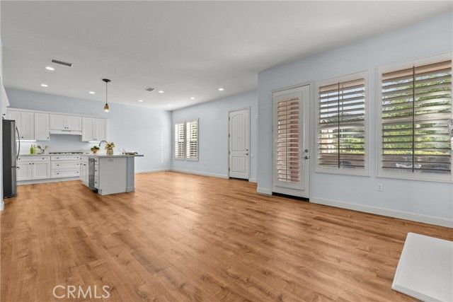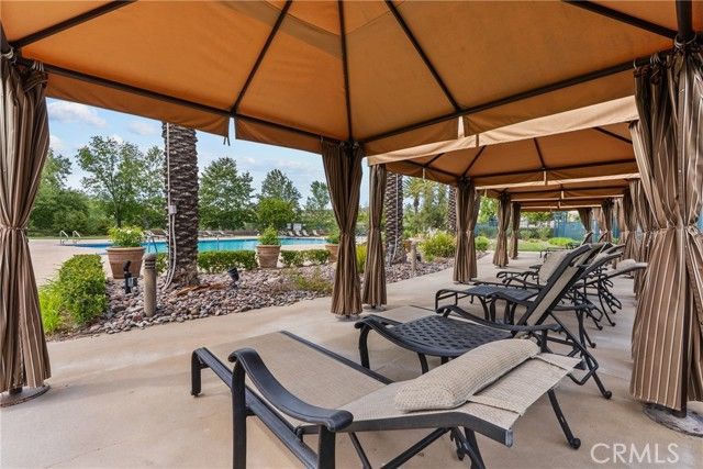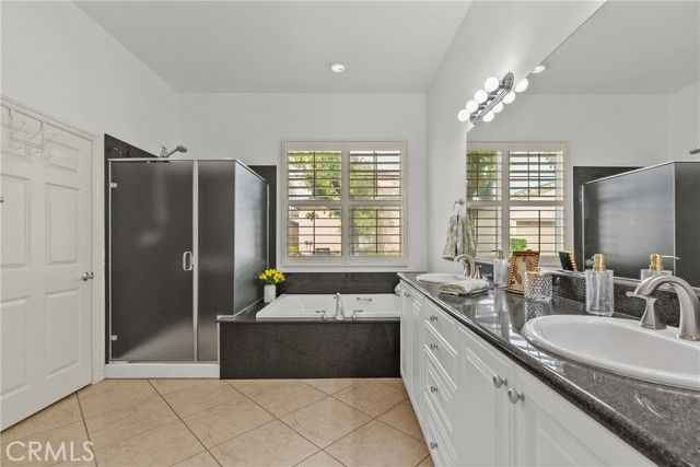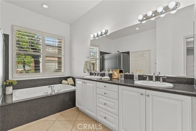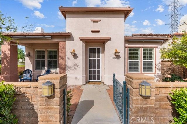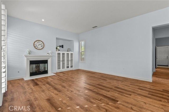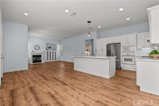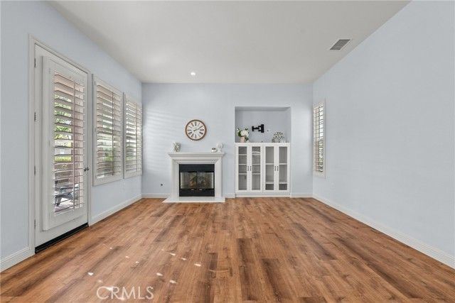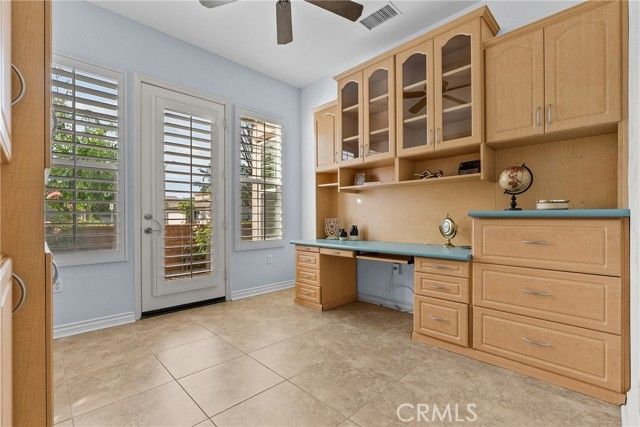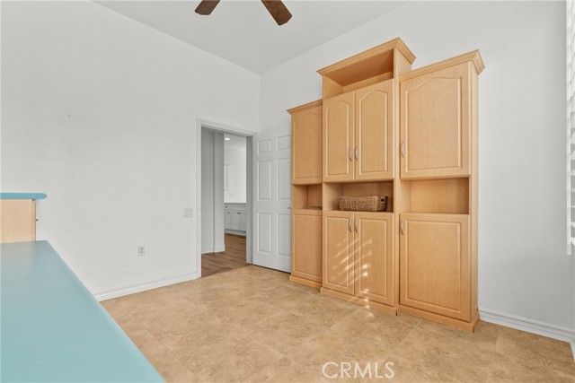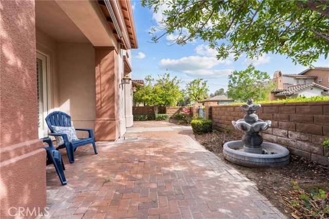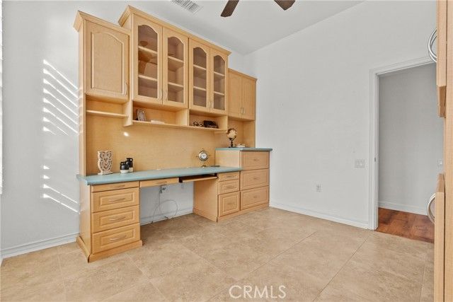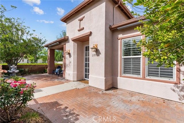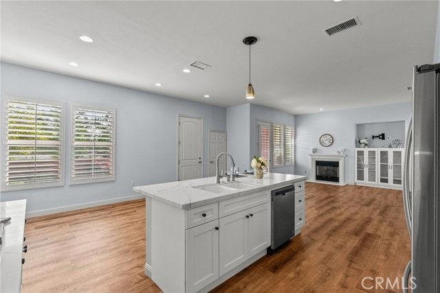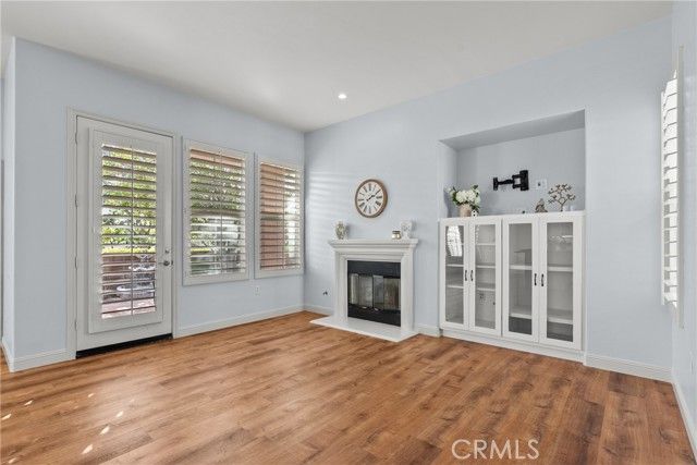 Welcome to this beautifully maintained and thoughtfully upgraded home offering 3 bedrooms, 2 bathrooms, and 1,693 square feet of comfortable living space in a desirable guard-gated 55+ community. Inside, you’ll find new laminate wood flooring and a bright, open layout designed for both everyday comfort and easy entertaining. The kitchen is a standout feature with abundant cabinet and pantry space, a pots and pan drawer, trash drawer, and a large island that opens directly to the living room. The living area is warm and inviting with custom built-ins, a fireplace, and plenty of windows that fill the home with natural light, all complemented by classic shutters. This home also offers a dedicated office with built-in cabinets and a door leading to the side yard patio, creating a flexible space for work, hobbies, or a quiet retreat. Convenience and organization throughout. The spacious primary suite features a large linen closet, dual sinks, a soaking tub, walk-in shower, and a large walk-in closet. You’ll also appreciate the oversized laundry room with generous cabinet storage and a sink, plus the attached 2-car garage with epoxy floors and built-in cabinets. Outside, enjoy the charm of the front porch, planters, and water fountain. Beyond the home, the community offers exceptional amenities including a pool, spa, gym, pickleball and sports courts, clubhouse, library, vegetable and fruit garden, direct access to paseos, and beautiful greenbelt spaces. Experience luxury living in a serene communitydesigned for comfort, beauty and peace.