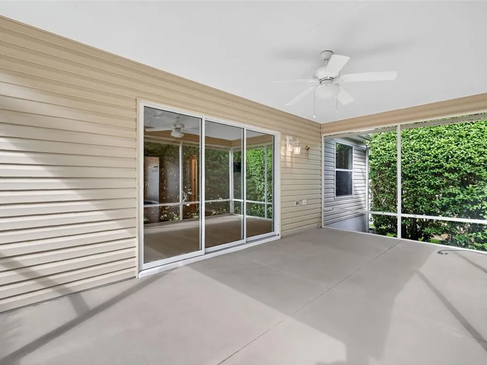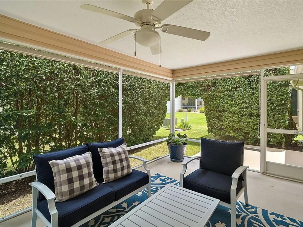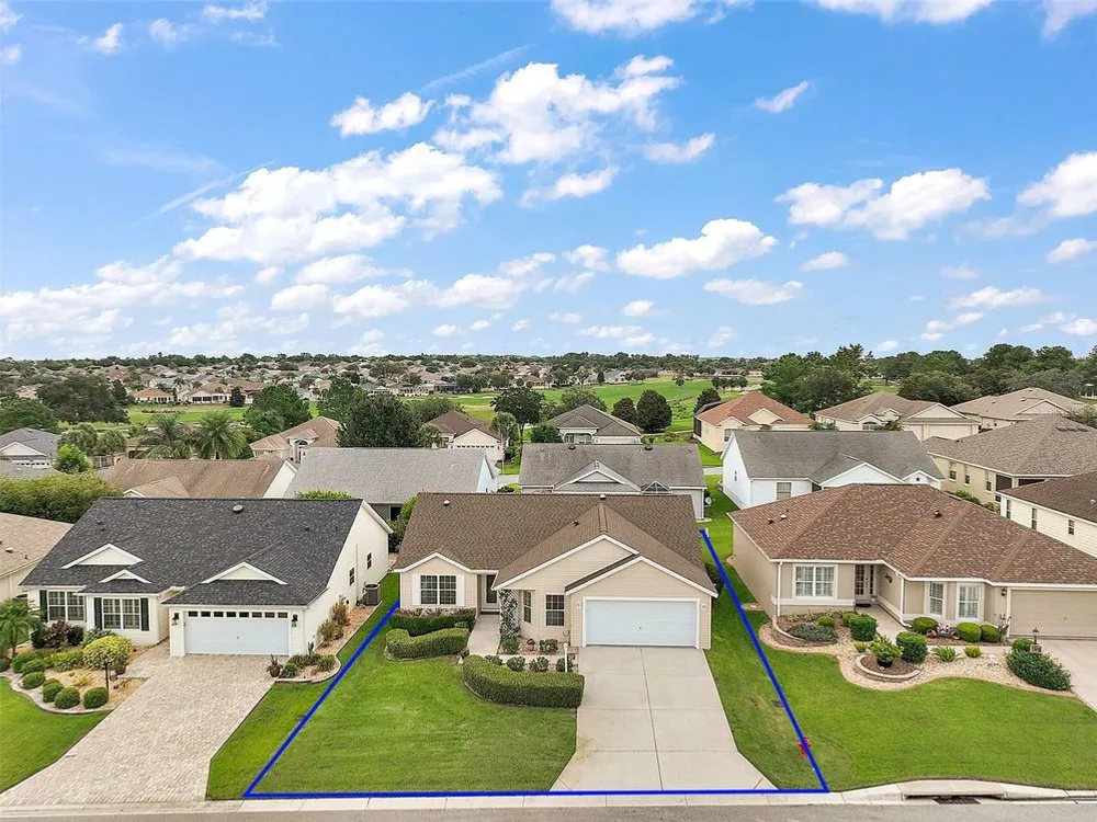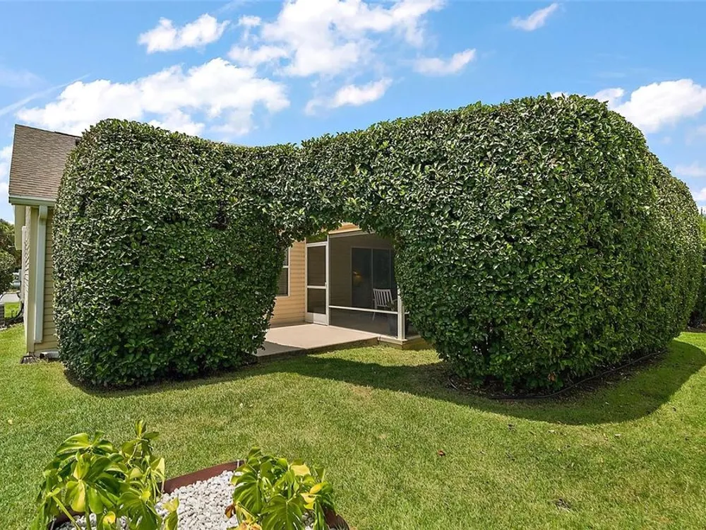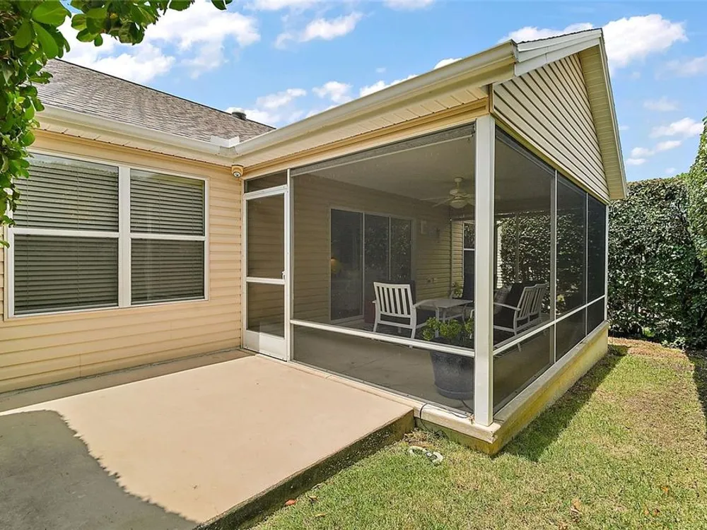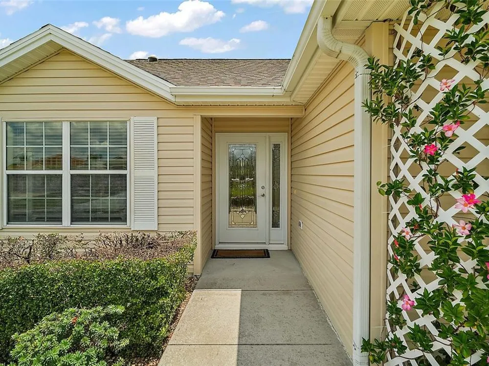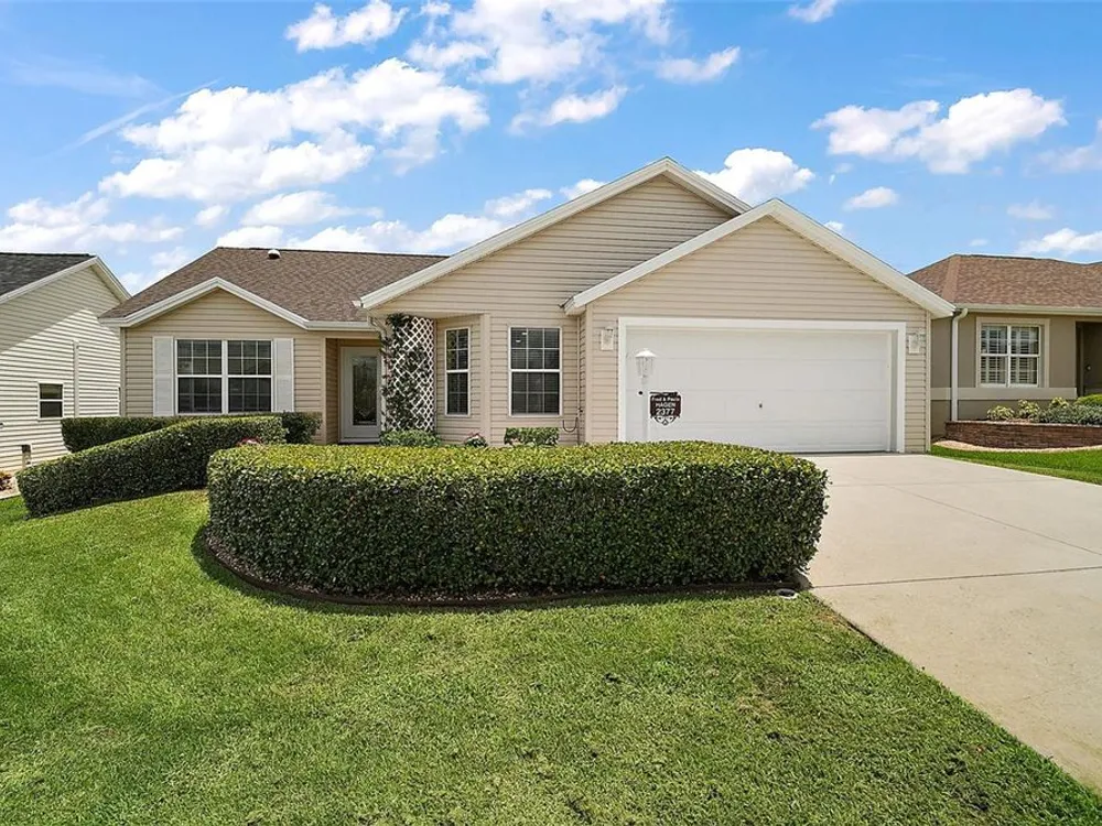 MOVE-IN READY & FRESHLY PAINTED WITH REAR PRIVACY! BRAND NEW ROOF (July '25) & NEW HVAC ('24). This Designer Wisteria, located in the sought after Village of Bonita, is perfectly located between Lake Sumter Landing and Brownwood Paddock Square. The popular floor plan offers 3 bedrooms and 2 baths, with the primary en-suite bath featuring a tiled, walk-in ROMAN SHOWER and dual vanity as well as great closet space throughout! The LONG LIST OF VALUABLE UPDATES includes a NEW Hot Water Heater ('20) with Hot Water Circulator ('21) and NEW Water Softener ('20). The kitchen was renovated in 2021 with painted cabinets, pull-out shelves, beautiful QUARTZ countertops, backsplash tile and LVP flooring. Appliances include a 2021 refrigerator & slide-in range and new microwave ('24). The sunny breakfast nook adds charm and functionality. Additional highlights include the gorgeous leaded-glass entry door, high vaulted ceilings, INSIDE LAUNDRY, updated light fixtures, LARGE screened lanai W/PRIVACY landscape, pull-down attic stairs, NEW garage door motor system ('24) for the spacious two car garage including garage storage cabinets and upgraded landscaping. Fantastic location close to Seabreeze & Colony Rec Centers, golf, shopping, dining, and all the Villages fun! Call today to schedule your private tour! Video coming soon!