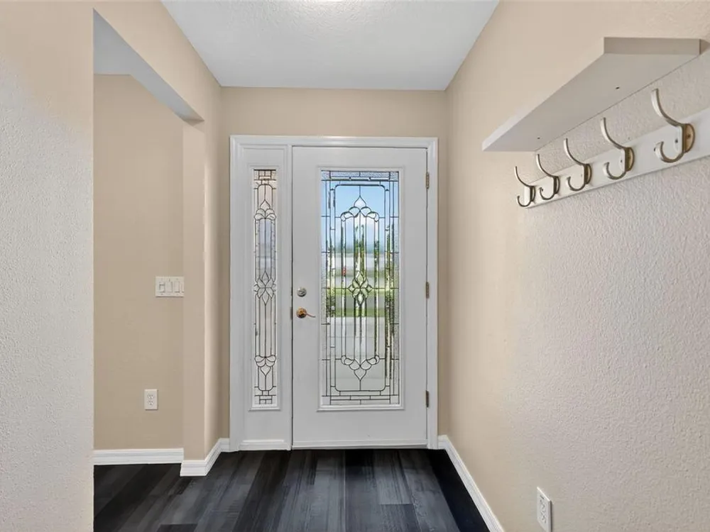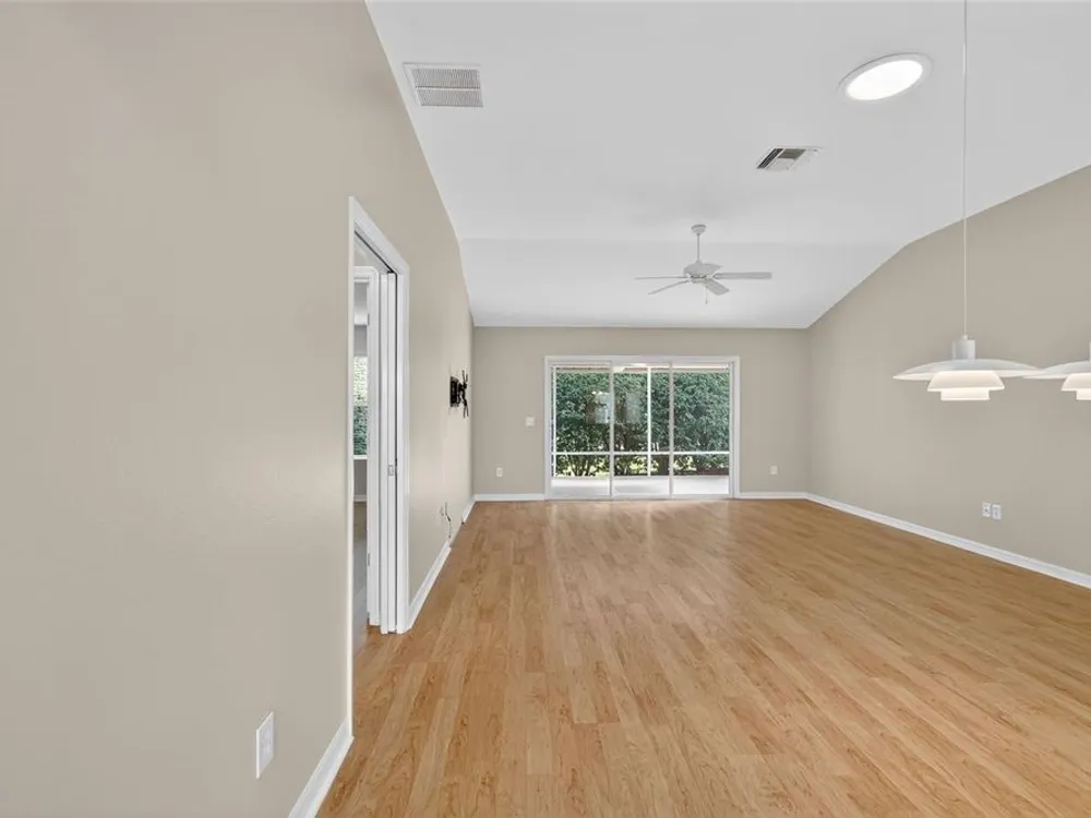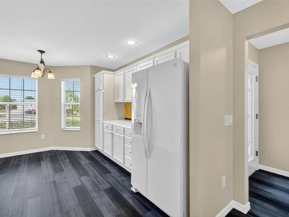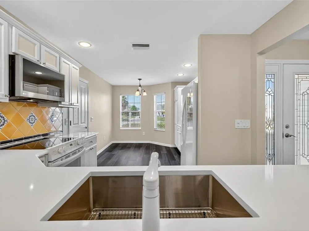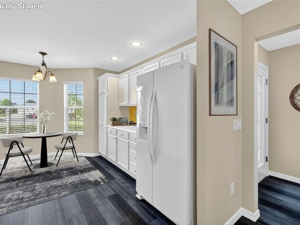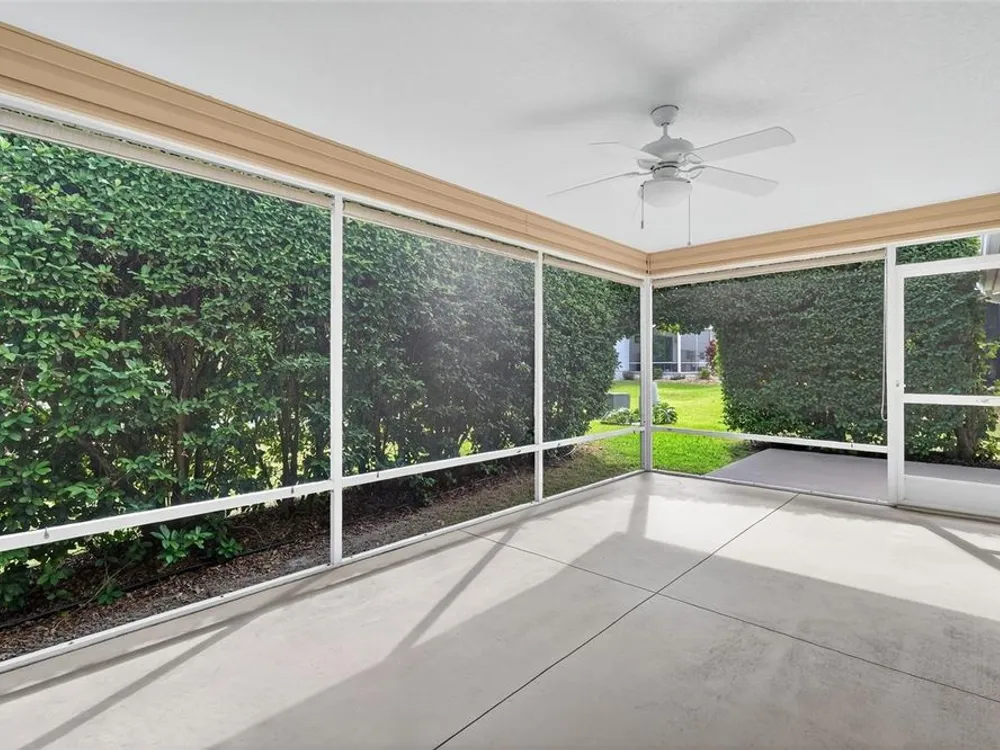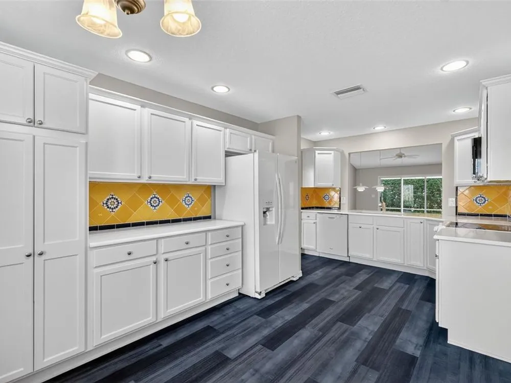 MOVE-IN READY & FRESHLY PAINTED WITH REAR PRIVACY! BRAND NEW ROOF (July '25) & NEW HVAC ('24). This Designer Wisteria, located in the sought after Village of Bonita, is perfectly located between Lake Sumter Landing and Brownwood Paddock Square. The popular floor plan offers 3 bedrooms and 2 baths, with the primary en-suite bath featuring a tiled, walk-in ROMAN SHOWER and dual vanity as well as great closet space throughout! The LONG LIST OF VALUABLE UPDATES includes a NEW Hot Water Heater ('20) with Hot Water Circulator ('21) and NEW Water Softener ('20). The kitchen was renovated in 2021 with painted cabinets, pull-out shelves, beautiful QUARTZ countertops, backsplash tile and LVP flooring. Appliances include a 2021 refrigerator & slide-in range and new microwave ('24). The sunny breakfast nook adds charm and functionality. Additional highlights include the gorgeous leaded-glass entry door, high vaulted ceilings, INSIDE LAUNDRY, updated light fixtures, LARGE screened lanai W/PRIVACY landscape, pull-down attic stairs, NEW garage door motor system ('24) for the spacious two car garage including garage storage cabinets and upgraded landscaping. Fantastic location close to Seabreeze & Colony Rec Centers, golf, shopping, dining, and all the Villages fun! Call today to schedule your private tour! Video coming soon!