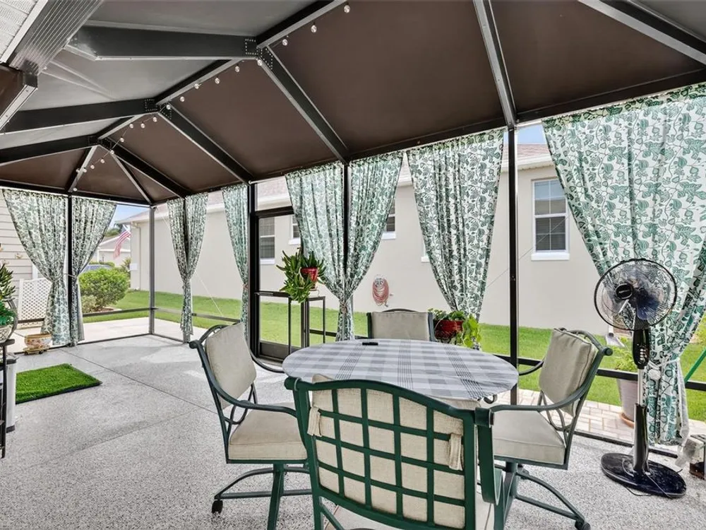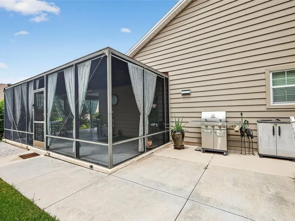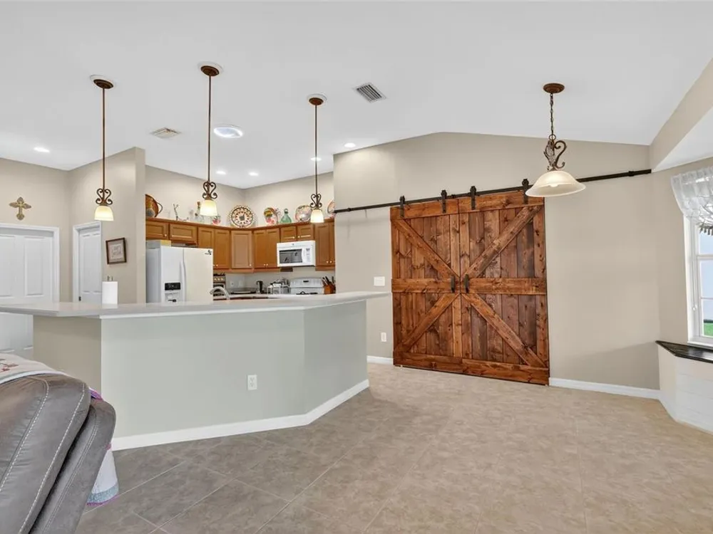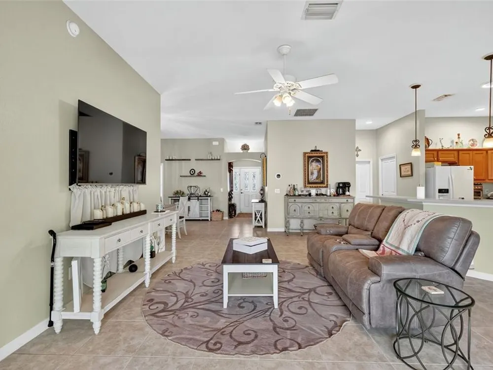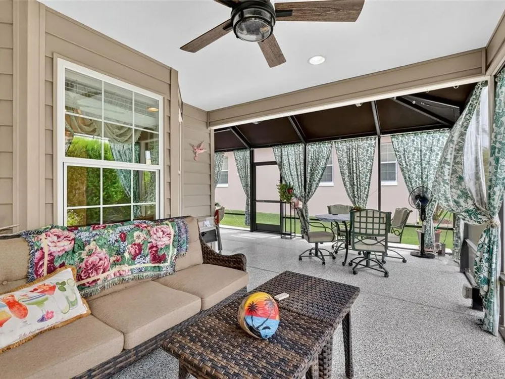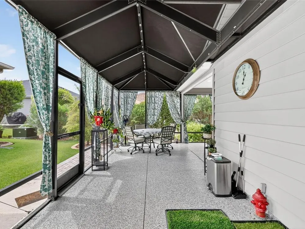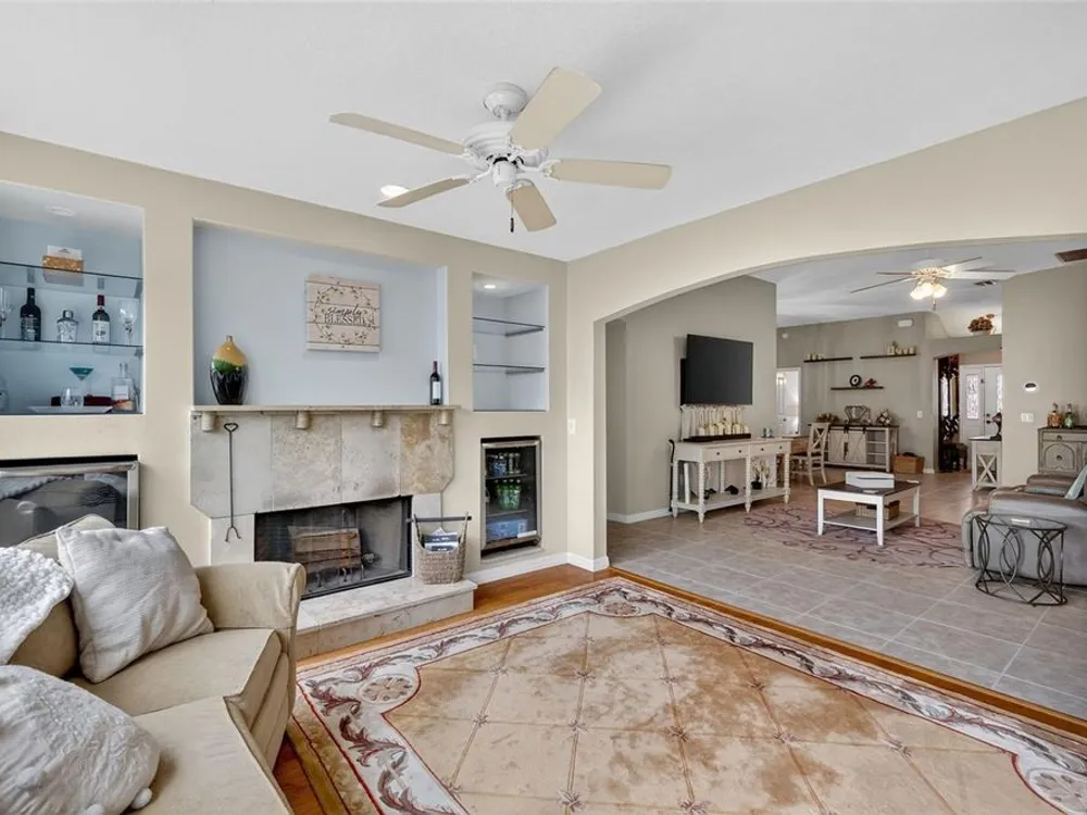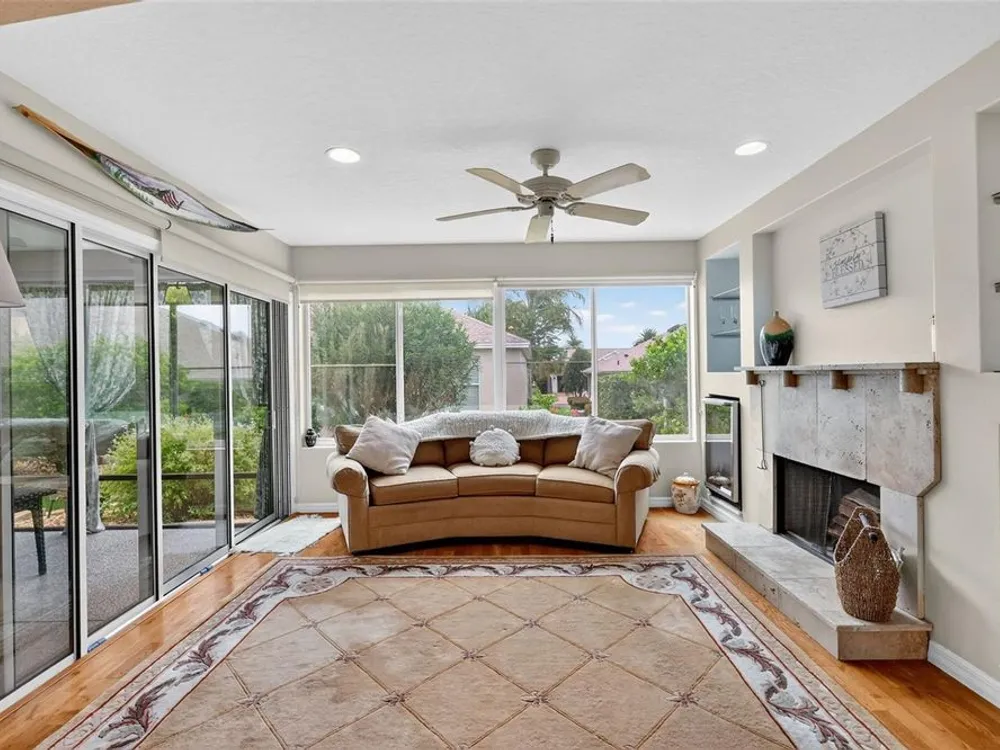 Welcome Home to the Lovely Ponderosa Pine in The Village of Bonita, just minutes to Lake Sumter Landing Town Square! This 4 bedroom, 2 bath home boasting over 2200 sq. ft. has several updates and upgrades starting with the gorgeous PAVER front patio and driveway installed in 2021 and updated LANDSCAPING completed this year as well as a NEW ROOF this month (August)!! Come inside and enjoy the open concept and split bedroom floor plan. The spacious kitchen has plenty of cabinets and an expanded PANTRY with Barn door, large ISLAND with Corian bar-top breakfast bar AND a small eating area with a window bench-seat with storage!! Enjoy the wood burning FIREPLACE in Florida room and the HUGE window letting in lots of light. Also, very nice built-in shelving and TWO Wine (drink) cooler units!! Just outside the Florida room is a large SCREENED-IN L-shaped LANAI which includes privacy curtains and a big concrete patio for your grill, smoker or additional relaxing area. The lanai floor was recoated in 2024 and a new lanai cover installed in 2025! Come back inside to the Primary Bedroom and notice the large walk-in CLOSET with CUSTOM SHELVING and the ensuite with separate water closet and Roman shower and double sinks. Next, take a look at the 3 OTHER BEDROOMS!!! The 1st bedroom is bright and cheery with a beautiful BAY window and nice sized closet. Then, enter the remaining 2 bedrooms and guest bath through the pocket door giving additional privacy! And we don't want to forget the HUGE Laundry room with wash tub and plenty of cabinets and space for laundry baskets! Then onto the 2 car garage and golf cart garage AND MORE STORAGE!! Several storage cabinets on rollers will stay with the home! AND - AS IF THAT ISN'T ENOUGH - the seller had Magic Stairs installed in 2020 for additional ATTIC storage! Also included is a Tankless water heater, water treatment system, new FURNACE and A/C in 2023, PLUS *** BOND IS PAID***. NOTE - Seller offering a $2000 flooring allowance for the 2 bedrooms with carpeting.