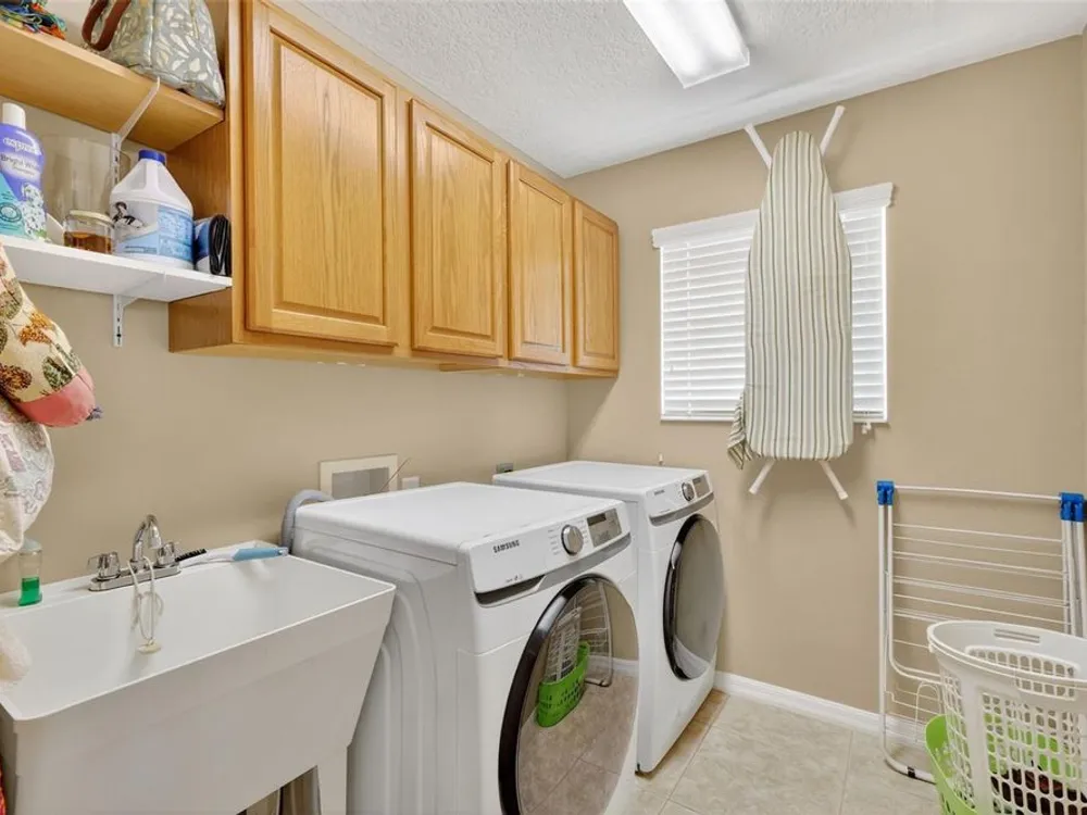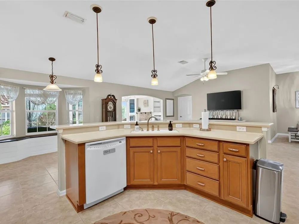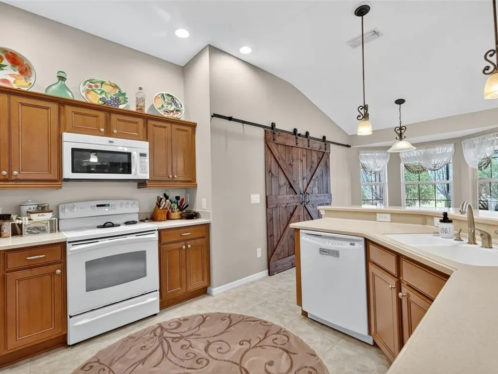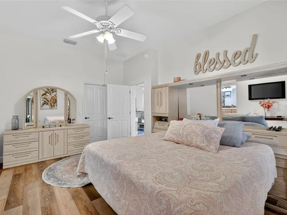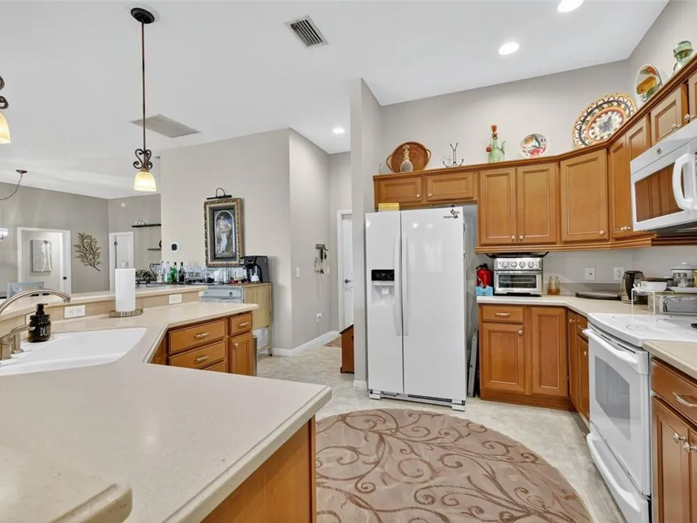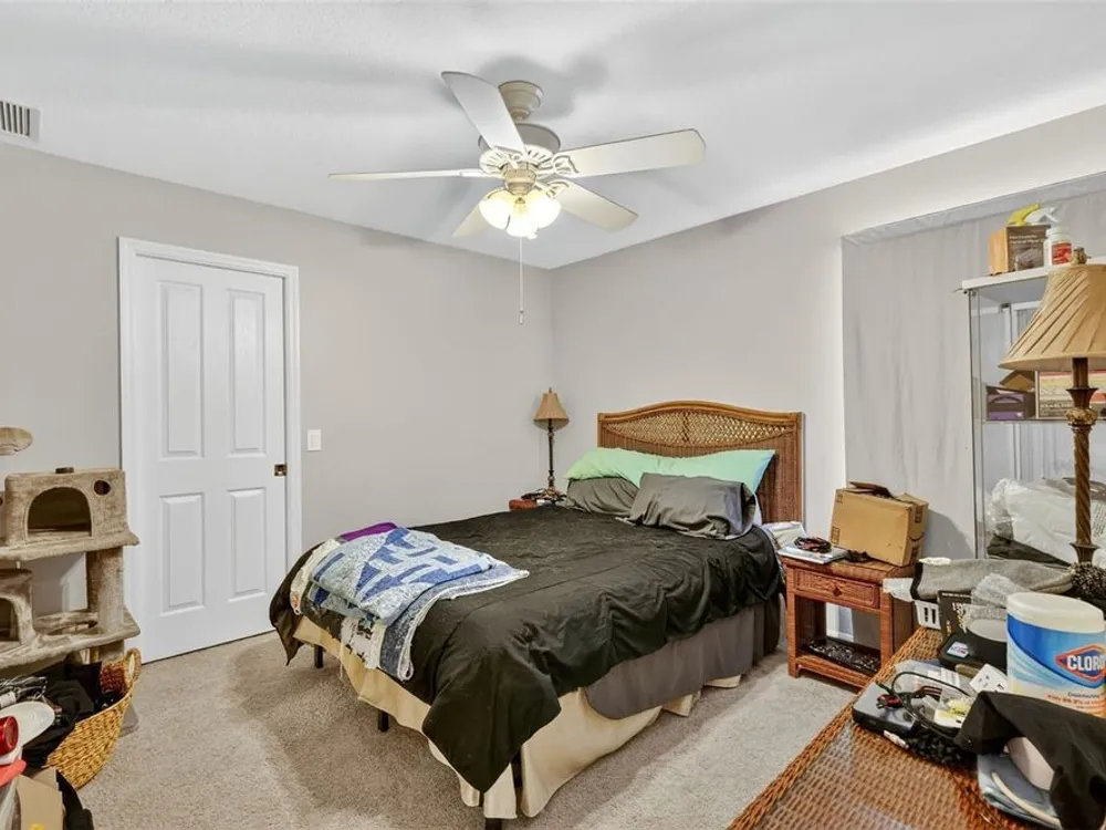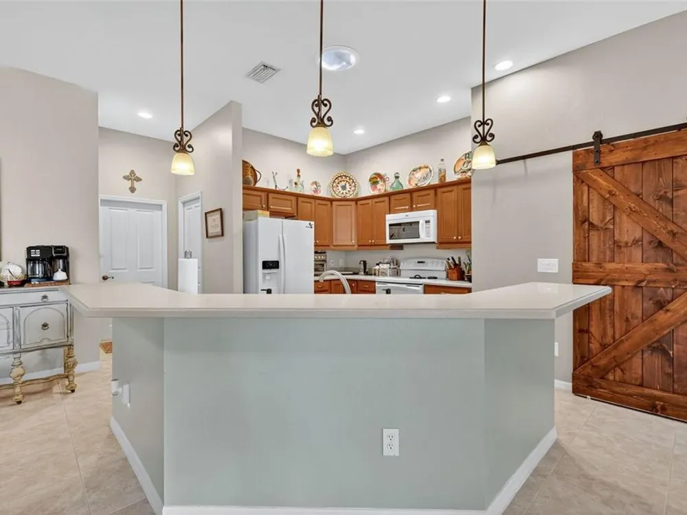 Welcome Home to the Lovely Ponderosa Pine in The Village of Bonita, just minutes to Lake Sumter Landing Town Square! This 4 bedroom, 2 bath home boasting over 2200 sq. ft. has several updates and upgrades starting with the gorgeous PAVER front patio and driveway installed in 2021 and updated LANDSCAPING completed this year as well as a NEW ROOF this month (August)!! Come inside and enjoy the open concept and split bedroom floor plan. The spacious kitchen has plenty of cabinets and an expanded PANTRY with Barn door, large ISLAND with Corian bar-top breakfast bar AND a small eating area with a window bench-seat with storage!! Enjoy the wood burning FIREPLACE in Florida room and the HUGE window letting in lots of light. Also, very nice built-in shelving and TWO Wine (drink) cooler units!! Just outside the Florida room is a large SCREENED-IN L-shaped LANAI which includes privacy curtains and a big concrete patio for your grill, smoker or additional relaxing area. The lanai floor was recoated in 2024 and a new lanai cover installed in 2025! Come back inside to the Primary Bedroom and notice the large walk-in CLOSET with CUSTOM SHELVING and the ensuite with separate water closet and Roman shower and double sinks. Next, take a look at the 3 OTHER BEDROOMS!!! The 1st bedroom is bright and cheery with a beautiful BAY window and nice sized closet. Then, enter the remaining 2 bedrooms and guest bath through the pocket door giving additional privacy! And we don't want to forget the HUGE Laundry room with wash tub and plenty of cabinets and space for laundry baskets! Then onto the 2 car garage and golf cart garage AND MORE STORAGE!! Several storage cabinets on rollers will stay with the home! AND - AS IF THAT ISN'T ENOUGH - the seller had Magic Stairs installed in 2020 for additional ATTIC storage! Also included is a Tankless water heater, water treatment system, new FURNACE and A/C in 2023, PLUS *** BOND IS PAID***. NOTE - Seller offering a $2000 flooring allowance for the 2 bedrooms with carpeting.