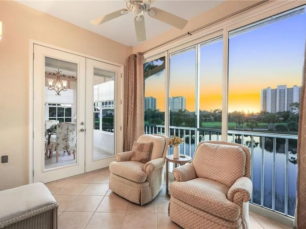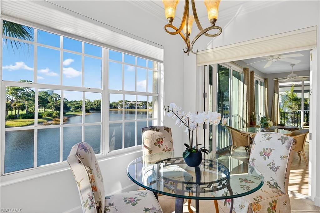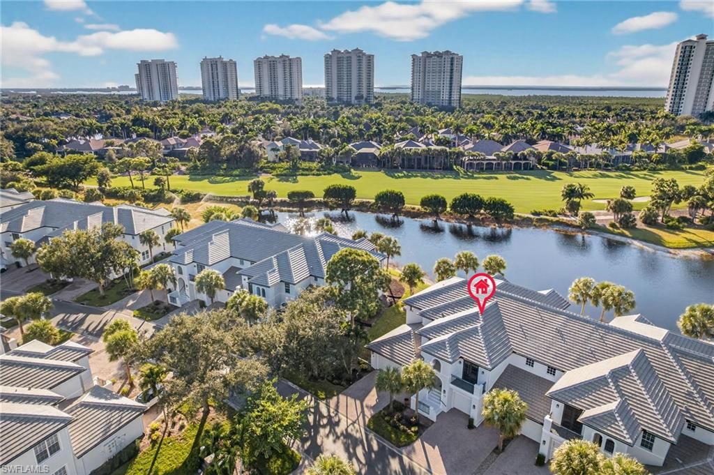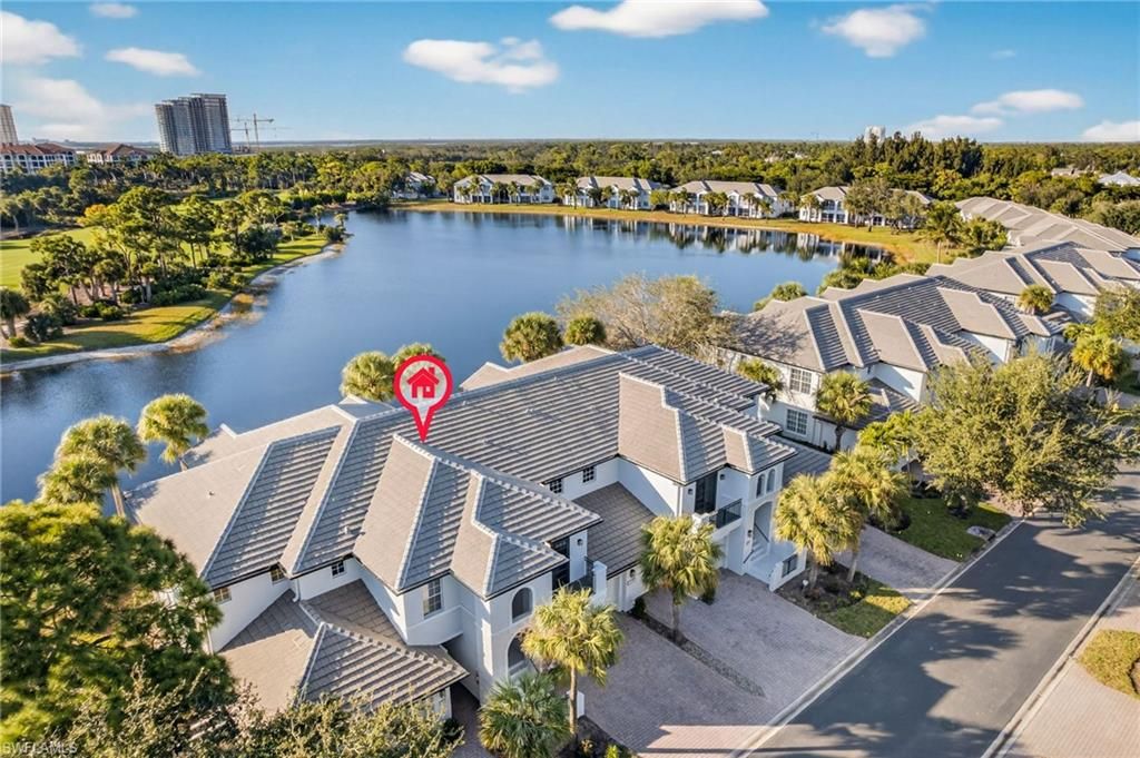 If a gorgeous, western lake and sunset views sounds perfect to you, welcome to this 2nd-floor coach home that lives like a single-family residence in Merano at The Colony. This home, with a private elevator, has recently installed category 5 UV protected windows creating an enclosed lanai providing almost 3,000 total square feet of living space. The bright and sunny kitchen allows for informal dining while taking in the water views while the formal dining area lends itself to easy entertaining with a wet bar adjacent to the space. The split floor plan allows for privacy with 2 guests suits and cozy den for quiet reading or movie night utilizing the TV/sound with a Sony sound system with five quality UTL speakers. The bonus room at the front of the home allows for a small office or extra storage. The enclosed lanai looks over the natural landscape teeming with wildlife enjoying the large pond. With it’s large, oversized 2-car garage and ability to grill outside the front of the home, this condo gives you all of the benefits of a single-family without the hassle. Additionally, the home is located in an ‘X’ flood plain.Merano neighborhood was updated this past year with new roofs, gutters, exterior lighting and fresh paint color. New landscaping is currently underway. Merano HOA fee remains the lowest for condo homes in the Colony. There's no milestone requirement for this community. Amenities for Colony residents include dining at the Colony’s private and newly renovated Bay Club with unparalleled views of Estero Bay and kayak park. Pelican Landing amenities included in the HOA- private beach park with boat shuttle access from the community, tennis center, pickle-ball, bocce, attended fitness center and kayak park. Optional golf and sports memberships may be available at the Colony Golf Club and The Nest Country Club. Nearby there is the large, popular Coconut Point Mall and fabulous restaurants. Merano is a secure, gated community minutes away from Naples and Fort Myers, about 3 hours by air from New York, Chicago, and Toronto, and 20 minutes from the Ft Myers airport.