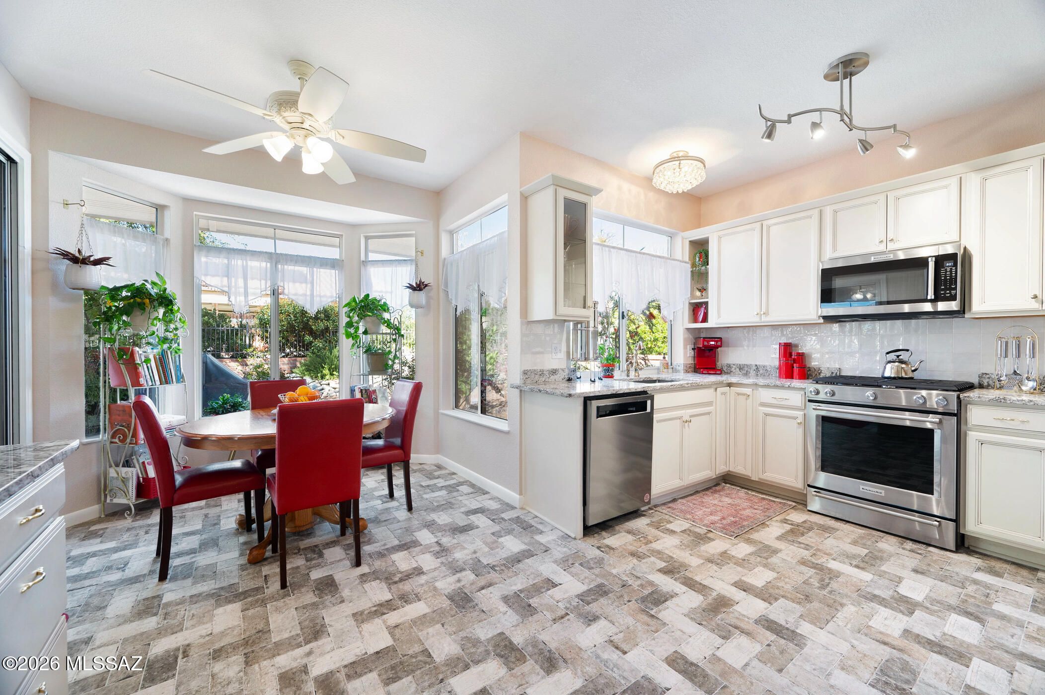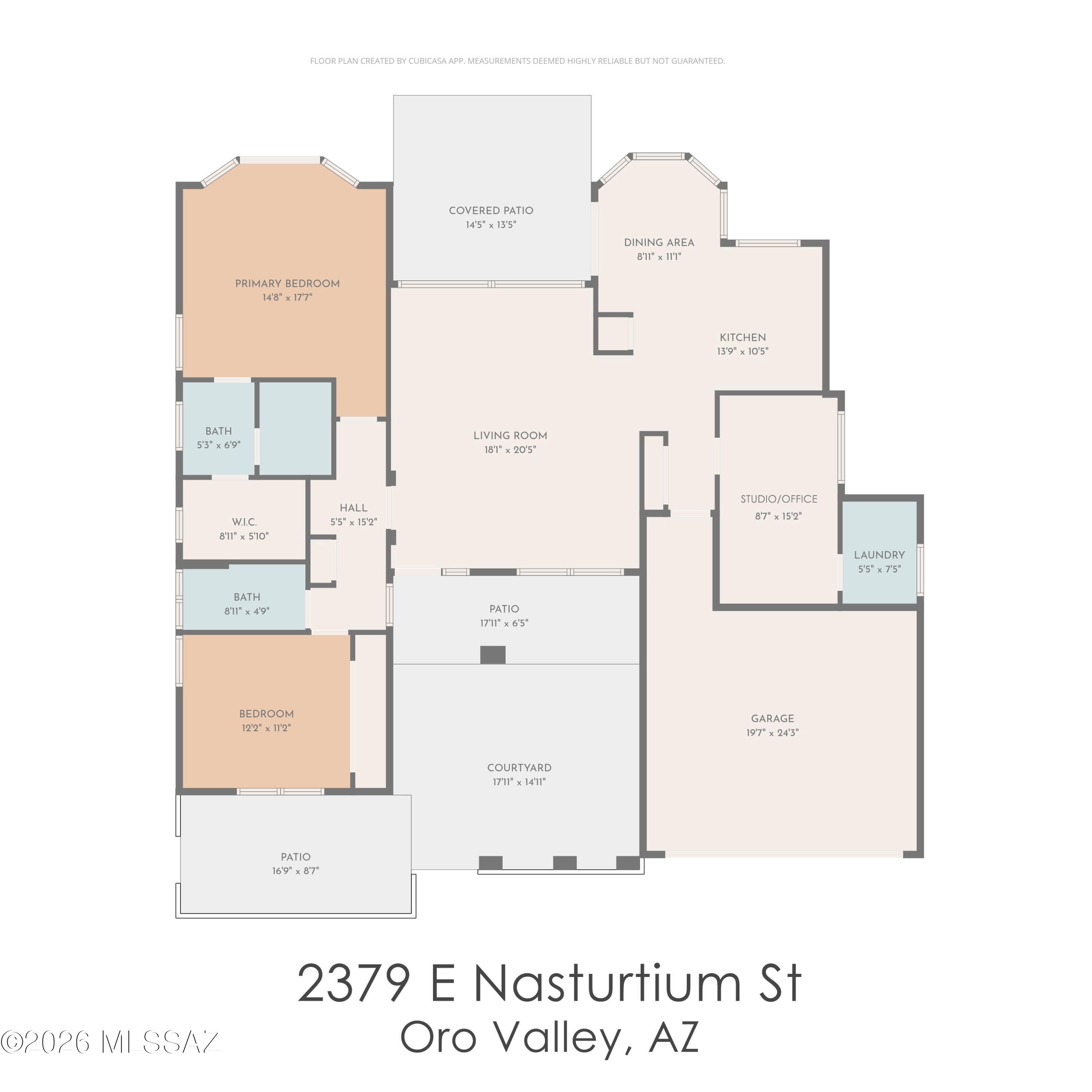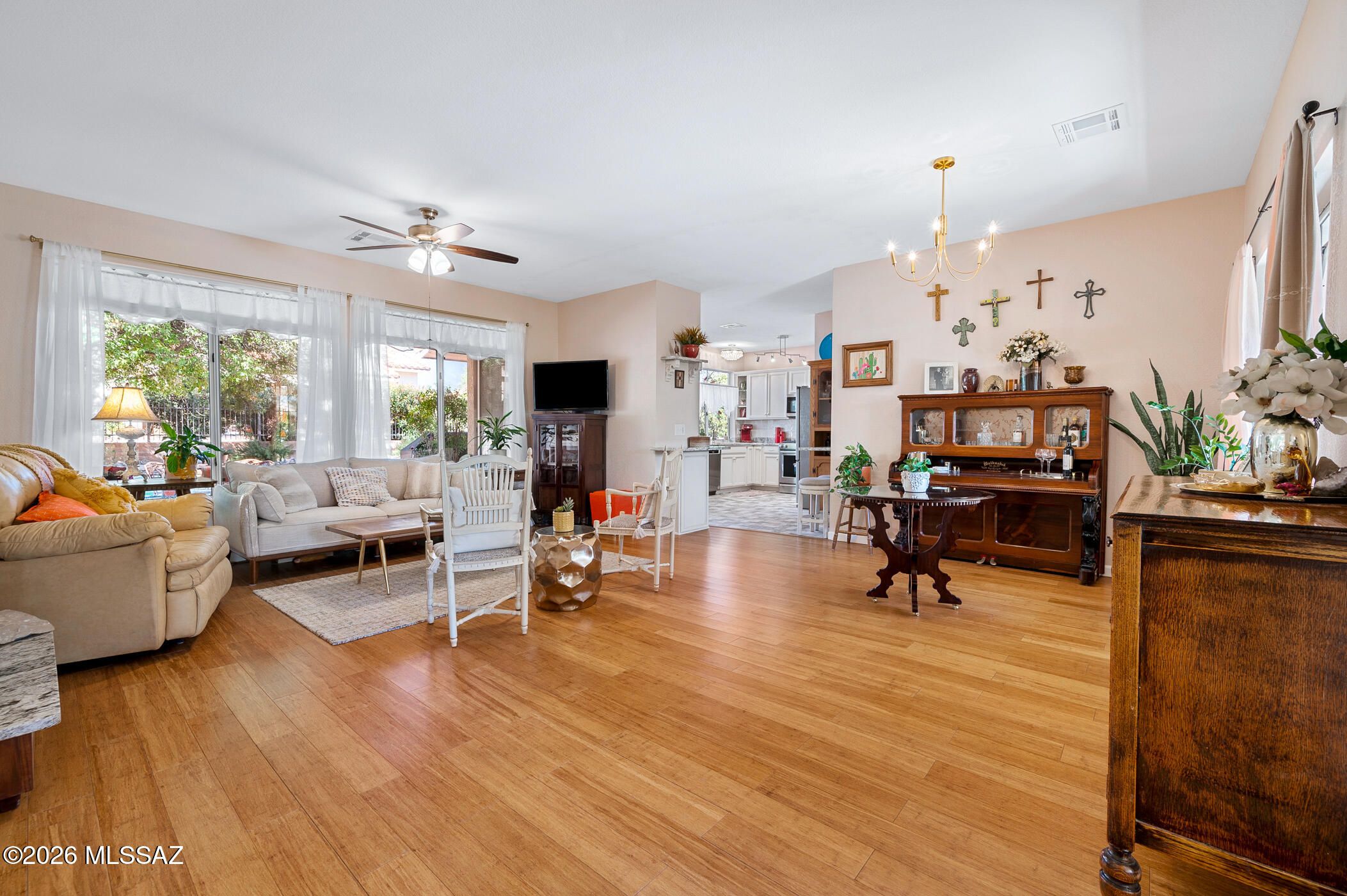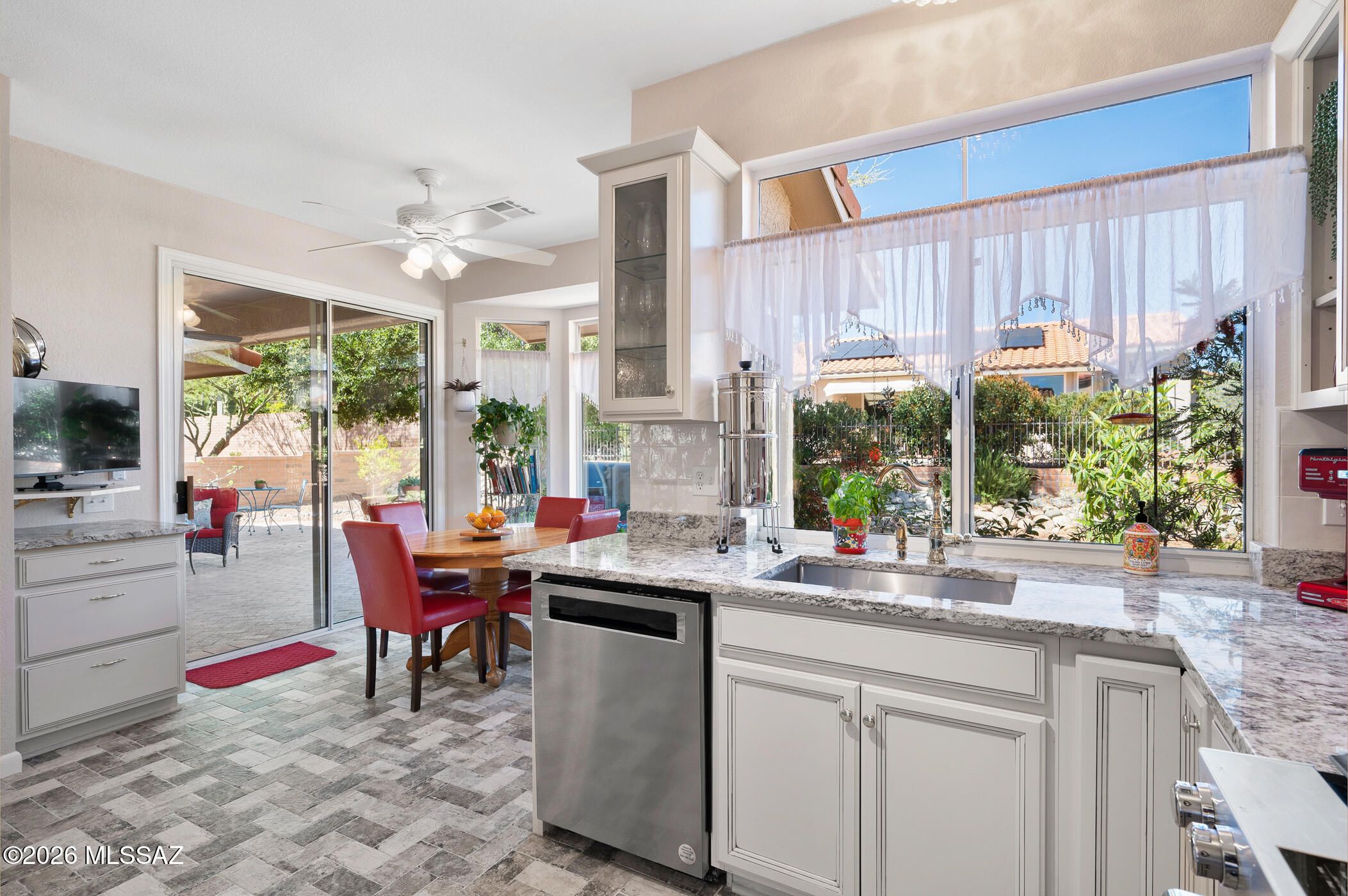 Nicely situated on a quiet street in coveted Sun City Oro Valley, this very special 2 Bedroom, 2 Bath home also has an expanded office/studio complete with a 10-foot built in work area, a sink, built-in shelving & an attached laundry room. You'll be welcomed into this lovely property by the spacious front courtyard boasting Catalina Mountain Views & a garden oasis. More highlights of this lovely home include updated Bamboo & tile flooring, an inviting living & dining area, a fully updated Chef's kitchen showcasing granite countertops, an enlarged pantry, new stainless-steel appliances, new cabinets & lighting, a breakfast nook & a sliding door to the extended back patio spaces. The peaceful Primary Bedroom has a beautiful bay window plus an en-suite bath with granite-topped new vanity,