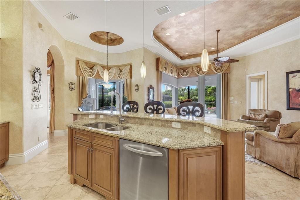 - Built-In Cabinets, Cable TV Hookup, Fireplace, Entrance Foyer, French Door(s)/Atrium Door(s), Internet Available, Laundry Tub, Pantry, Pull Down Attic Stairs, Smoke Detector, Wired for Sound, High Ceilings, Walk-In Closet(s), Wet Bar, Window Coverings, Den, Family Room, Additional Bathroom, Guest Room, Laundry Facility, Split Bedrooms, Living/Dining Room, Kitchen Island, Dual Sinks, Bathtub, Separate Shower, Impact Glass