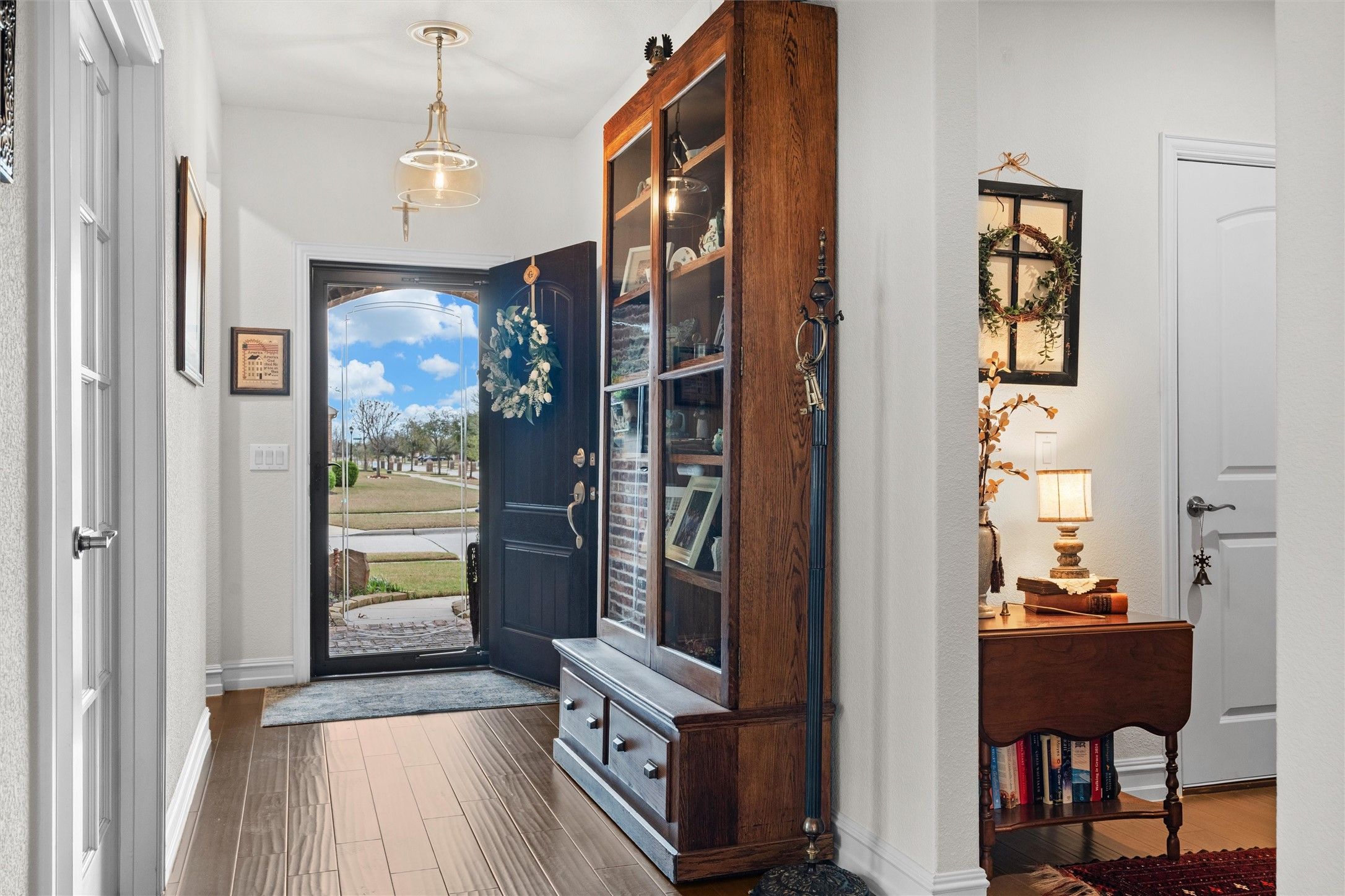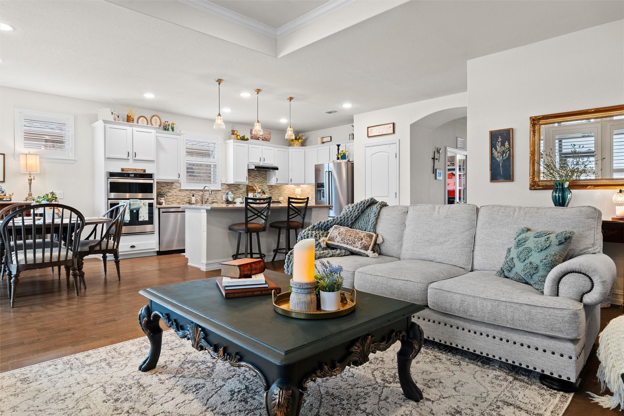 Nestled on a graceful bend in the street within the highly sought-after Frisco Lakes by Del Webb 55+ lifestyle community, this beautifully updated Abbeyville floor plan offers an exceptional blend of comfort, elegance, and serene surroundings. Positioned on a spacious lot, the property enjoys sweeping greenbelt and walking path views that create a peaceful, resort-like atmosphere. Thoughtfully designed, the home features 2 bedrooms, 2 beautifully updated bathrooms with walk-in showers, a private office, a bright sunroom, and a screened-in lanai—perfect for enjoying morning coffee or sunsets while overlooking the lush greenbelt. Expansive windows throughout the living room, kitchen, dining area, sunroom, and primary suite frame the picturesque views and fill the home with natural light. The home has been freshly repainted inside and out, complemented by plantation shutters and custom window coverings that add both style and sophistication. Decorative tray ceilings in the living room and primary retreat. Upgraded lighting fixtures throughout the home enhance its refined ambiance. Designed with accessibility and ease of living in mind, the home is handicap accessible throughout, offering comfort and functionality without compromising elegance. Additional enhancements include Larson screen doors at the front and back, allowing fresh air to flow through the home, and a meticulously finished garage with no-skid epoxy flooring and built-in cabinetry, providing both durability and abundant storage. Surrounded by beautiful landscaping and located in an incredible setting within the community, this residence offers the perfect balance of tranquility and vibrant 55+ living. Welcome to a home that feels like you’re on vacation every day.