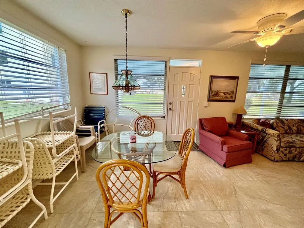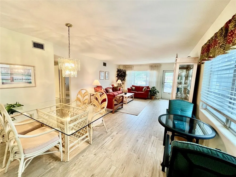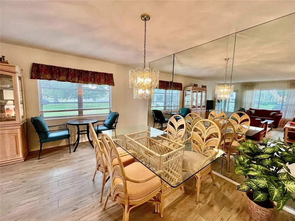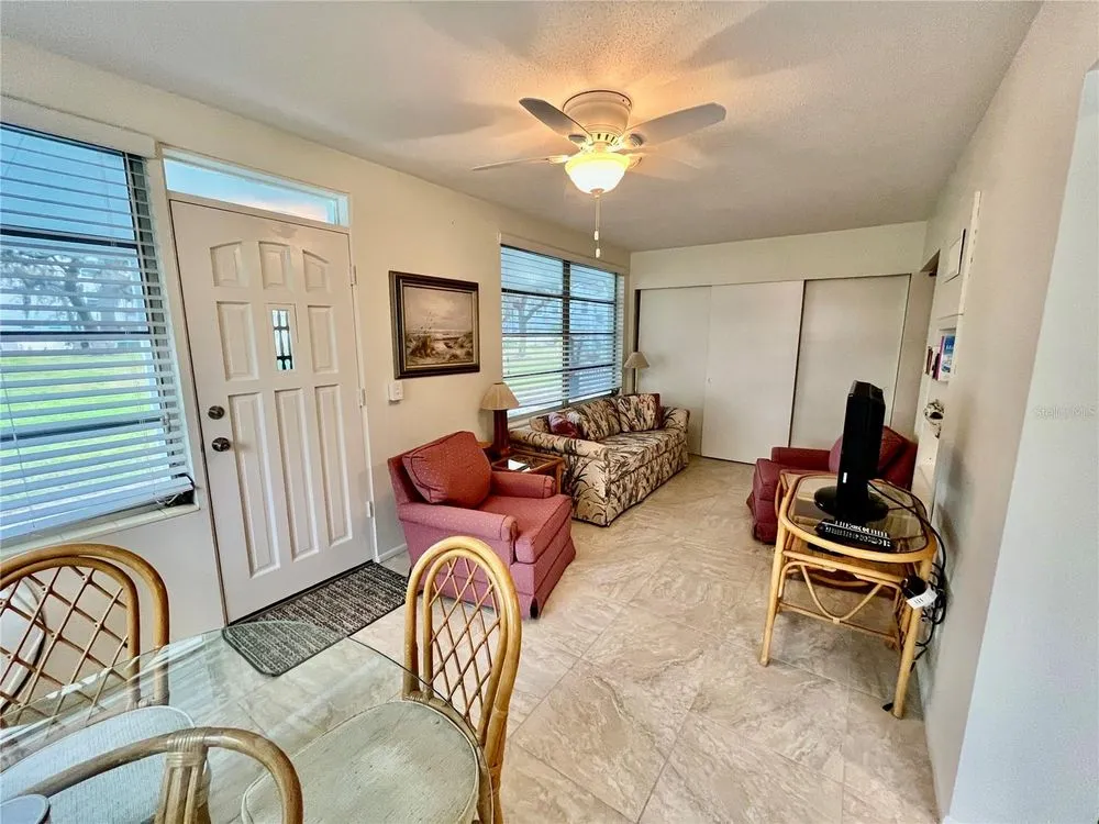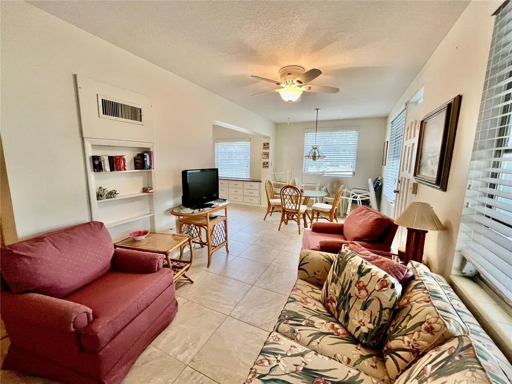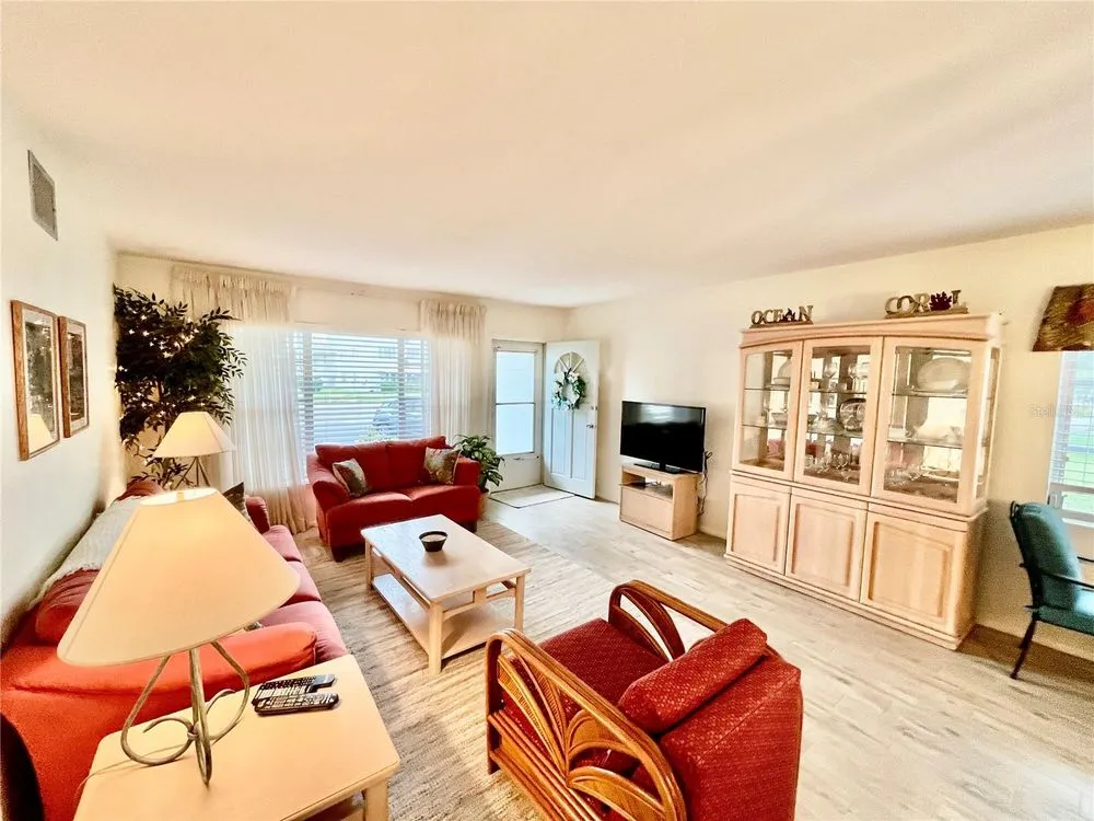 Come see this rare Ground floor End unit which features 1400 sq ft 2-bedroom, 2-bath which is conveniently located near the East Community Center and within walking distance to the golf course! Florida living at its finest! Enter to the spacious and open living room/dining room combo with laminate flooring and fully furnished. The kitchen is light and bright with an eat-in area and features stainless steel appliances. The Florida room has a wall of windows to let in the natural light and a door to the covered patio and green space beyond. The master bedroom has an x-large closet and ensuite bathroom. The second bedroom has a large closet and al. guest bath right down the hall. Assigned parking. The 55+ community has two activity centers, and two private golf courses with 9 and 18 holes, free exclusively for resident owners. There are two heated swimming pools. The remodeled Cardio Gym has the latest exercise equipment. A very pet-friendly community, there is a fenced dog park with covered seating. There are hobby studios, and a wood shop for the exclusive use of the residents. Activities include fitness classes, dancing, clubs, cards, billiards, entertainment, classes, and much more. The on-site Good Karma Café has take & bake meals and snacks. Close to beaches, transportation, shopping, entertainment, and fine dining. All room sizes, floor plans and square footage are approximate.