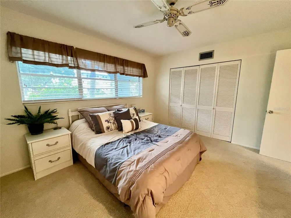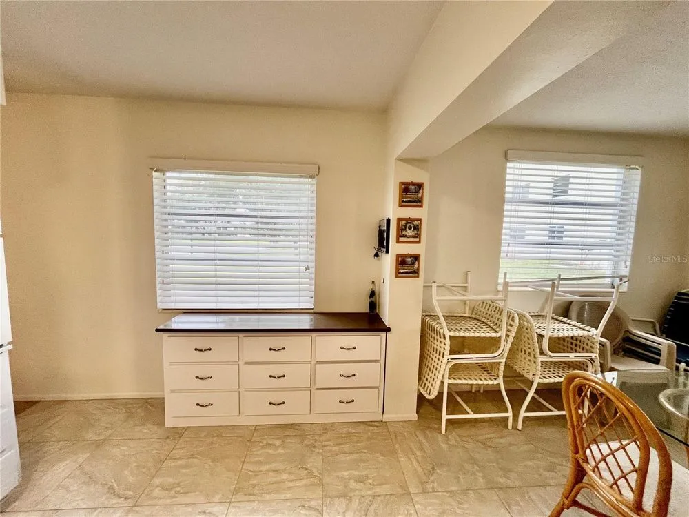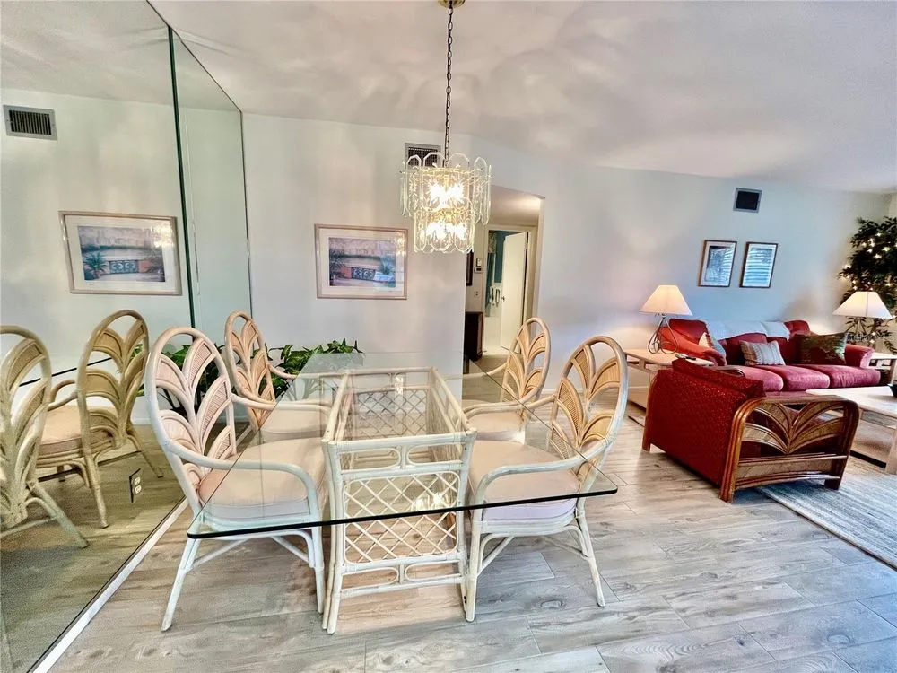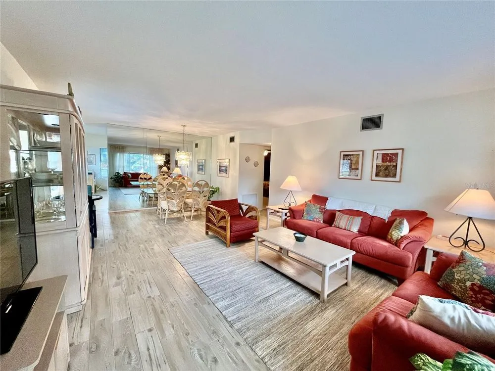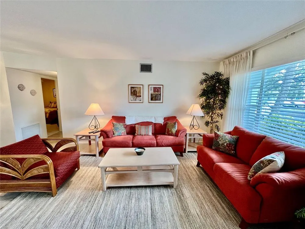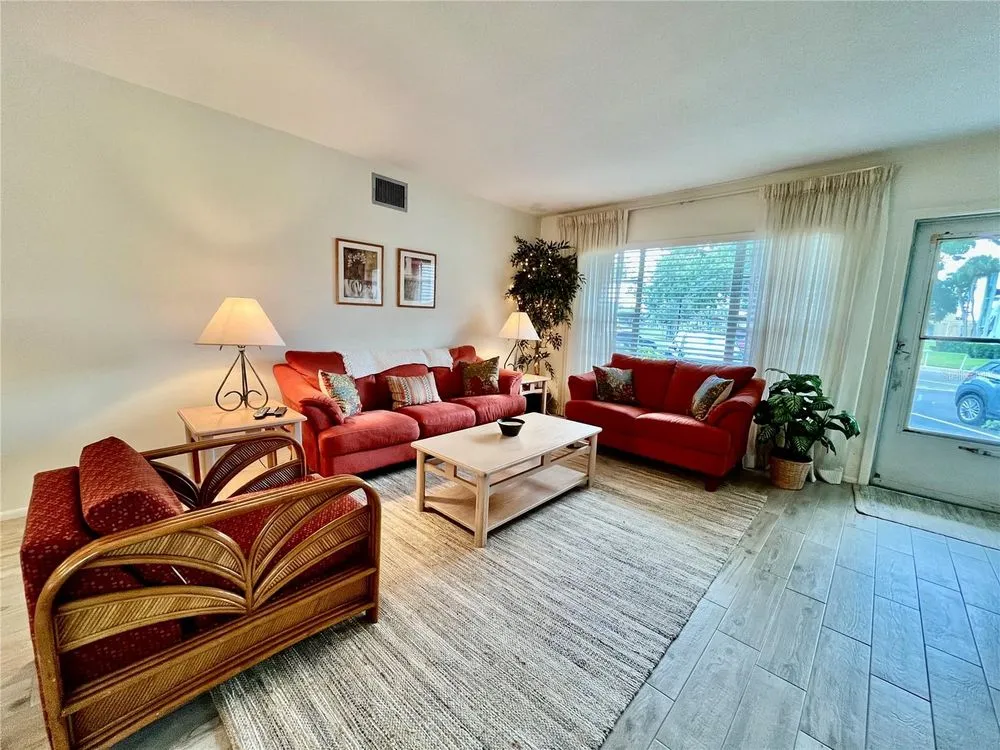 Come see this rare Ground floor End unit which features 1400 sq ft 2-bedroom, 2-bath which is conveniently located near the East Community Center and within walking distance to the golf course! Florida living at its finest! Enter to the spacious and open living room/dining room combo with laminate flooring and fully furnished. The kitchen is light and bright with an eat-in area and features stainless steel appliances. The Florida room has a wall of windows to let in the natural light and a door to the covered patio and green space beyond. The master bedroom has an x-large closet and ensuite bathroom. The second bedroom has a large closet and al. guest bath right down the hall. Assigned parking. The 55+ community has two activity centers, and two private golf courses with 9 and 18 holes, free exclusively for resident owners. There are two heated swimming pools. The remodeled Cardio Gym has the latest exercise equipment. A very pet-friendly community, there is a fenced dog park with covered seating. There are hobby studios, and a wood shop for the exclusive use of the residents. Activities include fitness classes, dancing, clubs, cards, billiards, entertainment, classes, and much more. The on-site Good Karma Café has take & bake meals and snacks. Close to beaches, transportation, shopping, entertainment, and fine dining. All room sizes, floor plans and square footage are approximate.