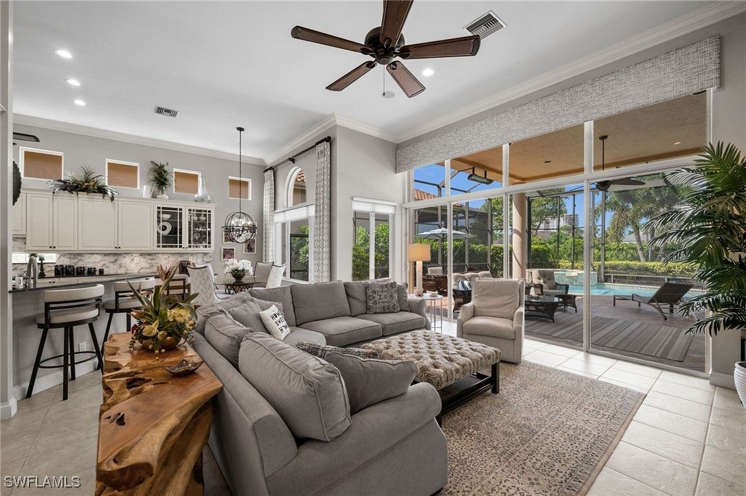 Rarely available 3 bedroom pool home located in Addison Place. Open, bright home with grand entrance doorway, bar area, formal dining, den/home office, pool and spa all with lush landscaping and on the golf course. Great layout to entertain and enjoy family. Complete roof tile and gutter systems replacement in 2019; pool and spa completely resurfaced in 2019; pool cage and screens rebuilt and replaced in 2019; garage floor resurfaced with flake coating 2023; fees for landscaping and pool maintenance on Addison Place are bundled into HOA fees. Easy to show. Enjoy magnificent sunsets at the The Colony Clubhouse which has a restaurant and bar with sweeping water views. Amenities galore within Pelican Landing and the reimagined Bay Club with something for everyone. This home is a must see and will not last!