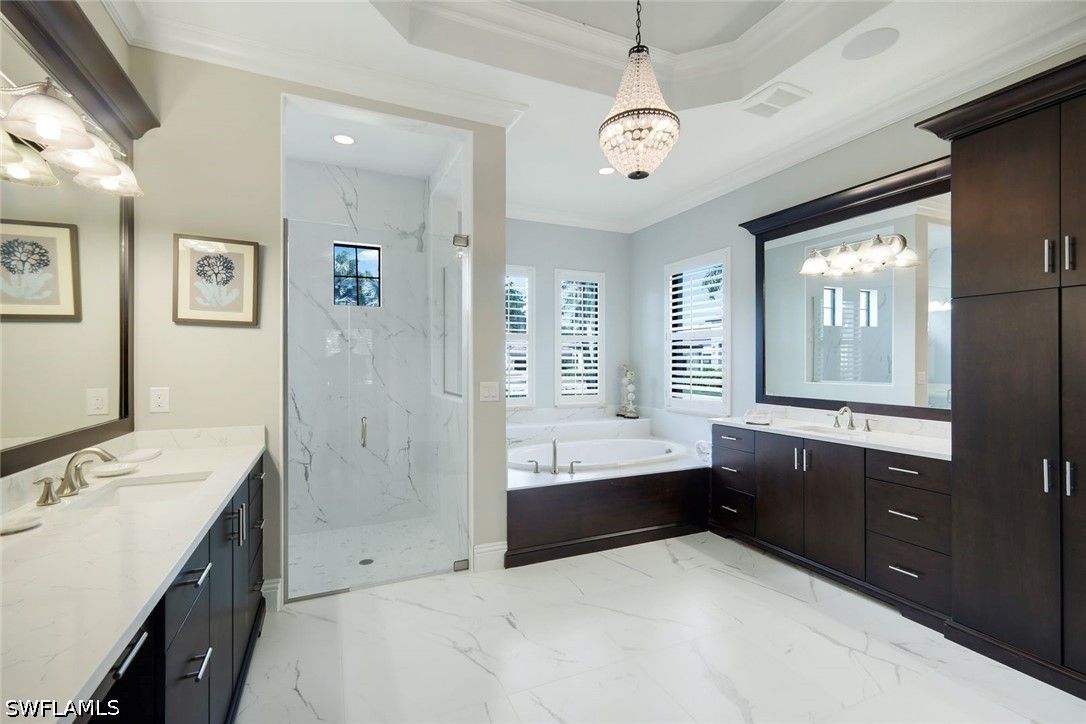 - Built-in Features, Bathtub, Closet Cabinetry, Coffered Ceiling(s), Separate/Formal Dining Room, Dual Sinks, Kitchen Island, Living/Dining Room, Separate Shower, Cable TV, Walk-In Closet(s), Window Treatments, Split Bedrooms