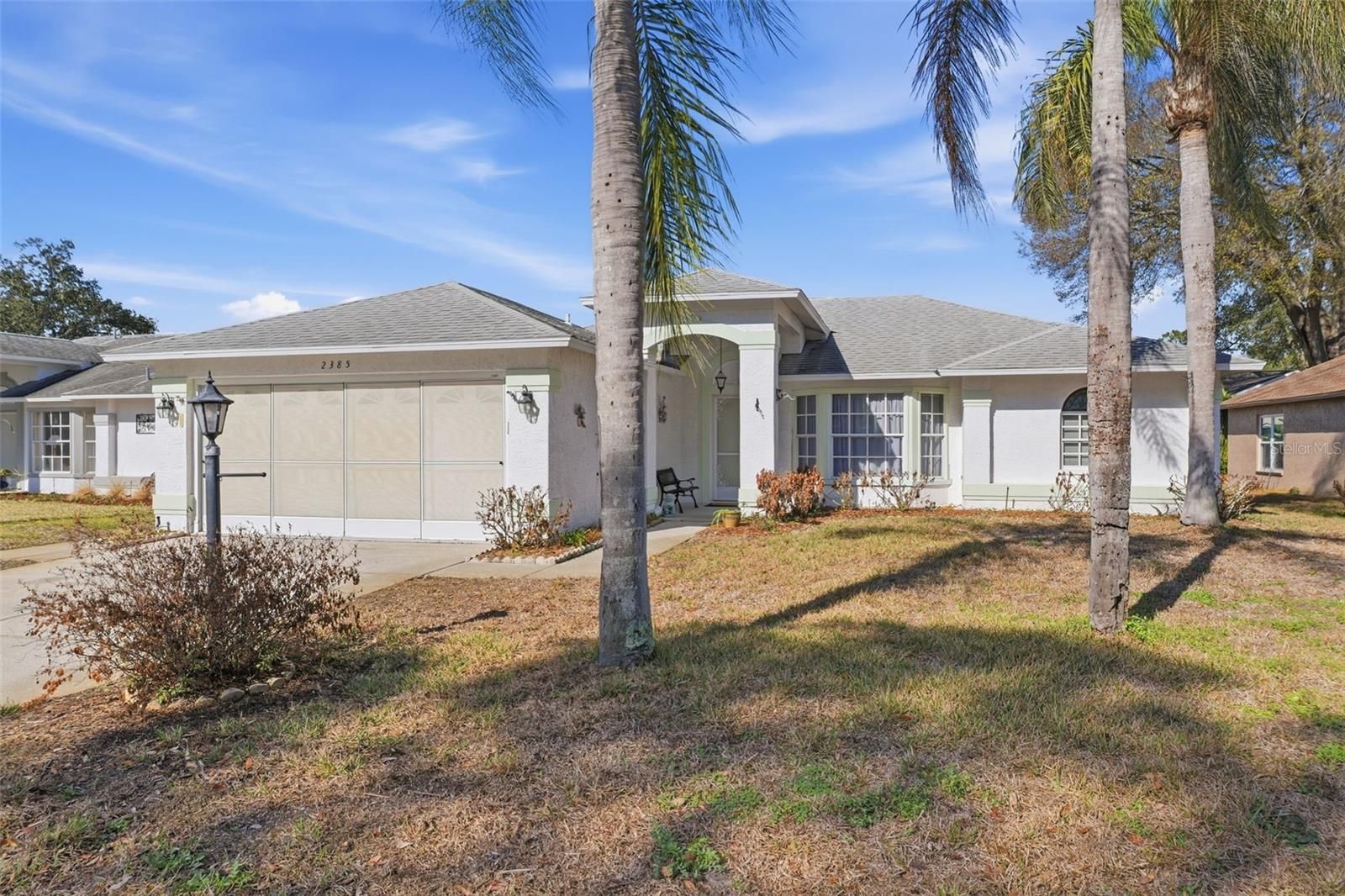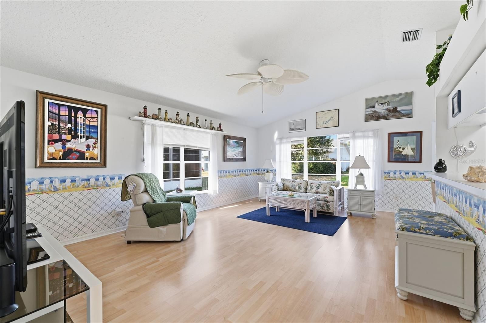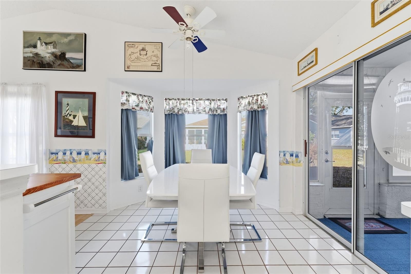 Located in the gated 55+ community of Timber Pines, this well-maintained 2-bedroom, 2-bath home with a 2-car garage offers comfortable living in one of Spring Hill’s most amenity-rich neighborhoods. The garage features convenient sliding screened doors, and a welcoming front walkway leads to a covered front porch. Inside, the foyer showcases tile and wood-look laminate flooring, opening into a spacious living and dining room combination with plush carpeting. The living room is highlighted by a dramatic floor-to-ceiling bay window that fills the space with natural light, while the dining area features two sliding glass doors that open directly to the expansive rear sunroom. The kitchen is bright and functional with white tile floors, white cabinetry, white countertops on three sides, recessed lighting, all-white appliances, and a double sink positioned beneath a passthrough that overlooks the family room. A cozy breakfast nook with bay windows offers views of the backyard and includes sliding glass doors leading to the sunroom. The adjacent family room features wood-look laminate flooring, large windows, cathedral ceilings shared with the kitchen, and an open bar-style connection to the opposite side of the kitchen, creating an easy flow between spaces. The primary suite offers wood-look laminate floors, multiple windows, dual walk-in closets, and an ensuite bath with white tile floors, dual white vanities, white cabinetry, a window for natural light, and a step-in shower with glass doors, built-in bench, built-in shelving, and grab bars on three walls. The second bedroom includes carpet, a window, and a built-in closet, while the guest bath features a charming white-and-pink motif with white tile floors, white cabinetry and tub, a pink vanity counter, and pink tile in the tub/shower combo with glass sliding doors. The laundry room is conveniently located next to the guest bath and includes a utility sink and overhead storage. The oversized sunroom offers carpeted floors, three walls of windows, two sets of sliding glass doors, and a passthrough window to the kitchen, creating a bright and versatile space for relaxing or entertaining. Timber Pines residents enjoy an exceptional array of amenities including four golf courses, a clubhouse with dining and year-round social events, multiple pools, tennis and pickleball courts, a fitness center, performing arts center, billiards room, walking paths, and 24-hour guarded gate access, along with a vibrant calendar of clubs and activities. Conveniently located in Spring Hill, this home is also near Weeki Wachee Springs State Park for kayaking in crystal-clear waters and Pine Island Beach Park for Gulf sunsets and waterfront relaxation, offering a lifestyle that blends comfort, recreation, and connection to nature.