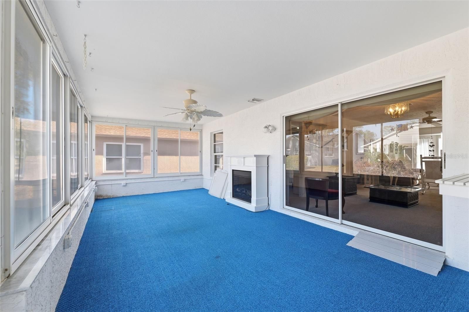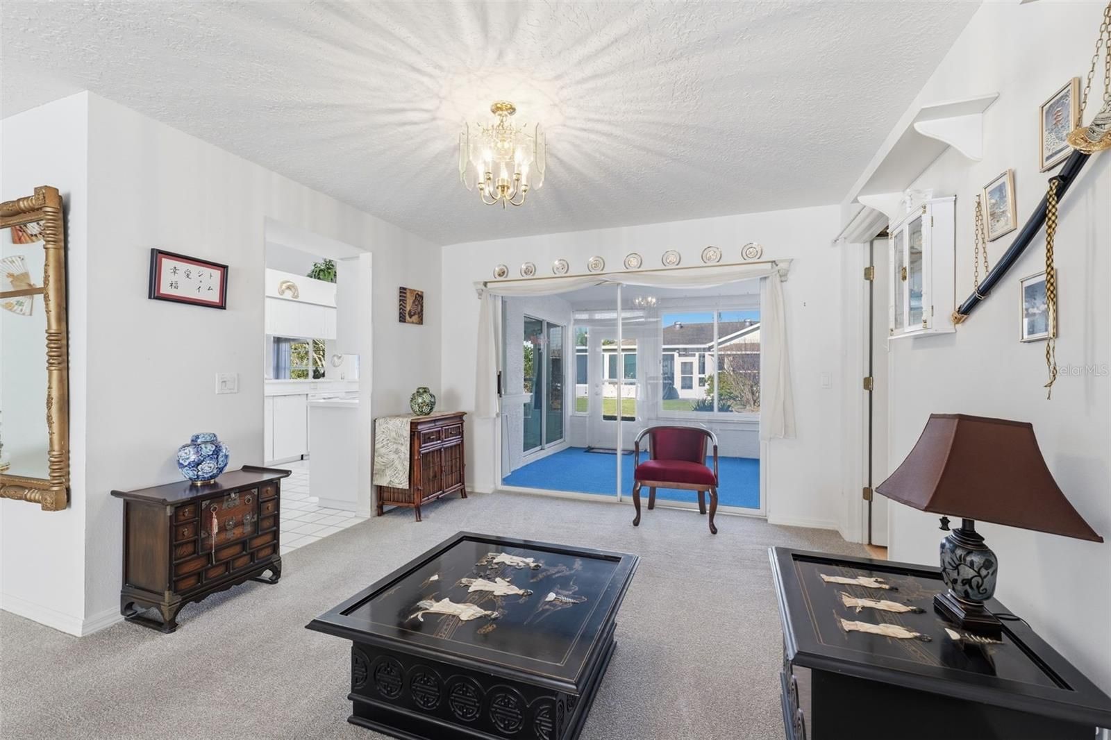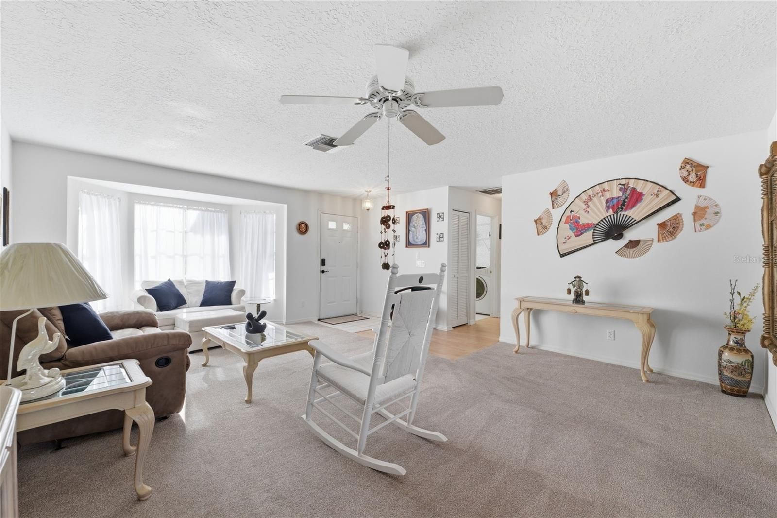 Located in the gated 55+ community of Timber Pines, this well-maintained 2-bedroom, 2-bath home with a 2-car garage offers comfortable living in one of Spring Hill’s most amenity-rich neighborhoods. The garage features convenient sliding screened doors, and a welcoming front walkway leads to a covered front porch. Inside, the foyer showcases tile and wood-look laminate flooring, opening into a spacious living and dining room combination with plush carpeting. The living room is highlighted by a dramatic floor-to-ceiling bay window that fills the space with natural light, while the dining area features two sliding glass doors that open directly to the expansive rear sunroom. The kitchen is bright and functional with white tile floors, white cabinetry, white countertops on three sides, recessed lighting, all-white appliances, and a double sink positioned beneath a passthrough that overlooks the family room. A cozy breakfast nook with bay windows offers views of the backyard and includes sliding glass doors leading to the sunroom. The adjacent family room features wood-look laminate flooring, large windows, cathedral ceilings shared with the kitchen, and an open bar-style connection to the opposite side of the kitchen, creating an easy flow between spaces. The primary suite offers wood-look laminate floors, multiple windows, dual walk-in closets, and an ensuite bath with white tile floors, dual white vanities, white cabinetry, a window for natural light, and a step-in shower with glass doors, built-in bench, built-in shelving, and grab bars on three walls. The second bedroom includes carpet, a window, and a built-in closet, while the guest bath features a charming white-and-pink motif with white tile floors, white cabinetry and tub, a pink vanity counter, and pink tile in the tub/shower combo with glass sliding doors. The laundry room is conveniently located next to the guest bath and includes a utility sink and overhead storage. The oversized sunroom offers carpeted floors, three walls of windows, two sets of sliding glass doors, and a passthrough window to the kitchen, creating a bright and versatile space for relaxing or entertaining. Timber Pines residents enjoy an exceptional array of amenities including four golf courses, a clubhouse with dining and year-round social events, multiple pools, tennis and pickleball courts, a fitness center, performing arts center, billiards room, walking paths, and 24-hour guarded gate access, along with a vibrant calendar of clubs and activities. Conveniently located in Spring Hill, this home is also near Weeki Wachee Springs State Park for kayaking in crystal-clear waters and Pine Island Beach Park for Gulf sunsets and waterfront relaxation, offering a lifestyle that blends comfort, recreation, and connection to nature.