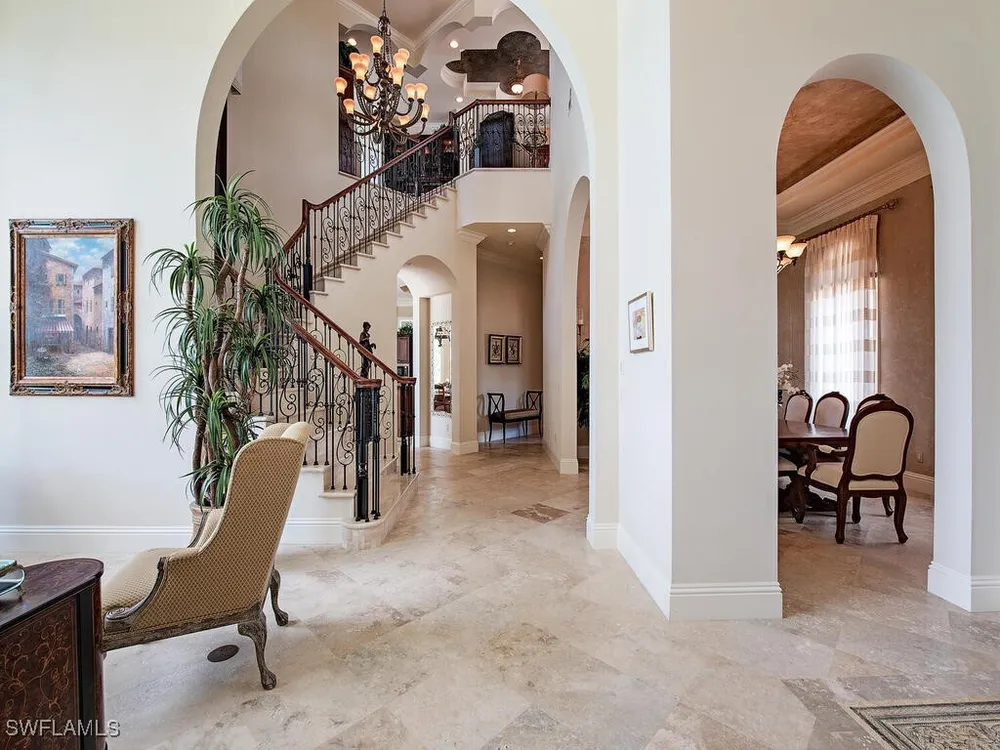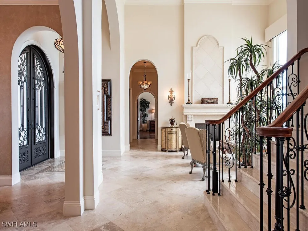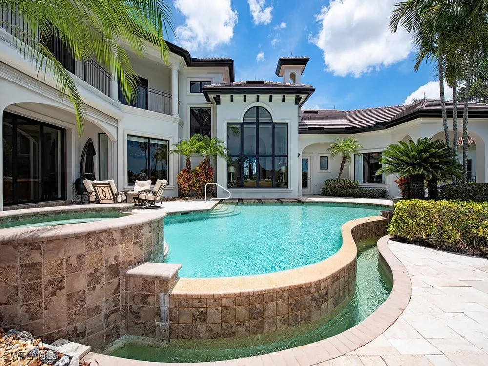 Exquisitely designed 2-story turnkey furnished estate home located in the exclusive enclave of Messina Ct within The Colony Golf and Bay Club. Constructed in 2005 to the meticulous standards of its original owners, this home occupies one of the most scenic Golf-view waterfront lots in The Colony. Boasting ceilings up to 20 ft and expansive floor-to-ceiling windows, it offers breathtaking views over the infinity pool and patio, spanning three fairways, the Country Club, and the 18th hole with its iconic fountain—presenting a unique southwest Florida vista with no neighboring homes in sight. The home showcases premium details including hurricane impact windows and doors, marble and wood floors, a marble staircase, expansive zero-corner pocketing sliders, 4-bedroom suites, 5.5 baths including a lavish pool bath, electric hurricane shutters, electric lanai screens, an outdoor linear fireplace, and a 3-car plus separate Golf Cart garage. In 2023, the exterior was refreshed with light paint and a new flat tile roof with dark gutters, offering contemporary curb appeal. The Chef’s oversized kitchen features Wolf and Subzero appliances, a six-burner gas range, 3 ovens, and multiple prep areas. The primary suite includes custom closets, a floating tub, and a fully glassed-in garden shower area encircled by a walled courtyard for privacy. The second level ensures ultimate guest privacy with 3 ensuite bedrooms, a large gathering area with a beverage fridge and coffee bar, and access to a private balcony. Living at The Colony grants access to the newly renovated private waterfront Bay Club.with two levels of dining and also access to Pelican Landing’s private 34-acre island beach and pavilion. Golf is optional at The Colony Country Club. High and dry location, not flood zone.