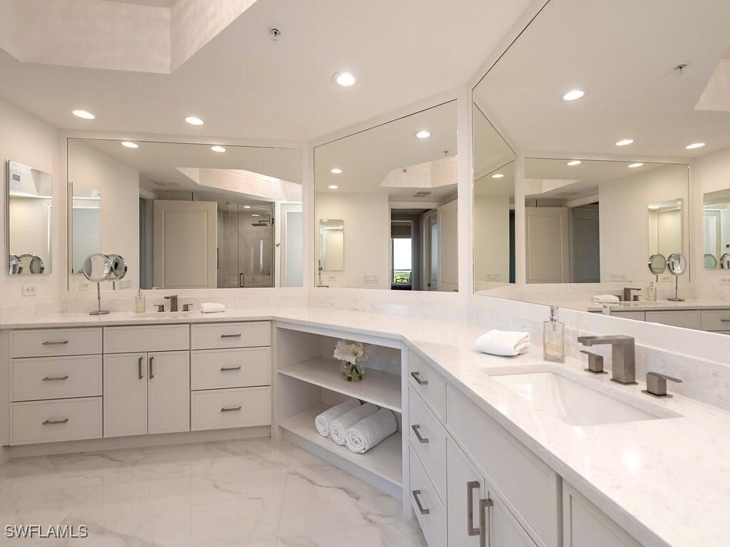 Welcome to effortless luxury in this beautifully updated 4th-floor residence at Florencia in The Colony Golf & Bay Club. Offering 3 bedrooms and 3 baths, this light-filled home features an open, airy layout ideal for both relaxed living and entertaining. Expansive living and dining areas flow seamlessly to a spacious screened lanai—perfect for morning coffee, evening cocktails, and taking in sweeping views of the Florencia pool, The Colony Golf Course, Estero Bay, and breathtaking Gulf sunsets. The kitchen has been thoughtfully updated with quartz countertops and a mirrored backsplash, creating a fresh, contemporary space ideal for cooking and gathering. The spacious primary suite is a true retreat, highlighted by a completely renovated primary bath with quartz-topped vanities, porcelain flooring and shower, all-new fixtures, and a redesigned layout where the soaking tub has been removed to provide additional counter space and storage—both elegant and highly functional. Two guest rooms, 1 ensuite, the other doubles as bedroom 3 or Den and has access to nearby full bath, both share the East facing open balcony with stunning sunrise views. Unit 403 is tastefully decorated and furnished in a sophisticated, transitional style, with most furnishings negotiable with the purchase, allowing you to begin enjoying the Florida lifestyle immediately. Florencia residents also enjoy a resort-style amenity deck with pool, spa, fitness center, two private guest suites and social spaces. Colony Residents enjoy a lifestyle few communities can match. Golf is optional, with golf in waiting options available at both The Colony Golf Club and The Nest at Pelican Landing. A private 34-acre island beach park is reached by boat shuttle, where chairs and umbrellas await you and your guests. Owners enjoy access to the Colony Bay Club with two levels of waterfront dining, a kayak park at both The Colony and Pelican Landing and other outstanding recreational amenities including pickleball, bocce and a children’s playground, plus 12 tennis courts at Pelican Landing (6 more optional at The Colony Golf Club). Ideally located near world-class beaches, Coconut Point, fine dining, and Southwest Florida International Airport—this is refined coastal living at its finest.