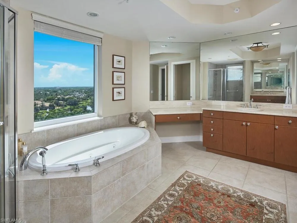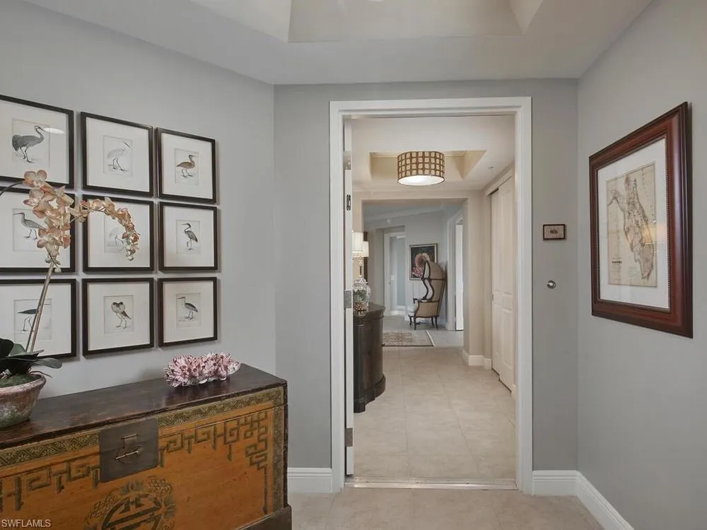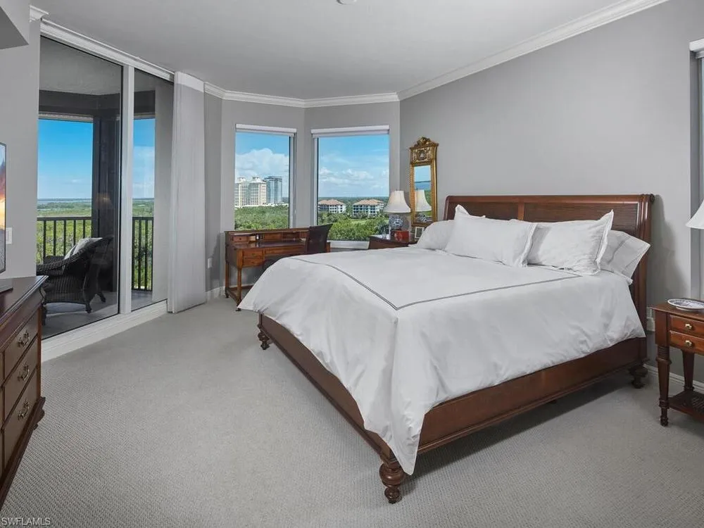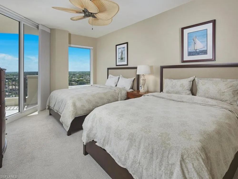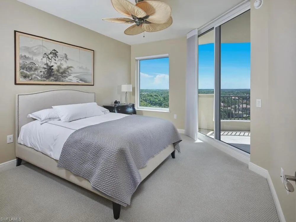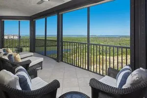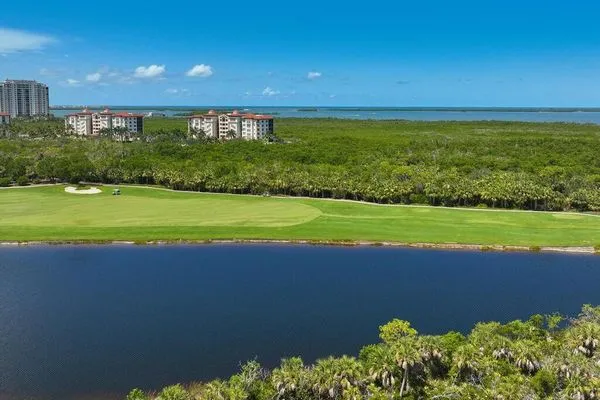 Experience elevated living in The Colony's Florencia tower—one of Southwest Florida’s most exclusive and amenity-rich high-rises. Step from your private elevator lobby into this sophisticated 8th-floor corner residence, offering breathtaking panoramic views of the golf course, lake, Estero Bay, and the Gulf of Mexico.Enjoy awe-inspiring sunsets from the expansive screened lanai, where indoor-outdoor living reaches new heights. The light-filled primary suite features floor-to-ceiling picture windows and direct lanai access, while the spa-inspired bath is bathed in natural light and designed for serenity.A thoughtfully designed split-bedroom layout ensures privacy for both owners and guests, den opens to the main living area through elegant double doors and features a private balcony—perfect place to enjoy morning coffee! Spacious guest suites share a third balcony overlooking a lake and the Colony community.The abundant kitchen impresses with lots of countertop space, rich wood cabinetry, and stainless steel appliances.Florencia welcomes you with an impressive main lobby and offers a host of upscale amenities, including a social room, private theater, state-of-the-art fitness center, and resort-style pool/spa. A dedicated privacy officer greets you and your guests, while live-in management ensures seamless service and peace of mind. Community amenities include the Bay Club on Estero Bay with elegant dining and views, a 34-acre private island beach park and community/tennis center as well as a host of other court sports including pickle ball and bocce, sailing, canoe and kayaking, as well. Golf is optional.