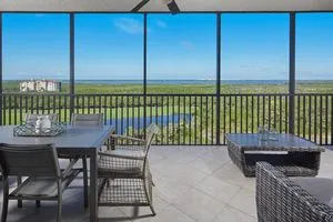 Enjoy breathtaking sunset views over Estero Bay and the Gulf of Mexico while sipping your evening cocktail from the spacious lanai of this ideal eighth-floor residence in Florencia at The Colony.On clear mornings, sip your first cup of coffee while taking in the serene beauty of the emerald green fairways of The Colony Golf Course.Designed with a unique layout that lives like an end residence, this home welcomes you with a private elevator opening directly into the unit, where stunning views greet you the moment you arrive. The spacious floor plan offers flexibility for hosting guests or working from home, with the guest quarters thoughtfully separated from the primary suite.Wake up each morning in the primary bedroom to panoramic vistas—and unwind in comfort knowing the suite features a handicap-accessible shower, blending luxury with convenience and thoughtful design.Offered furnished with just a few exceptions, this home is move-in ready. Whether relaxing or entertaining, the oversized lanai provides the perfect backdrop for every occasion.Large laundry room with sink and storage. Your daily workout is a few flights down and a community room and movie theater offer a respite from the occasional afternoon rain! Take a swim in the resort-style pool, and offer overflow guests access to two guest suites. Leave for the summer, knowing you are secure with onsite management. Residents of The Colony enjoy a 34-acre beach park, tennis, pickleball, canoe, kayak, and a community fitness center, as well as The Bay Club, overlooking Estero Bay, offering an exceptional dining experience. The gated community of Pelican Landing including the Colony, has two elective golf club options. Close to dining, entertainment, and a short 20-minute drive to SWFL International Airport.