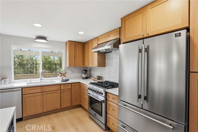 On a quiet cul-de-sac in the desirable 55+ community of Casta del Sol sits the sophisticated, low-maintenance luxury home 23862 Villena. This move-in-ready single-story residence blends modern elegance with privacy and city light sunset views. The open floor plan features luxurious LVP flooring with no interior steps, elegant white oak shaker cabinetry, a massive white oak peninsula, a premium Forno kitchen appliance suite, a sleek modern electric fireplace, recessed lighting, and designer fixtures throughout. The primary suite offers a spa-like bathroom with custom tile surrounds in the shower and tub, plus furniture-quality vanity cabinetry. Plantation shutters, dual-pane windows, an energy-efficient newer water heater, and a newer HVAC system ensure year-round comfort. New solid core doors throughout and the home was previously re-piped with copper. Enjoy a very private setting with a alumawood covered rear patio with vinyl patio gates, a 2-car pavered driveway, and an expansive HOA-maintained back yard. The direct access garage features fresh paint and a new epoxy floor. Lake Mission Viejo membership adds access to sailing, fishing, beaches, and nearby events. This turn-key, high-end renovated home in secure Casta del Sol is ideal for discerning buyers seeking timeless style